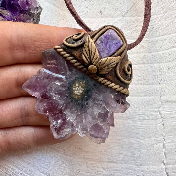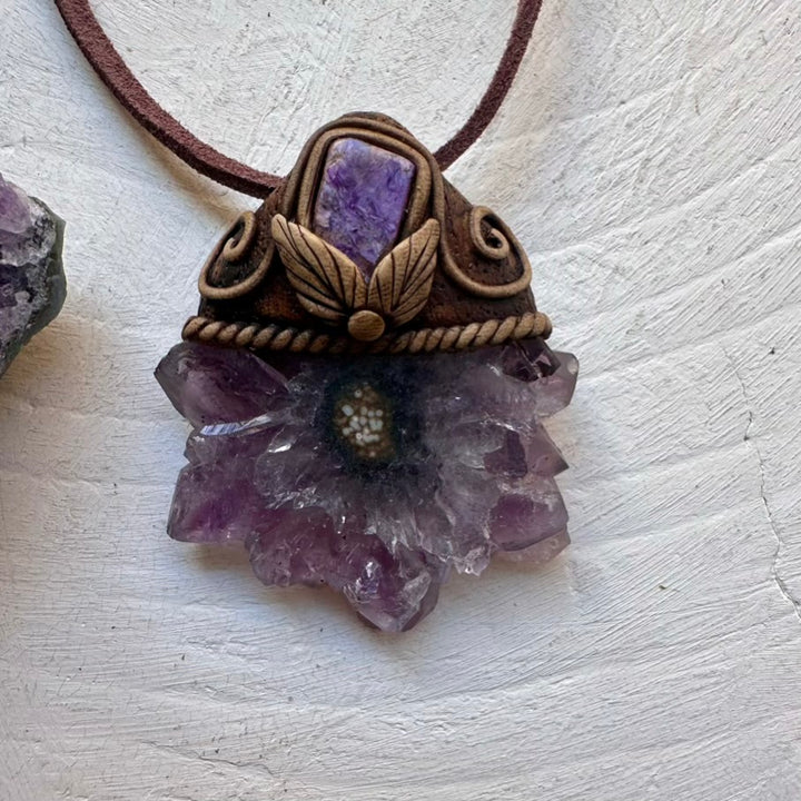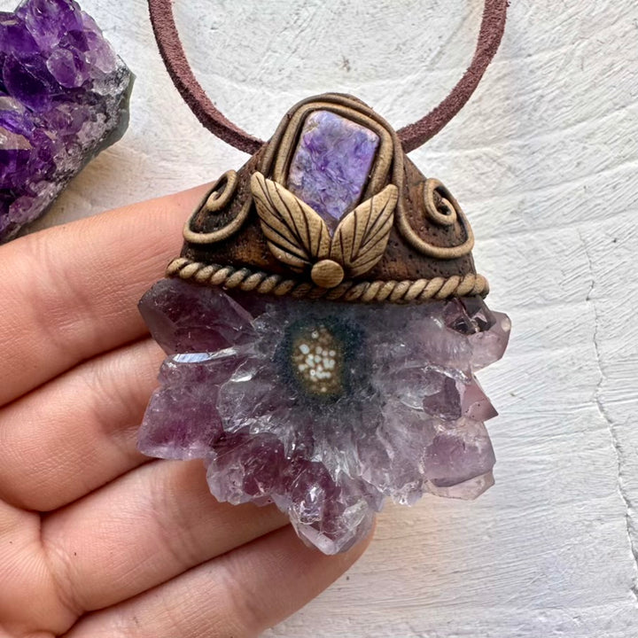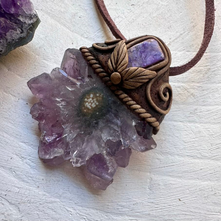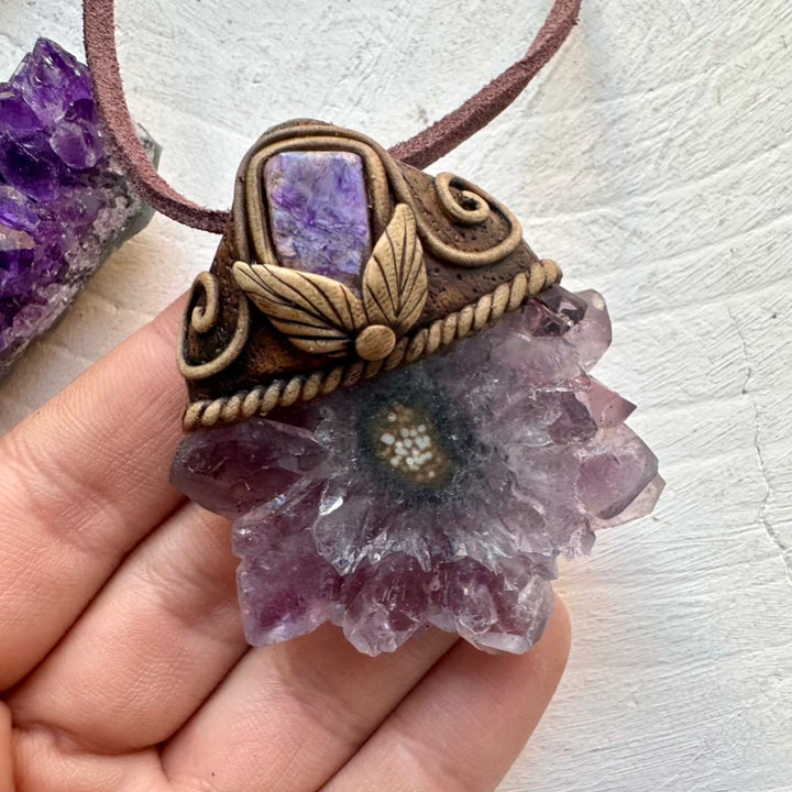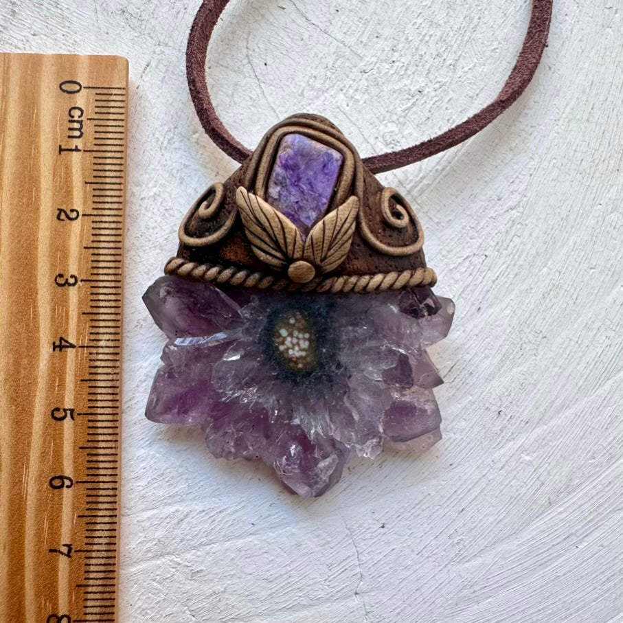 The Amethyst Stalactite and Charoite Necklace, Healing Crystal Jewelry is made with durable clay and it comes with an adjustable leather cord.