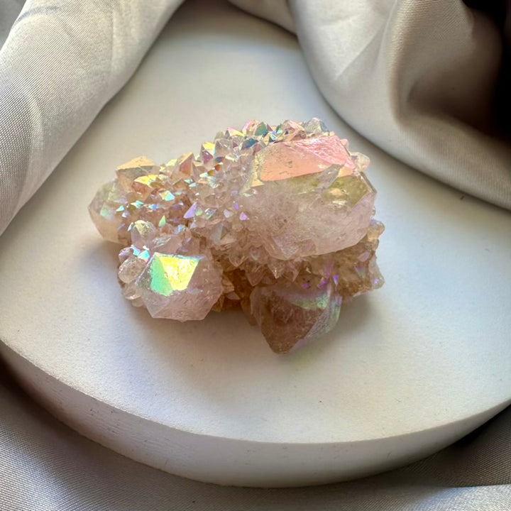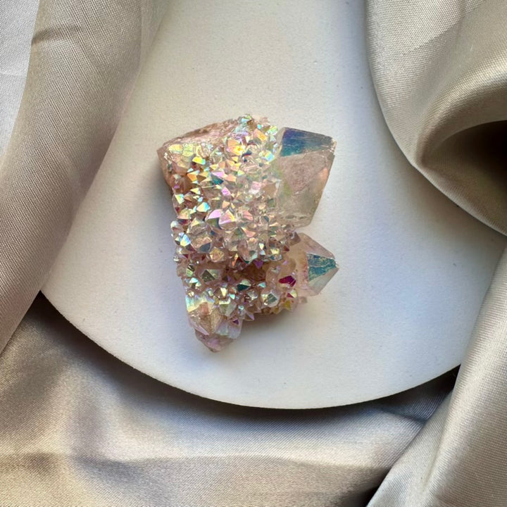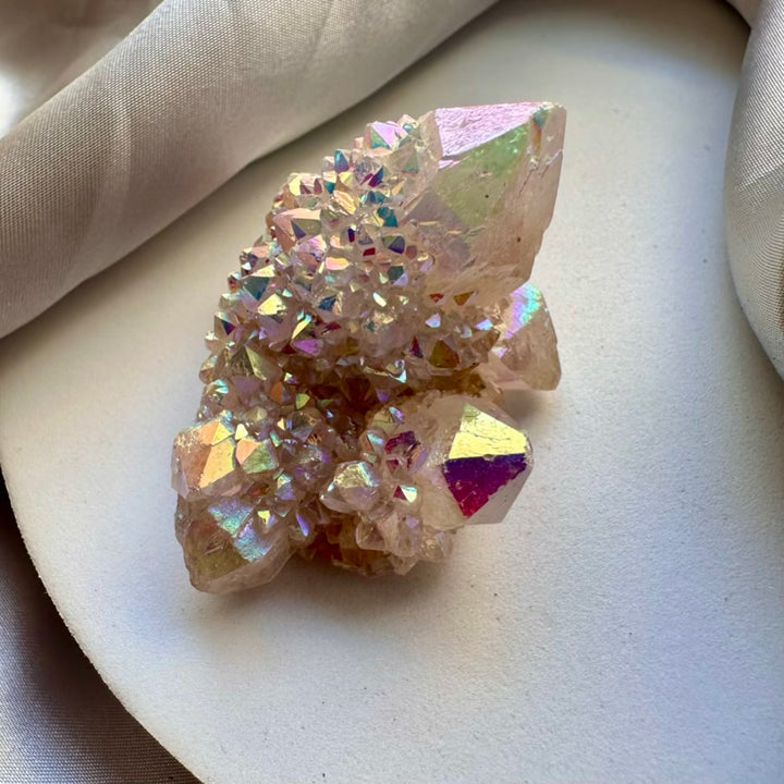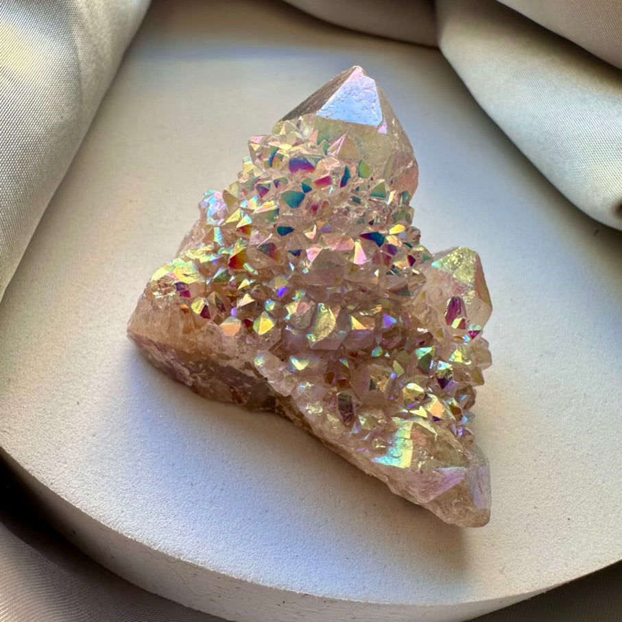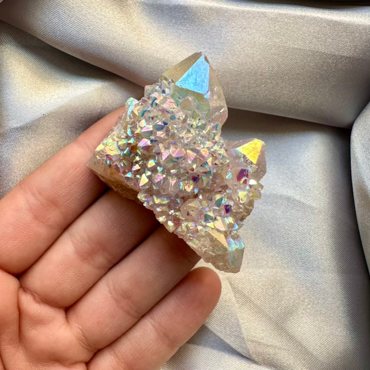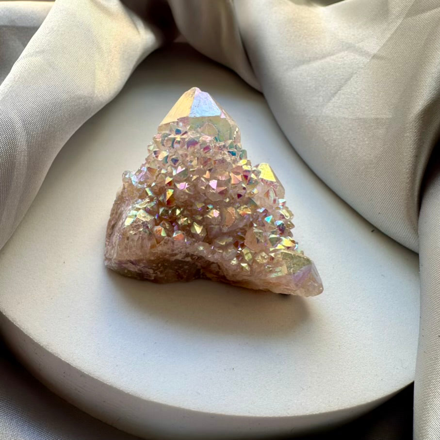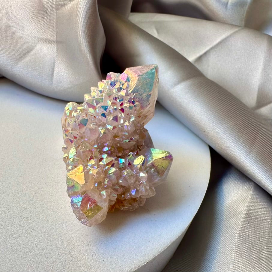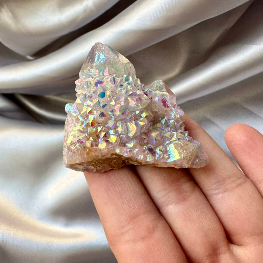 Experience the ethereal beauty of the Angel Aura Spirit Quartz Cluster, a premium natural quartz crystal celebrated for its vibrant rainbow shimmer and high-vibration healing energy. Each cluster is ethically sourced and naturally formed, then lightly infused with precious metals like platinum and silver to enhance its celestial iridescence. The result is a radiant, multidimensional gemstone that emanates peace, positivity, and spiritual awakening — a true treasure for crystal collectors, energy healers, and meditation lovers.