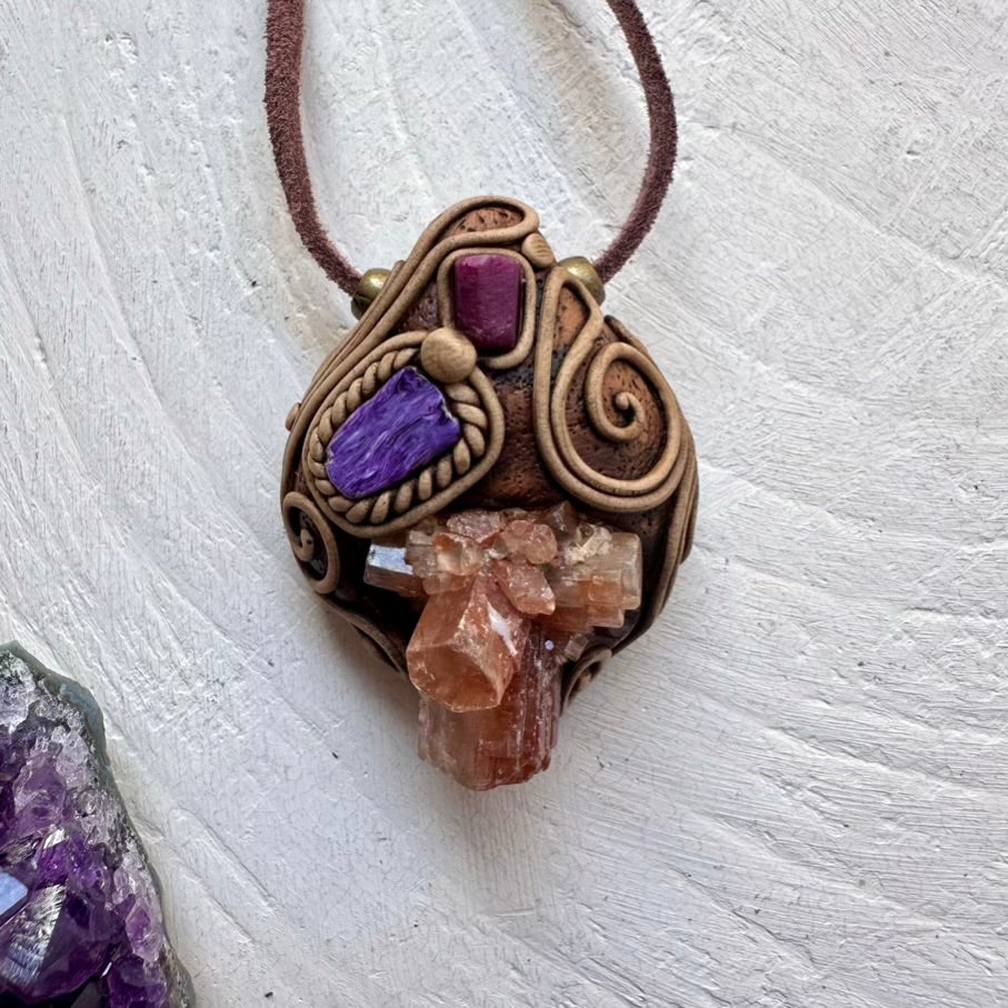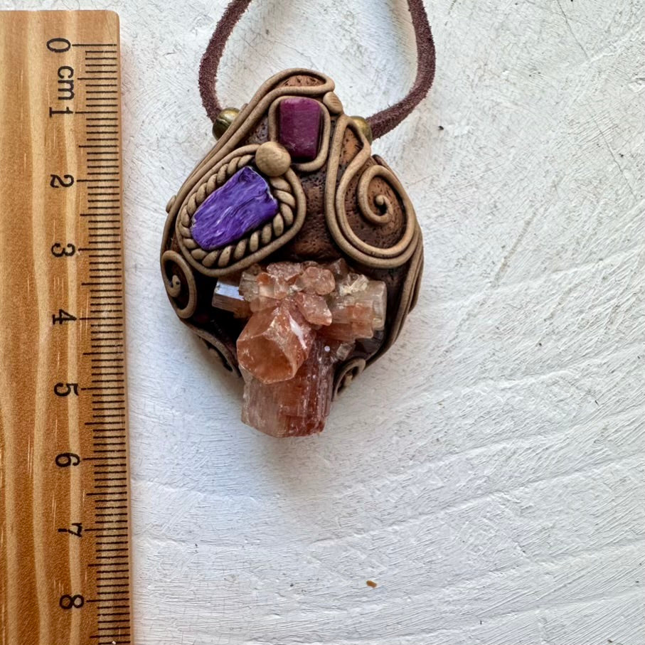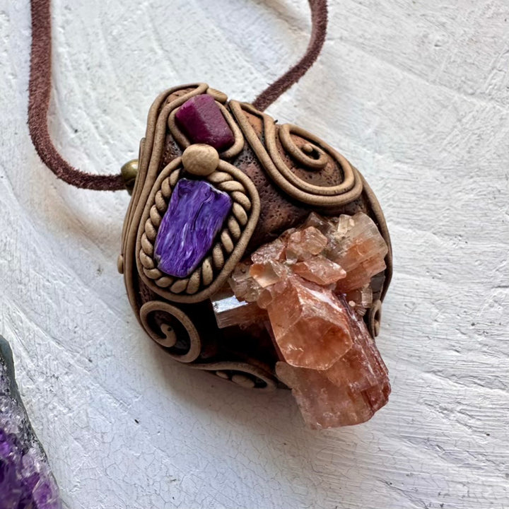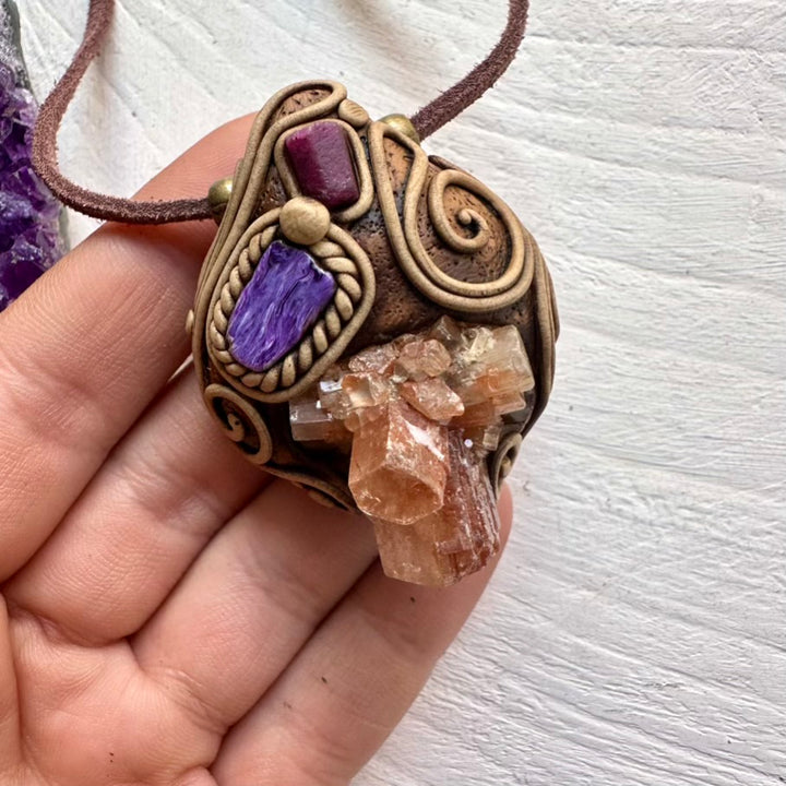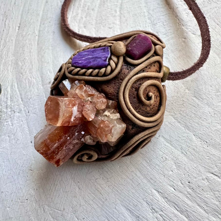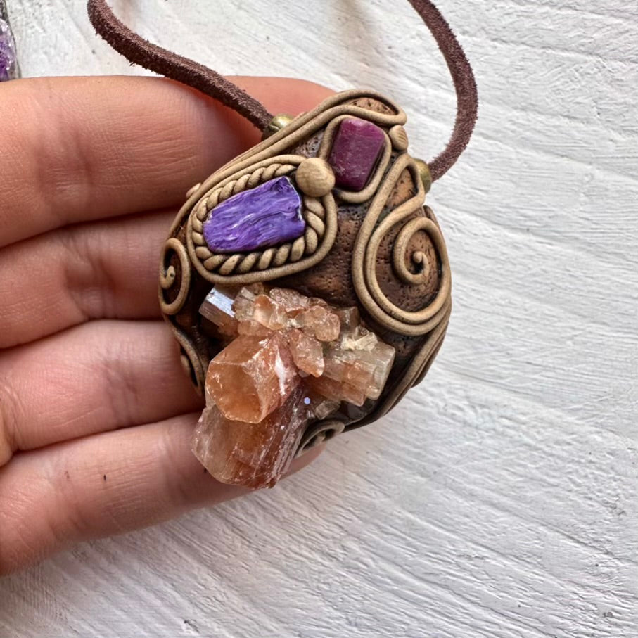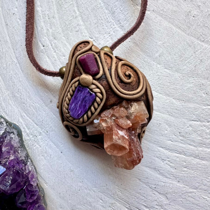 The Aragonite Charoite and Ruby Necklace, Handmade Crystal Jewelry is made with durable clay and it comes with an adjustable leather cord.