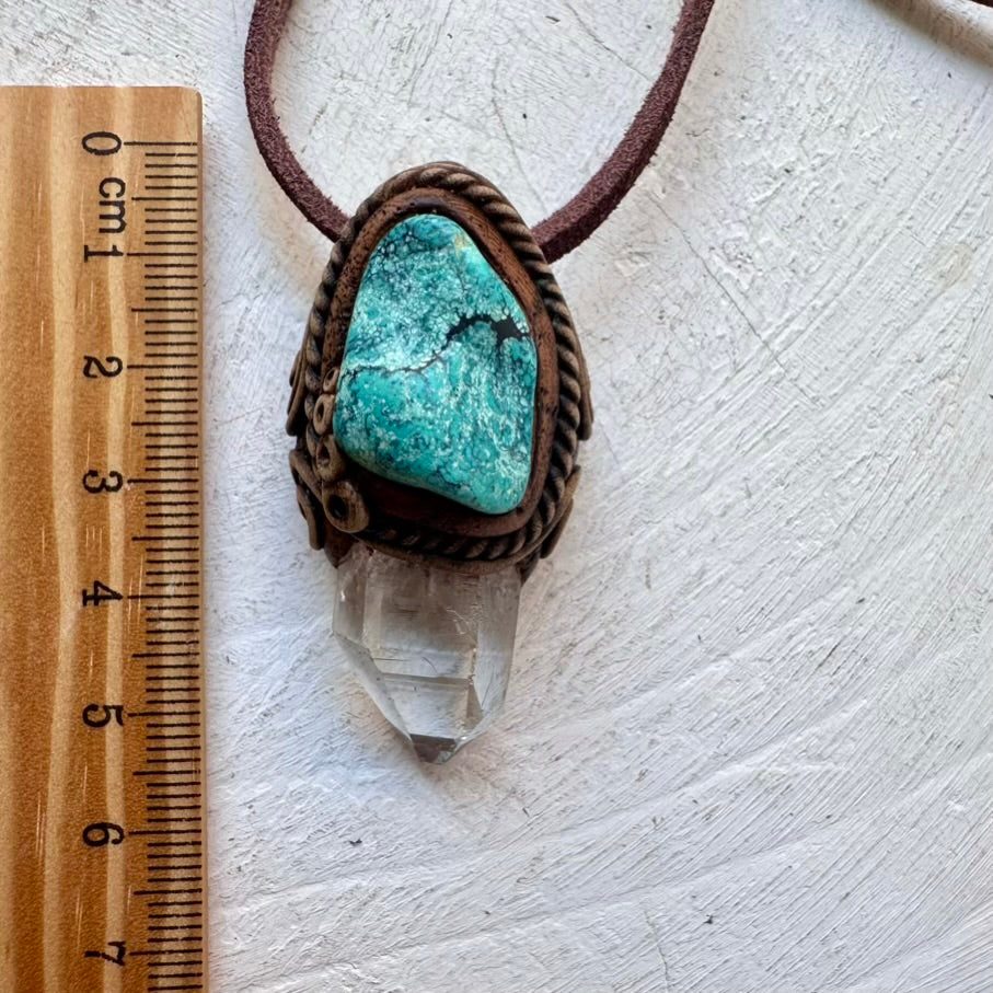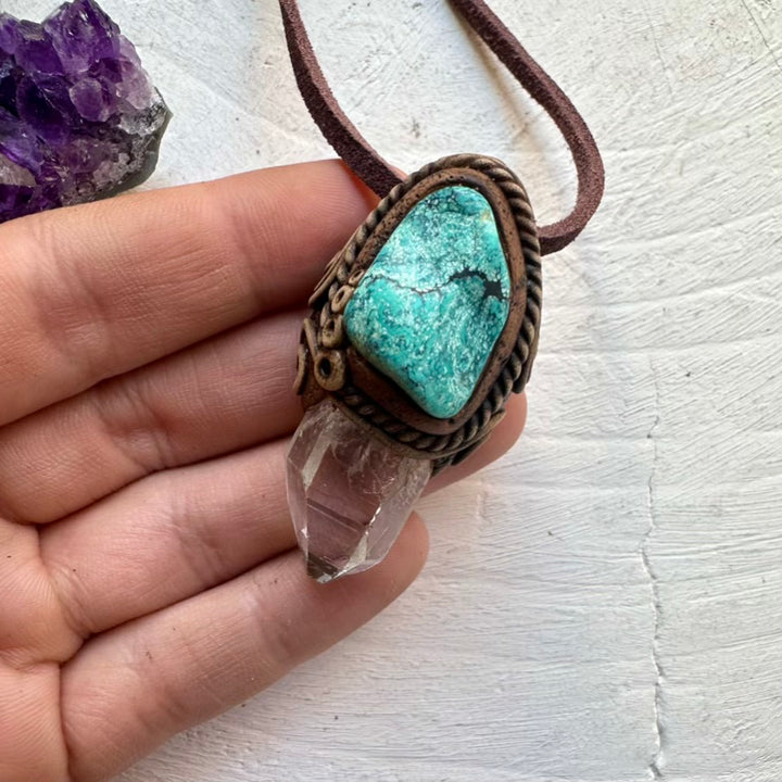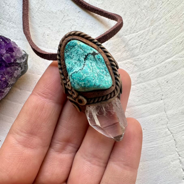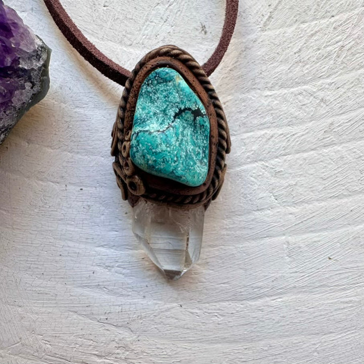 The Clear Quartz and Turquoise Necklace is made with durable clay and it comes with an adjustable leather cord.