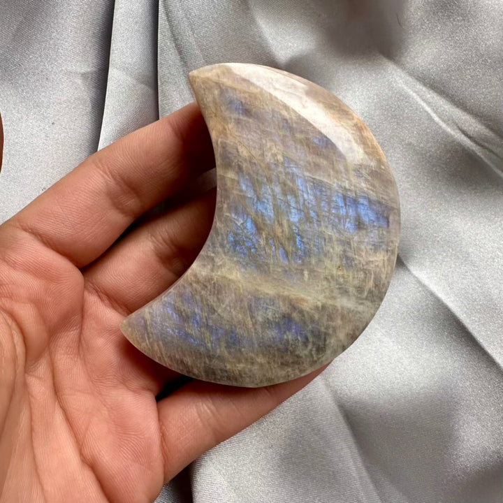 Experience the mystical glow of our Moonstone Moon Shaped Crystal, a stunning natural gemstone that captures the tranquil energy of the moon. The crystal moon is formed from high-quality Moonstone, admired for its luminous play of light and ethereal hues of blue. The moon shape reflects the beauty of lunar cycles and symbolizes intuition, renewal, and emotional harmony.