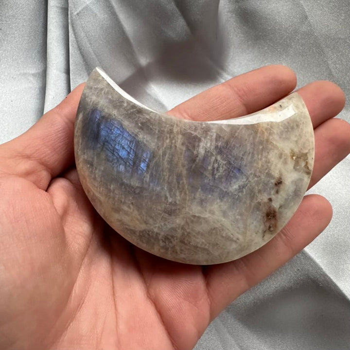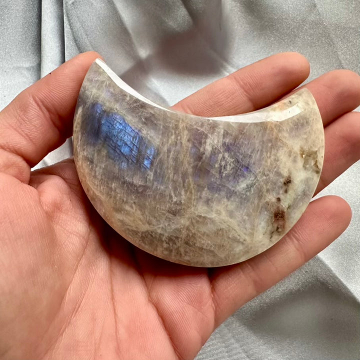 Experience the mystical glow of our Moonstone Moon Shaped Crystal, a stunning natural gemstone that captures the tranquil energy of the moon. The crystal moon is formed from high-quality Moonstone, admired for its luminous play of light and ethereal hues of blue. The moon shape reflects the beauty of lunar cycles and symbolizes intuition, renewal, and emotional harmony.