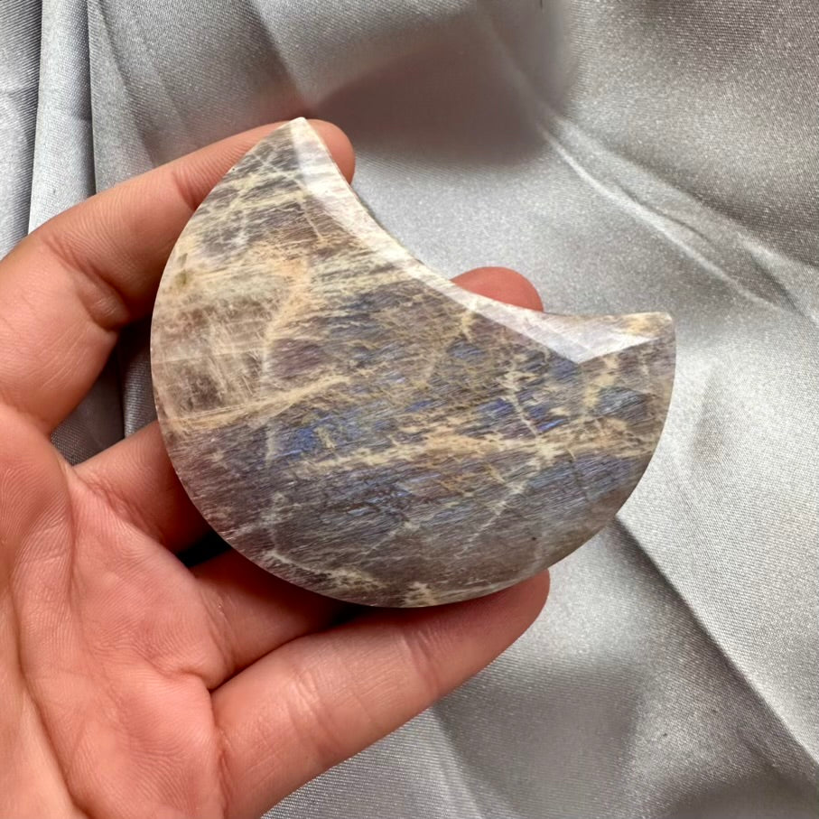 Experience the mystical glow of our Moonstone Moon Shaped Crystal, a stunning natural gemstone that captures the tranquil energy of the moon. The crystal moon is formed from high-quality Moonstone, admired for its luminous play of light and ethereal hues of blue. The moon shape reflects the beauty of lunar cycles and symbolizes intuition, renewal, and emotional harmony.