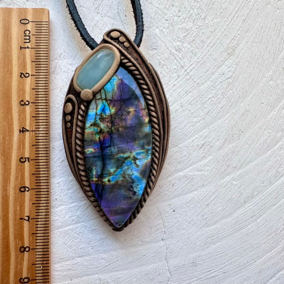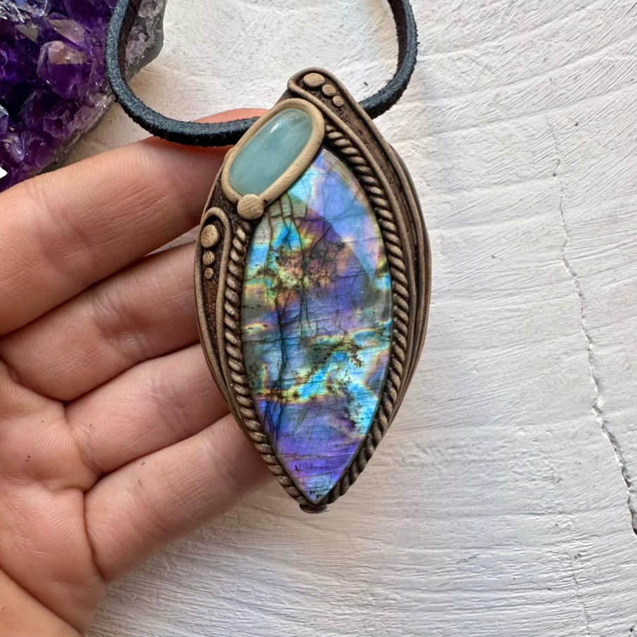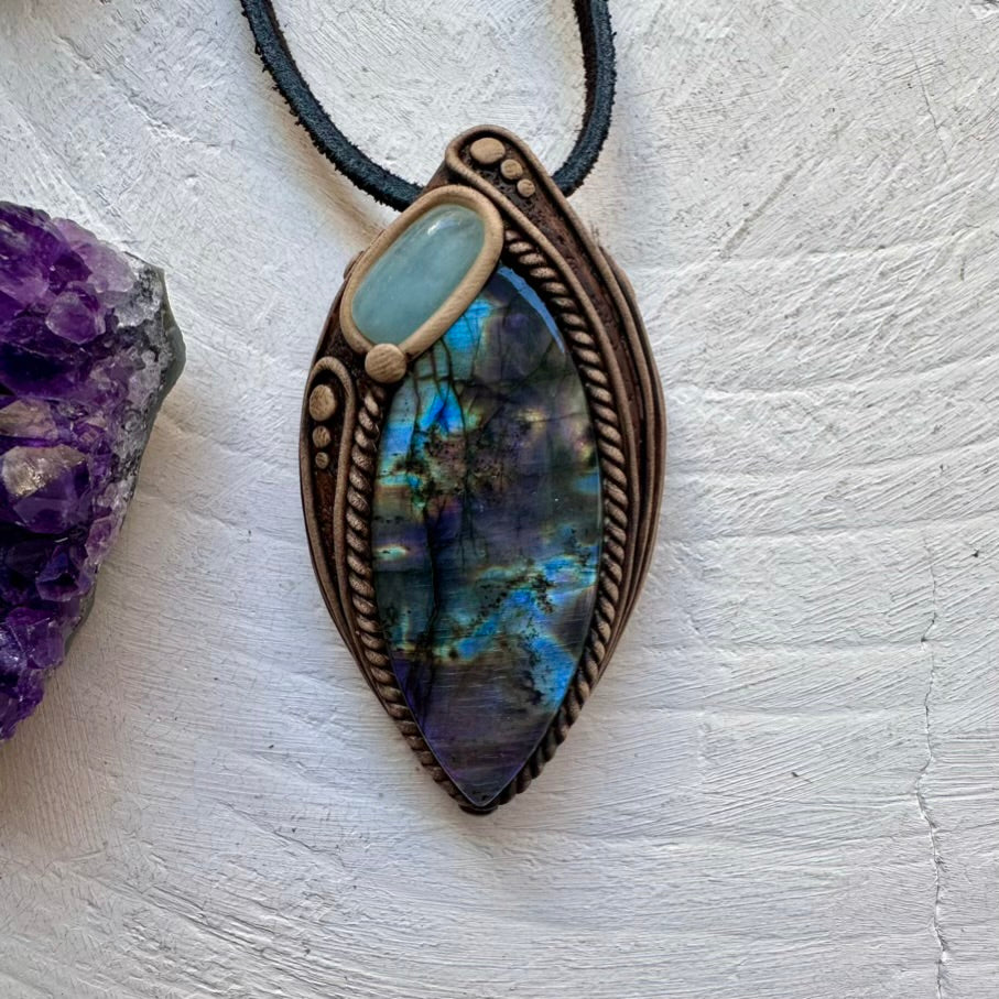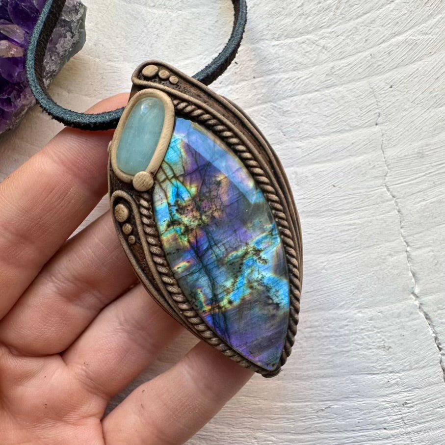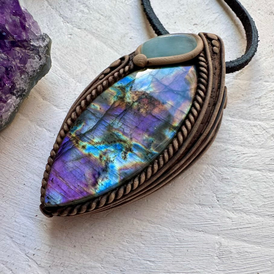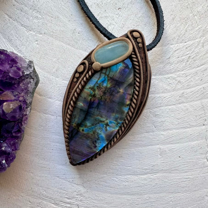 The Purple Labradorite and Aquamarine Necklace is made with durable clay and it comes with adjustable leather cord.