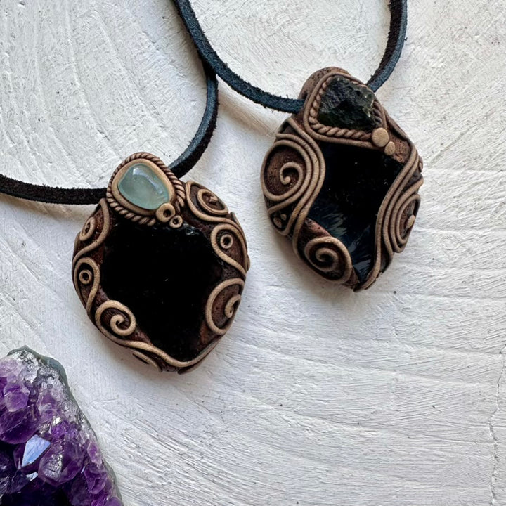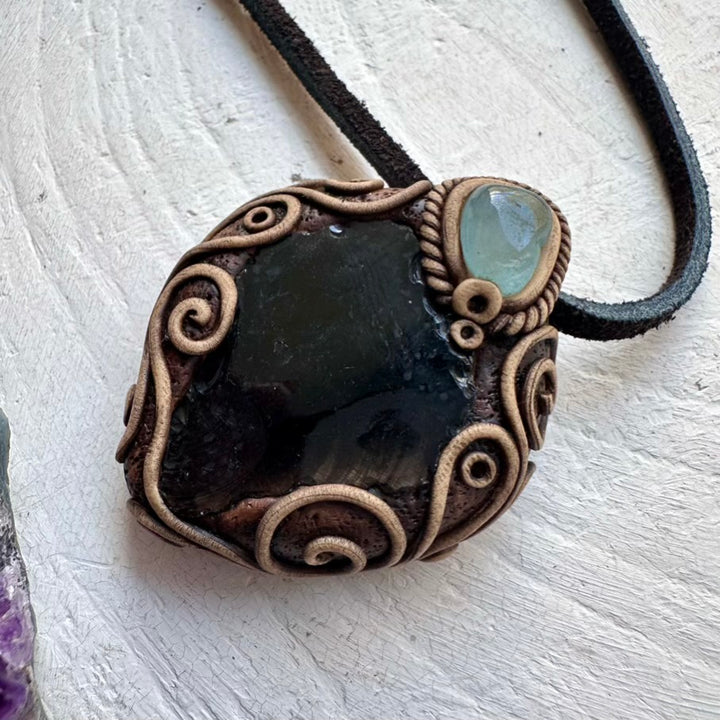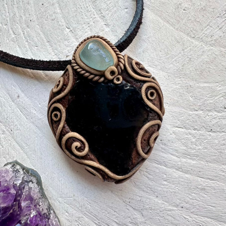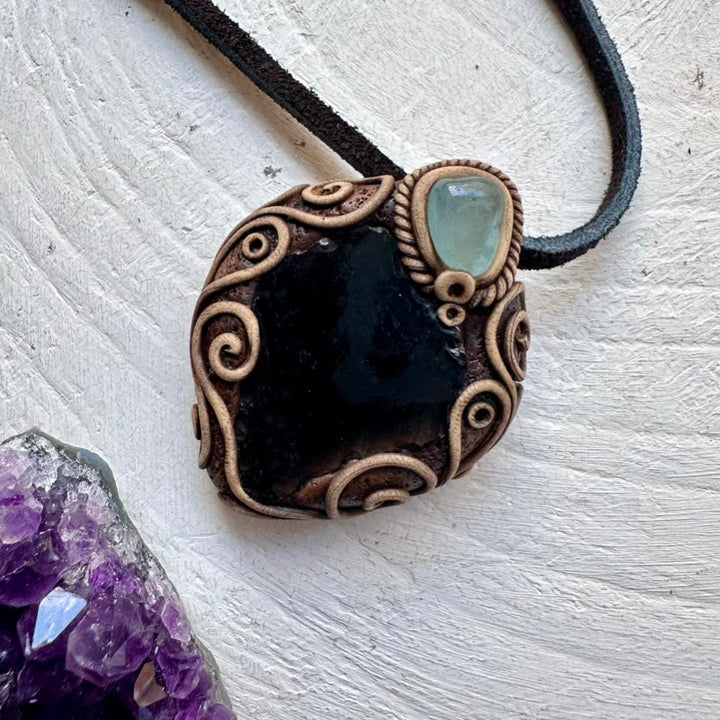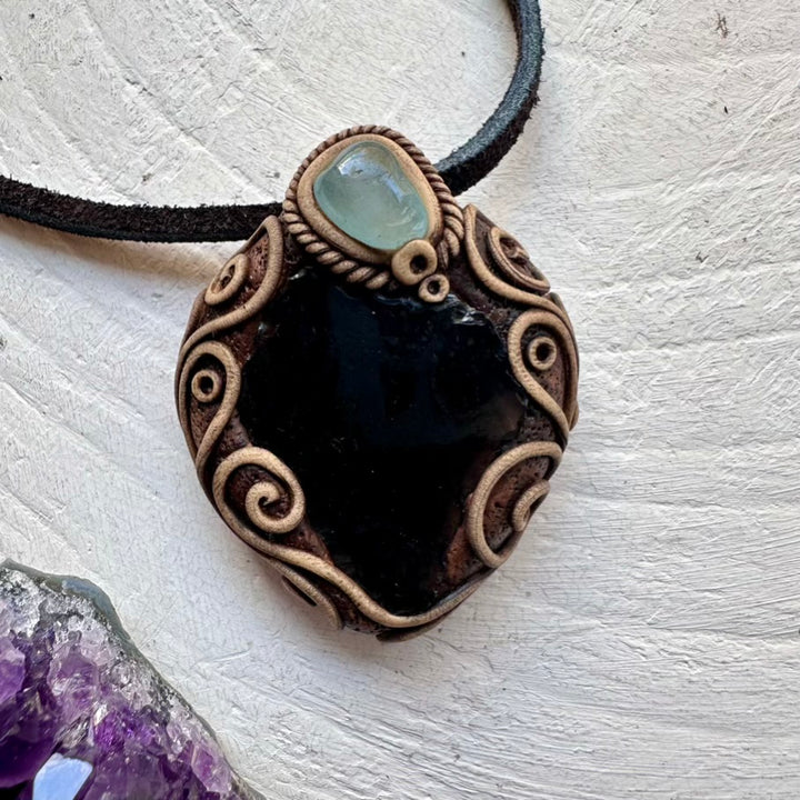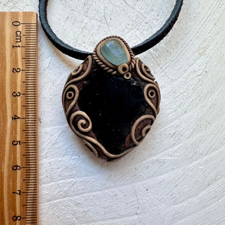 The Raw Black Obsidian and Aquamarine Necklace is made with durable clay and it comes with an adjustable leather cord.