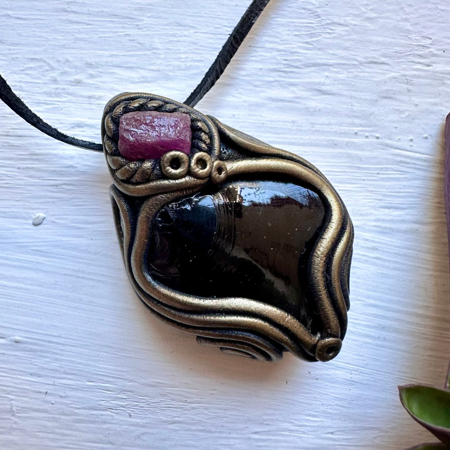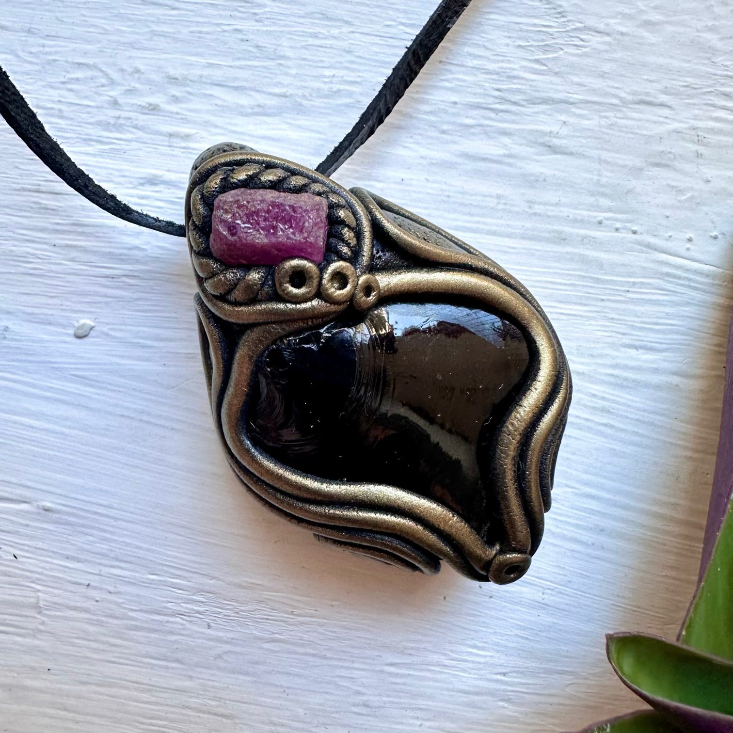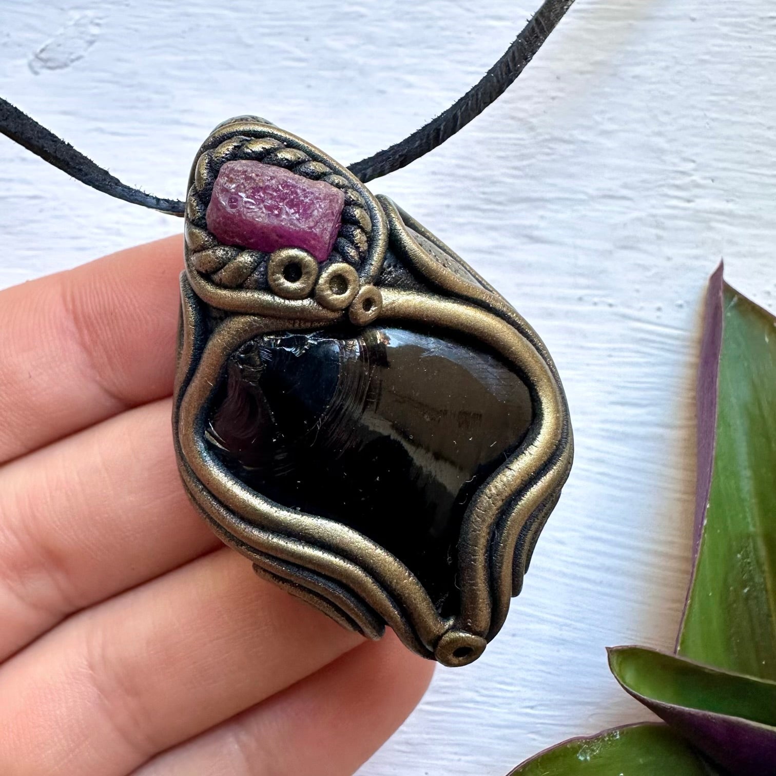 The Raw Black Obsidian and Ruby Necklace is made with durable clay and it comes with an adjustable leather cord.