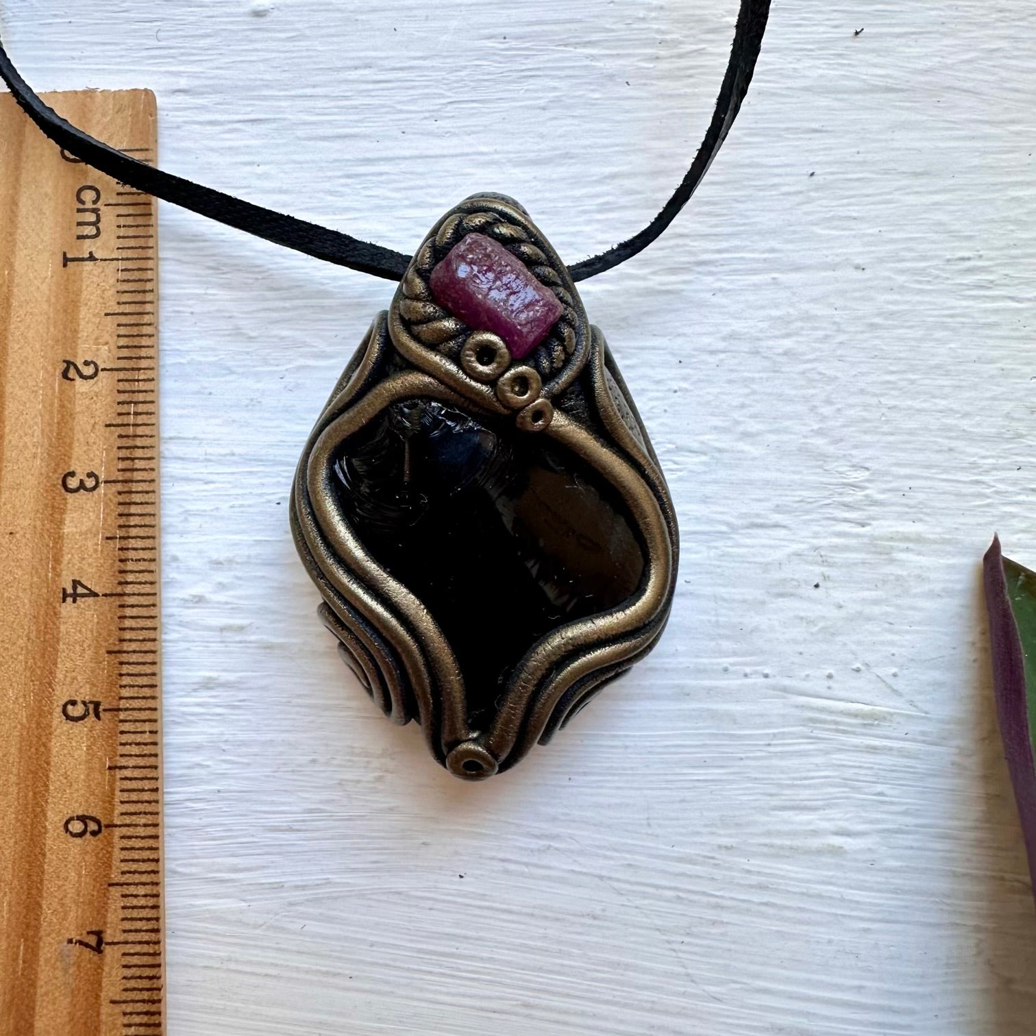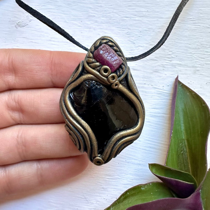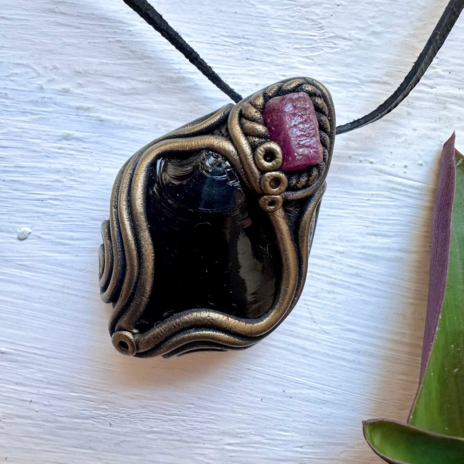The Raw Black Obsidian and Ruby Necklace is made with durable clay and it comes with an adjustable leather cord.