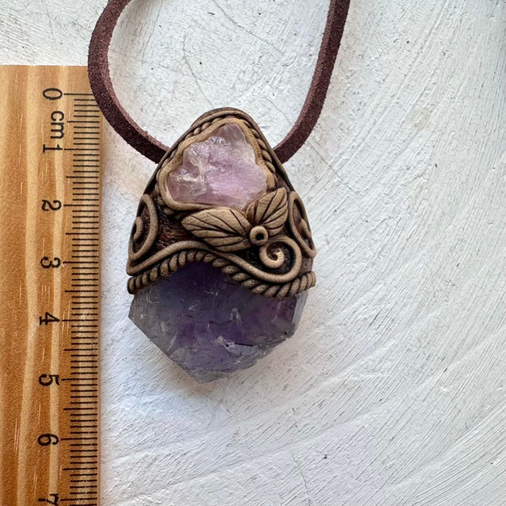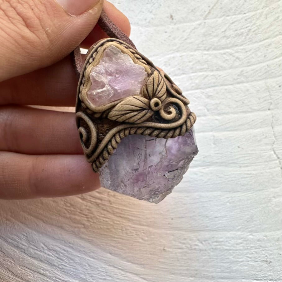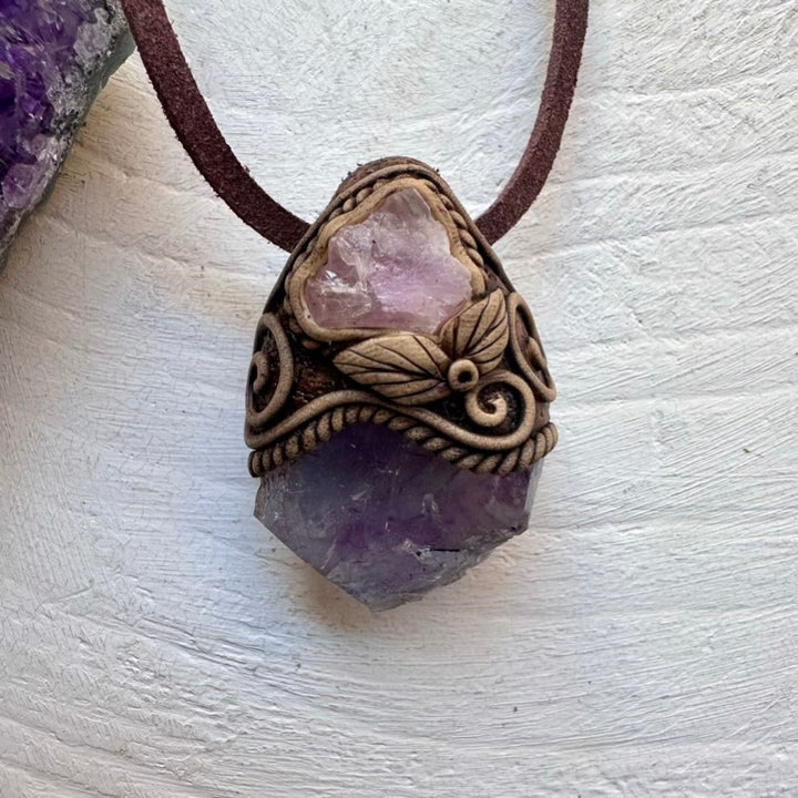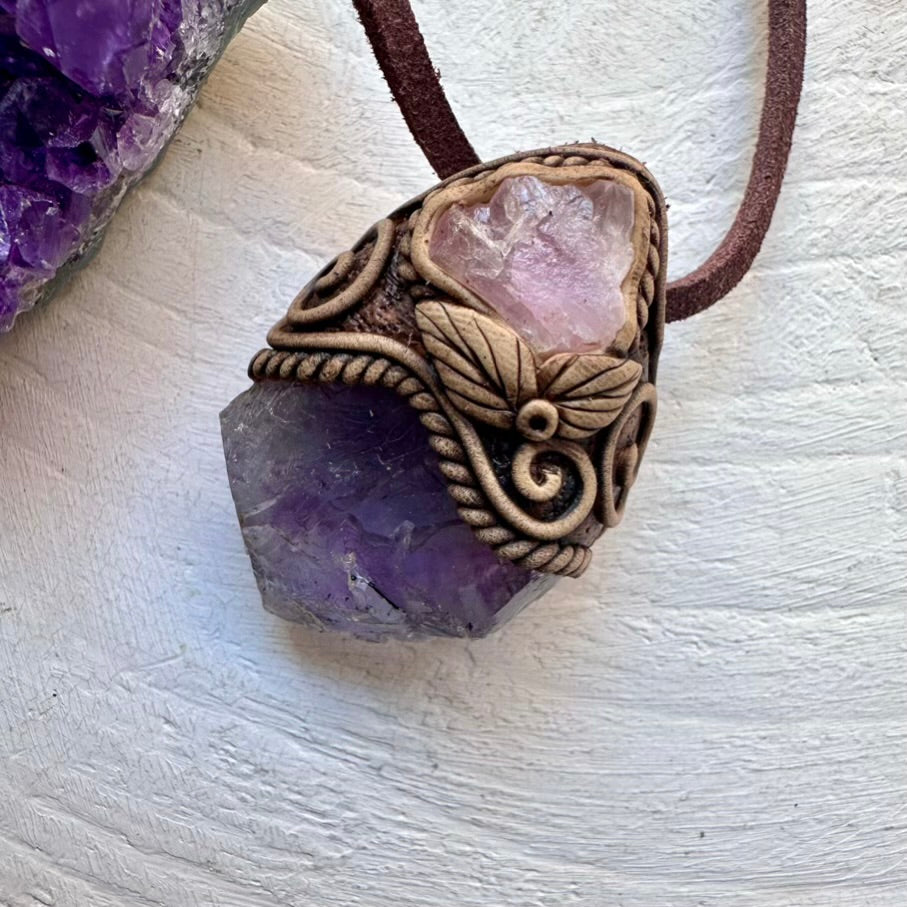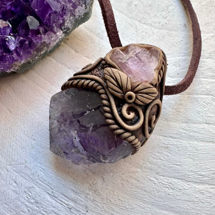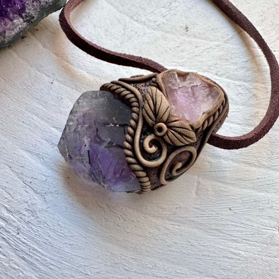 The Raw Purple-Blue Fluorite and Crystallized Rose Quartz Necklace is made with durable clay and it comes with an adjustable leather cord.