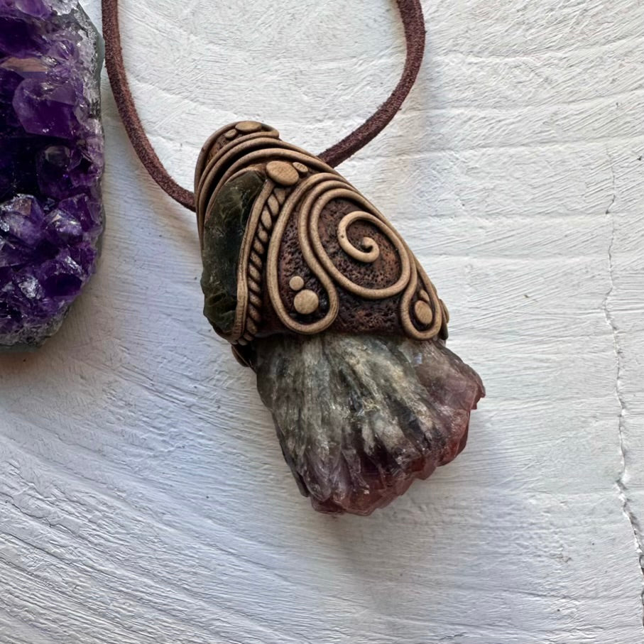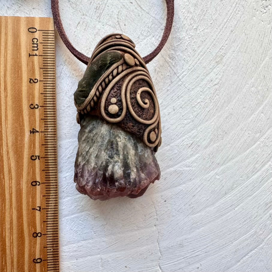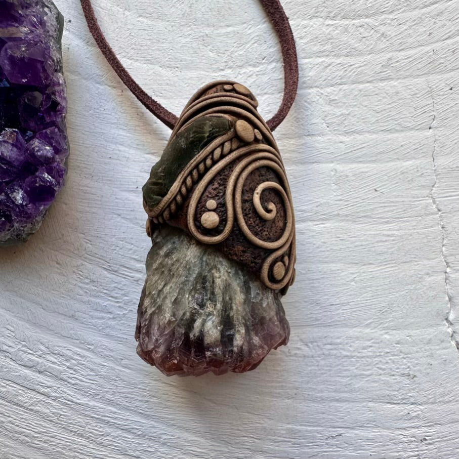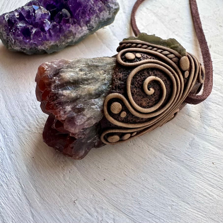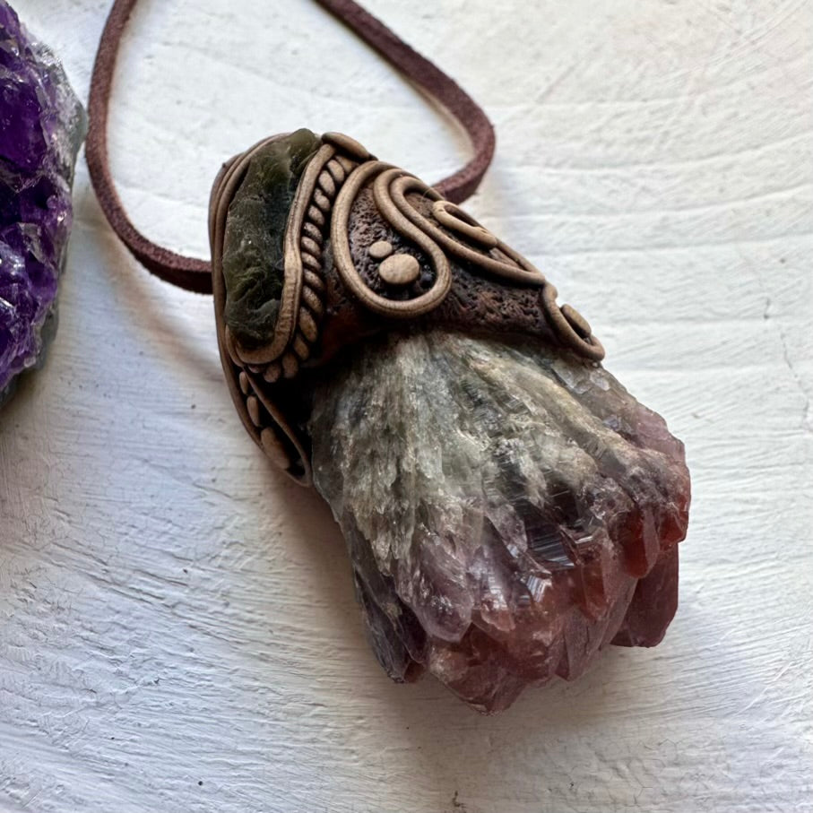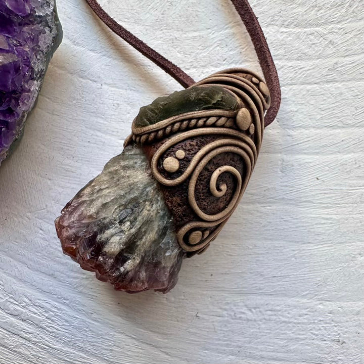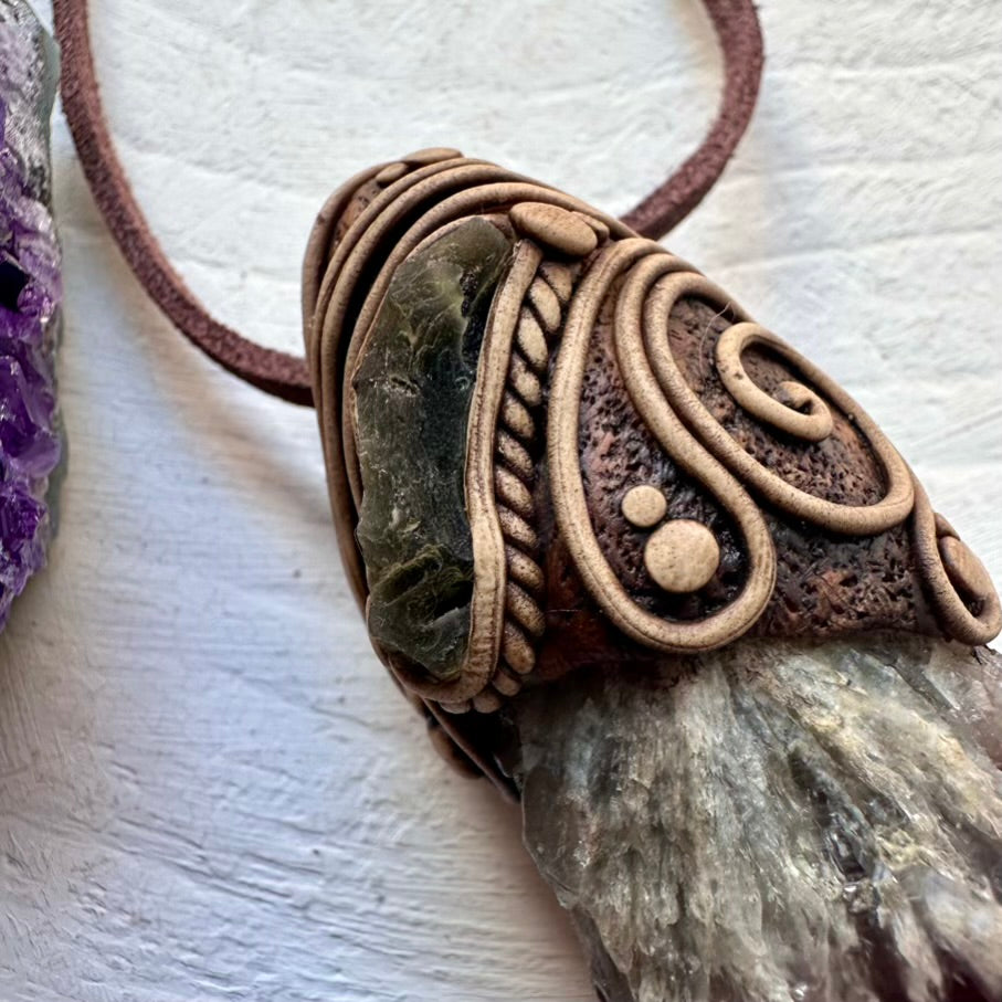 The Super Seven Quartz and Moldavite Pendant Necklace is made with durable clay and it comes with an adjustable leather cord.