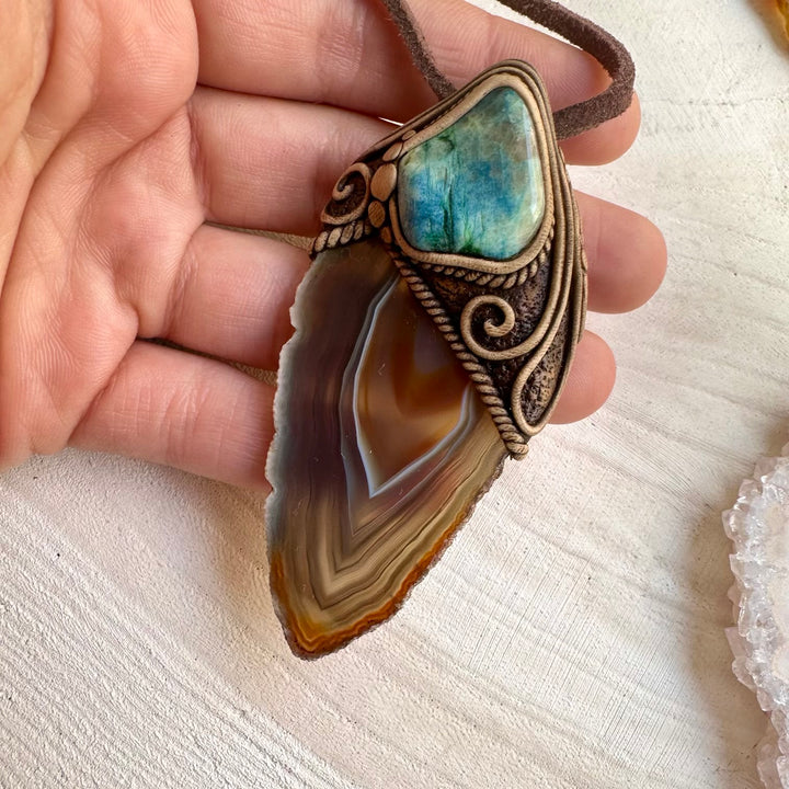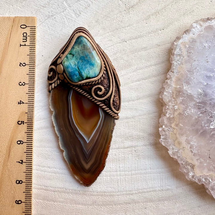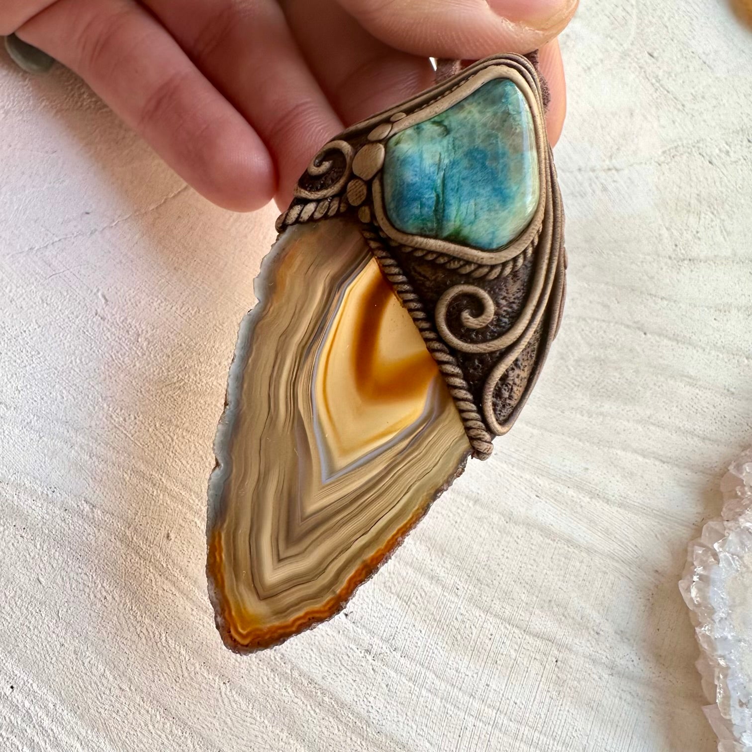 Fragile handcrafted elements. Polymer clay details, handcrafted mounts, metal components, and crystal settings can break if bent, dropped, or exposed to force. Please handle with care.