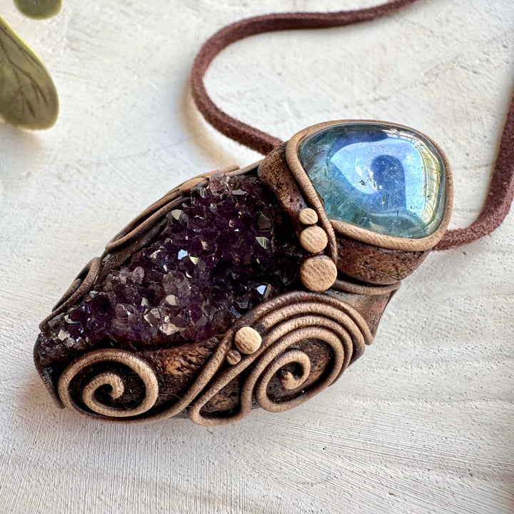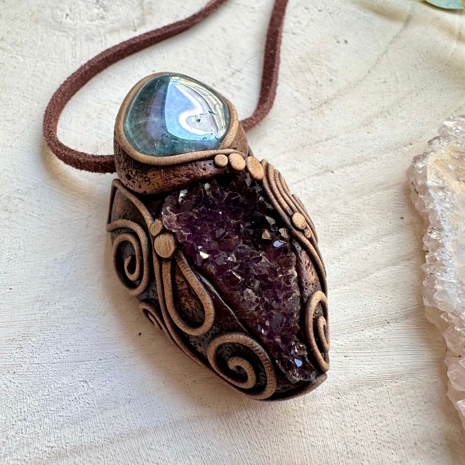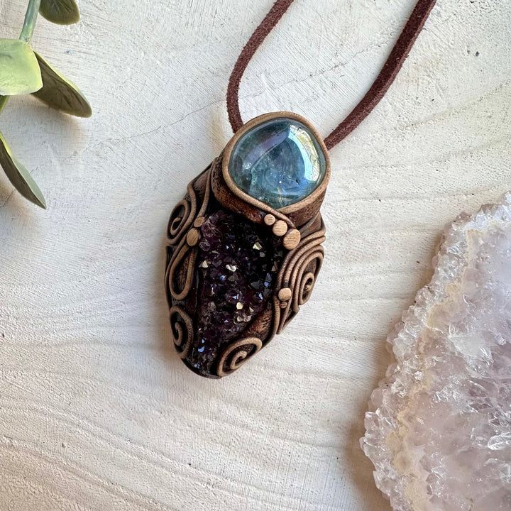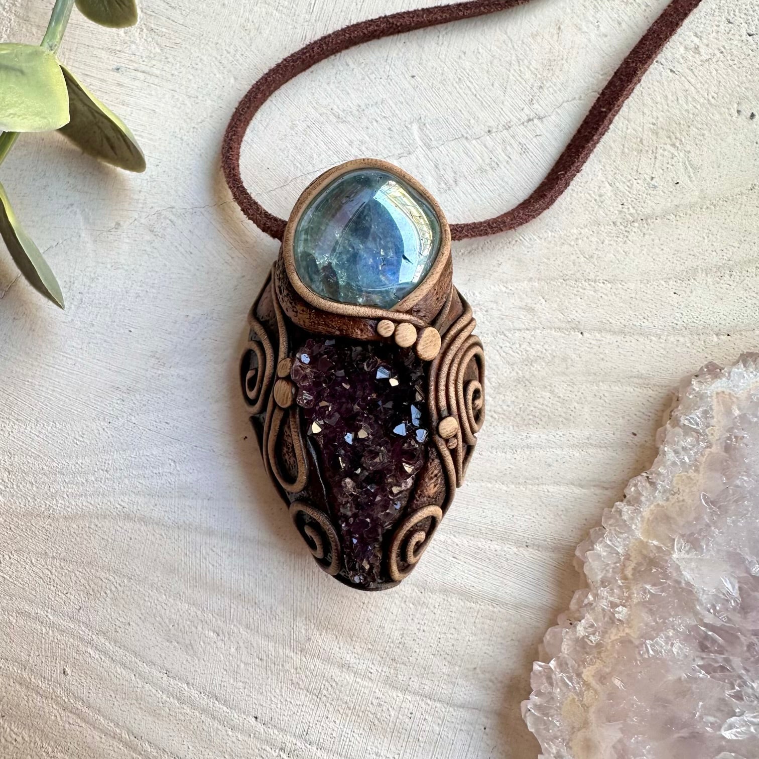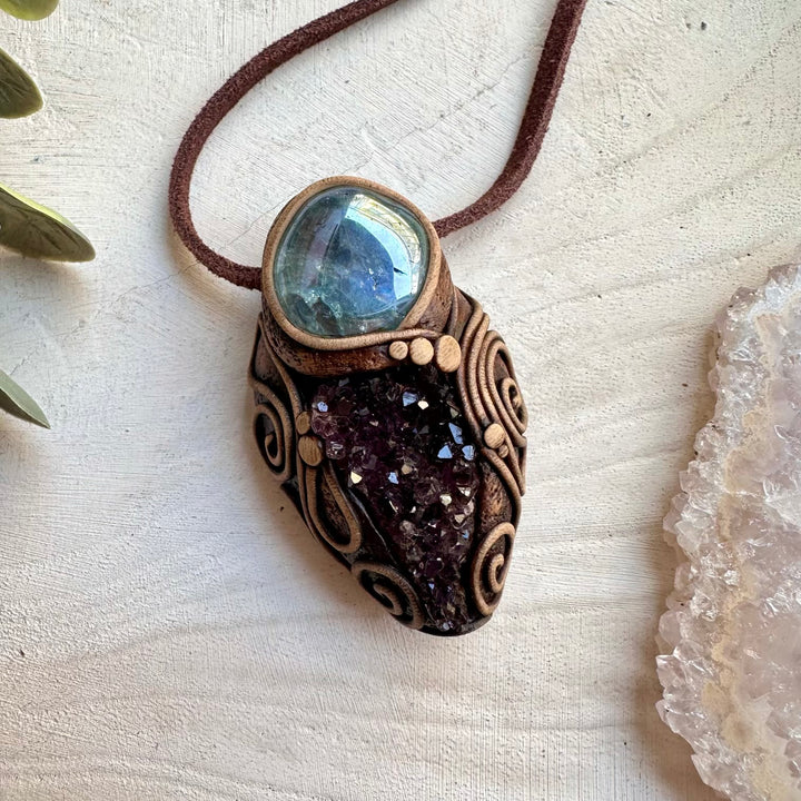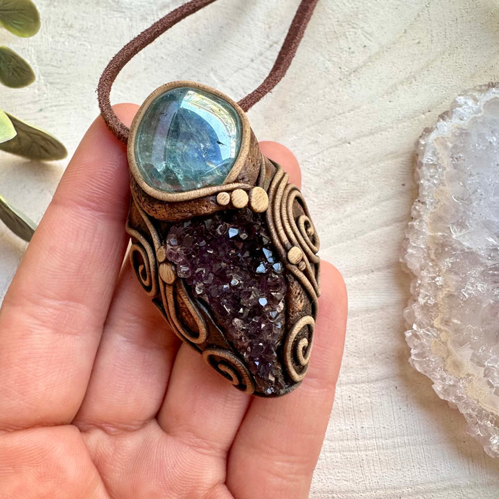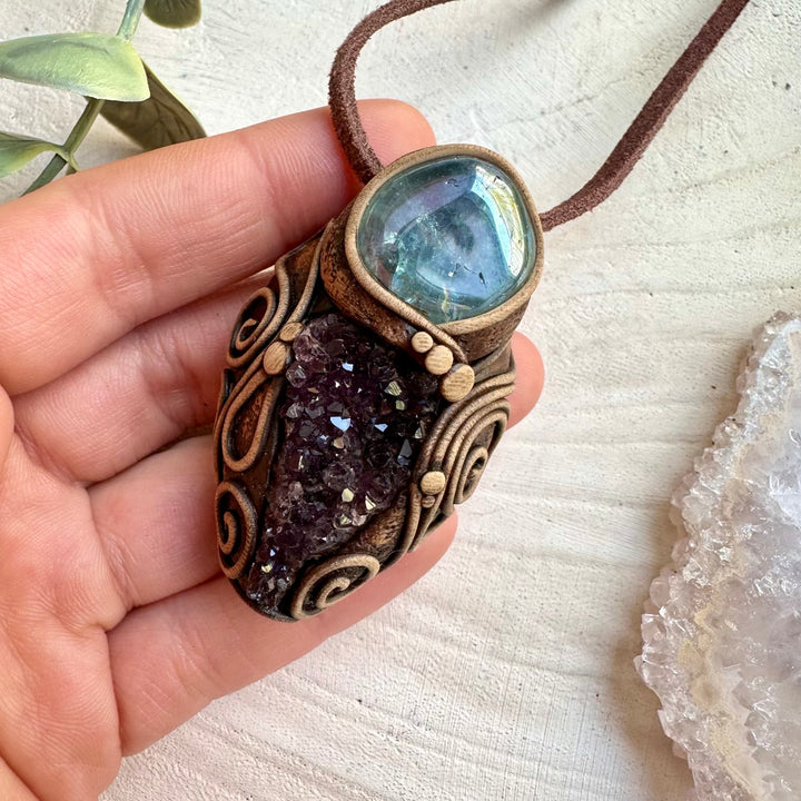 The Amethyst Cluster and Aqua Aura Quartz Pendant Necklace is made with durable clay and it comes with adjustable leather cord.