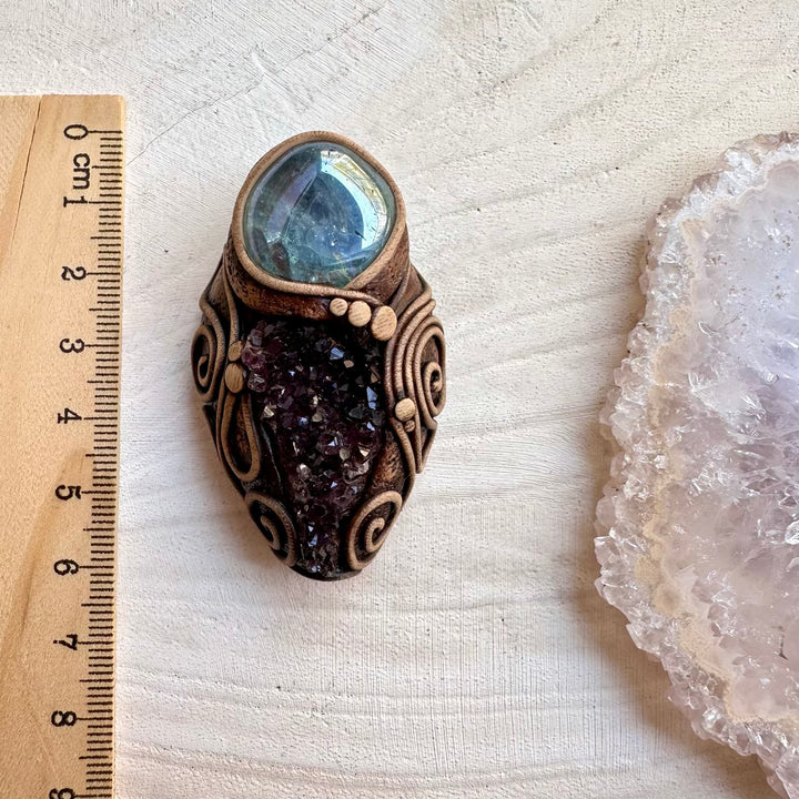Fragile handcrafted elements. Polymer clay details, handcrafted mounts, metal components, and crystal settings can break if bent, dropped, or exposed to force. Please handle with care.