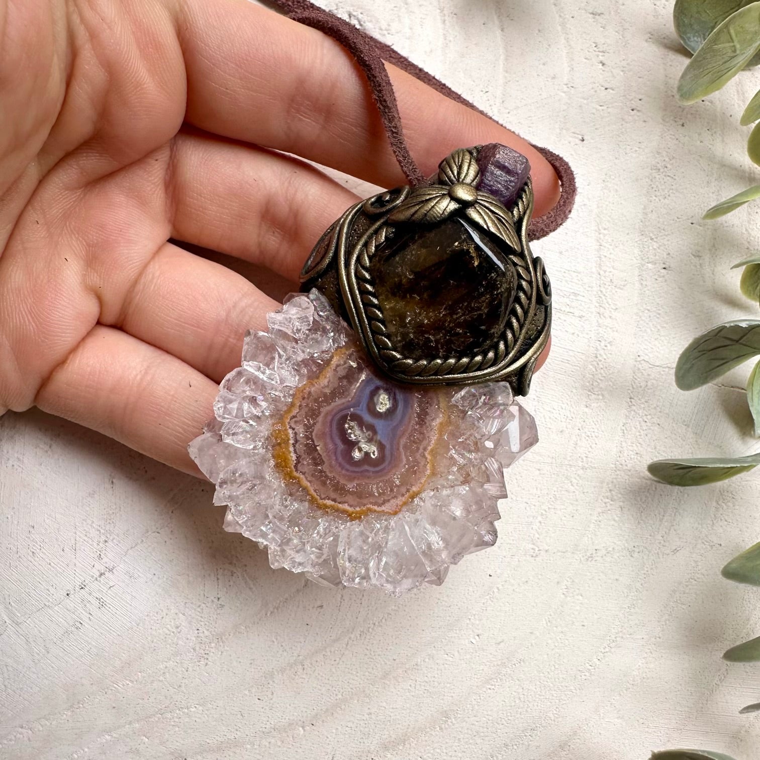 One of a kind crystal pendant necklace with amethyst stalactite citrine and ruby