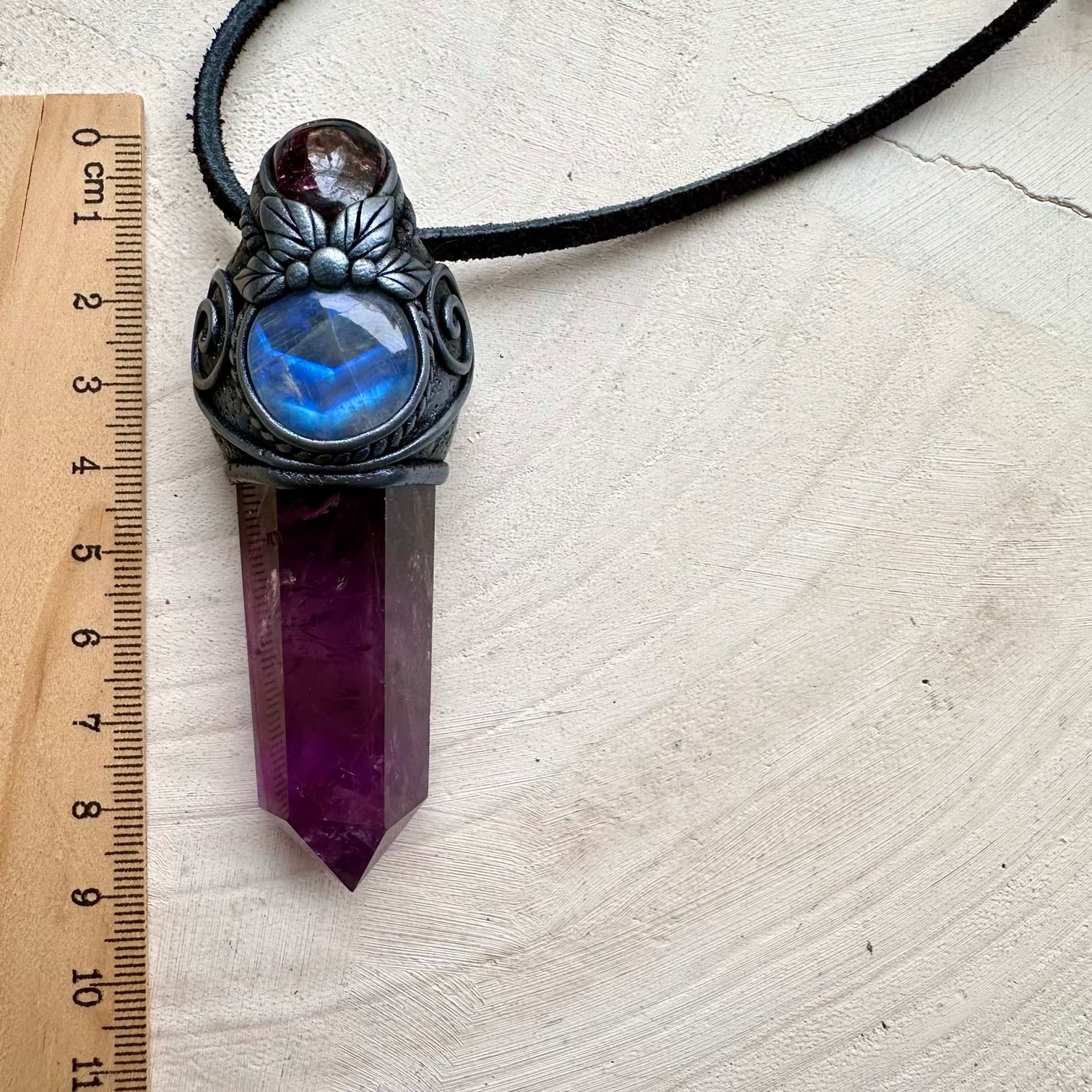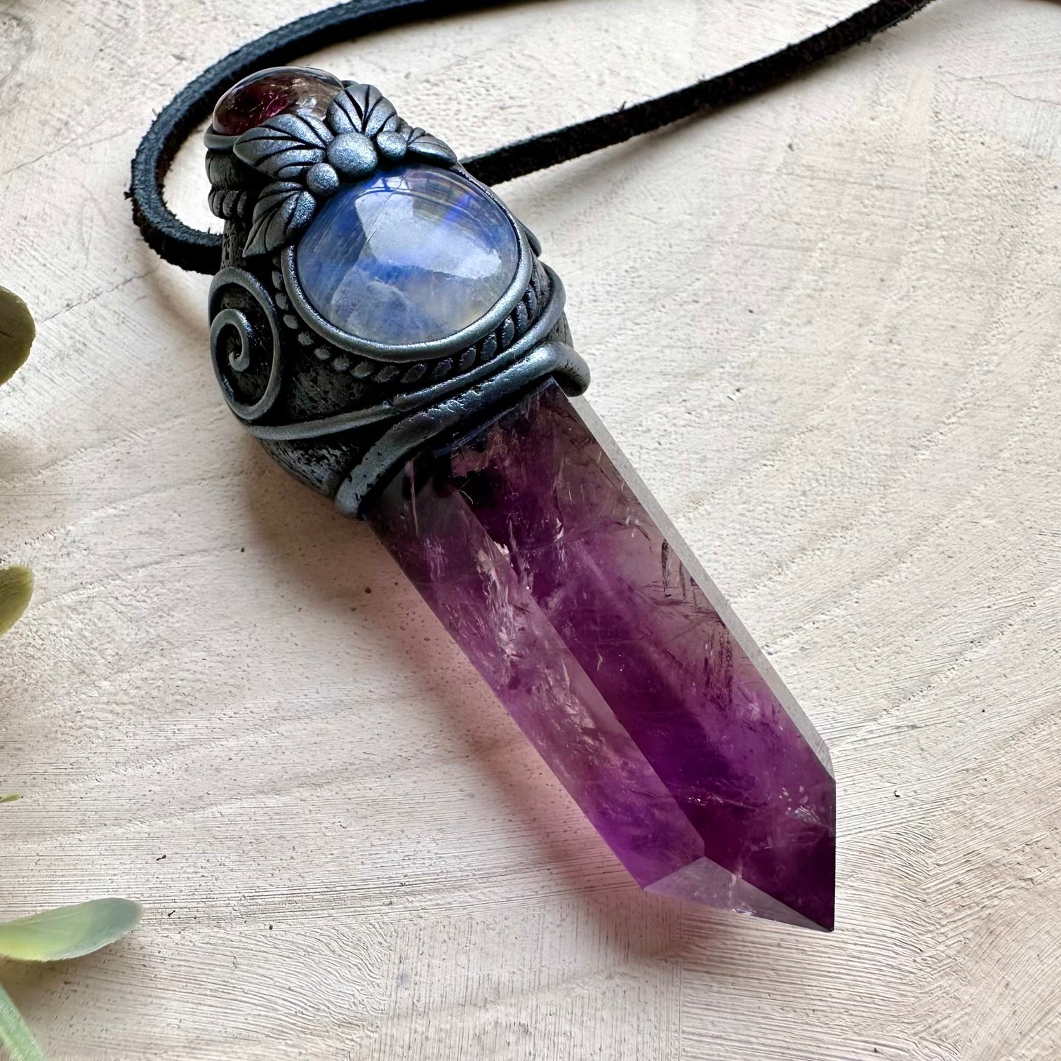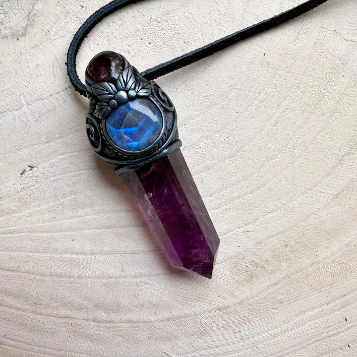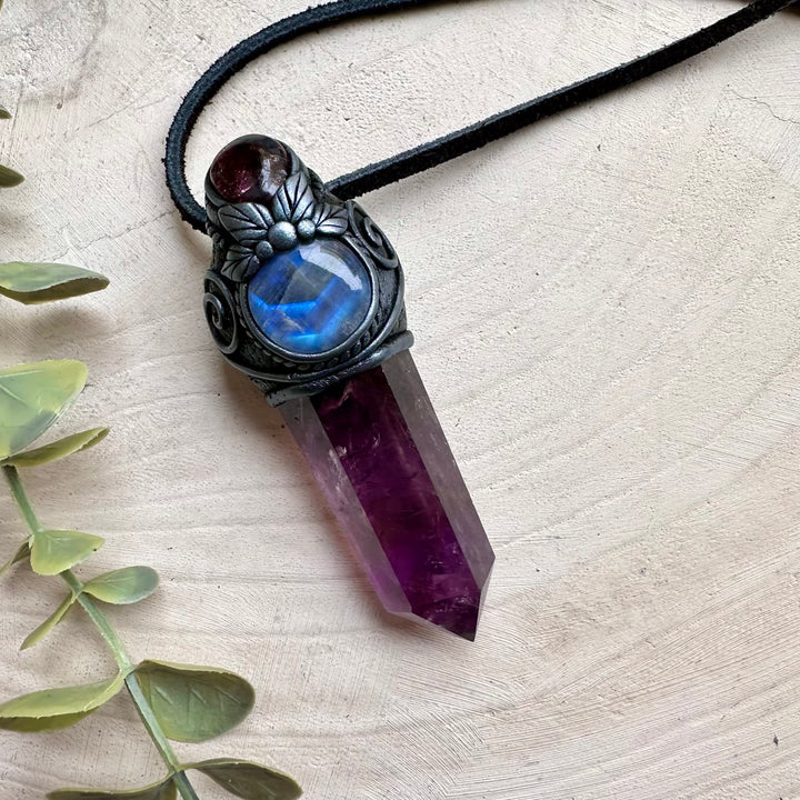 The Amethyst with Rainbow Moonstone and Rhodolite Garnet Pendant Necklace / Mini Crystal Wand isn’t just jewelry