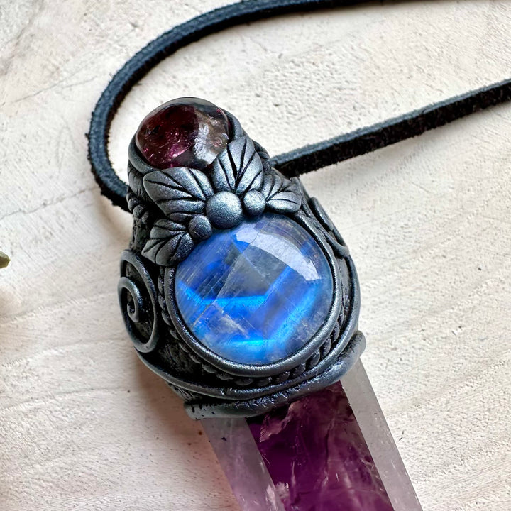 Amethyst with rainbow moonstone and rhodolite garnet pendant necklace mini crystal wand