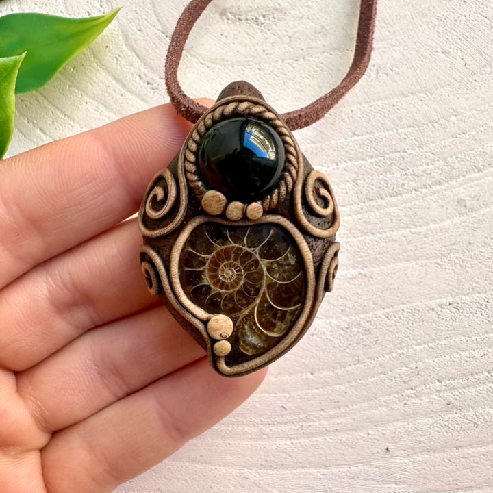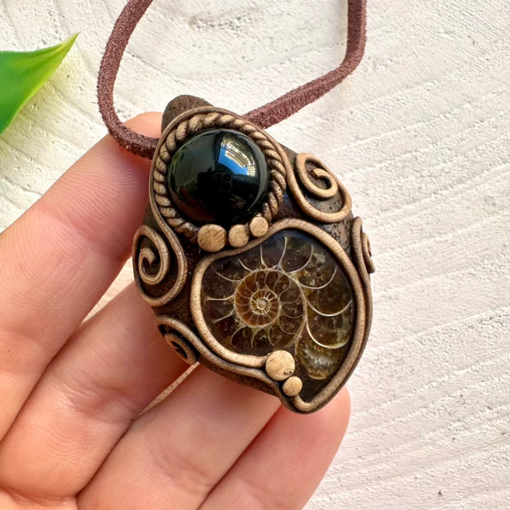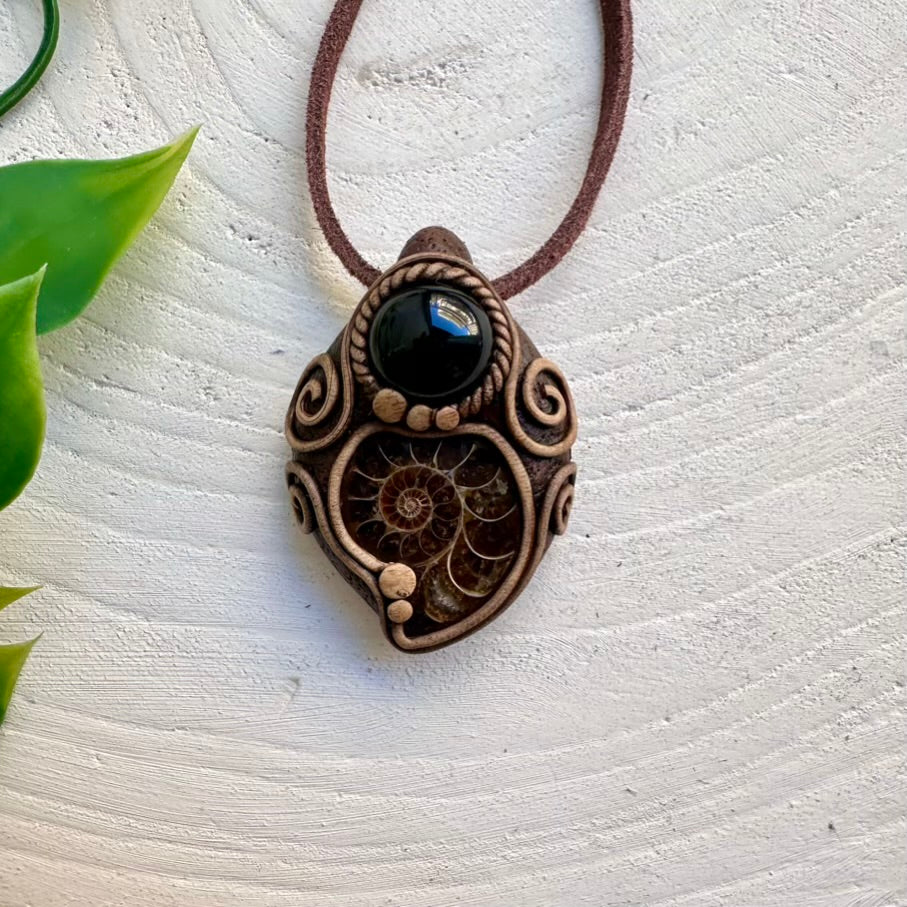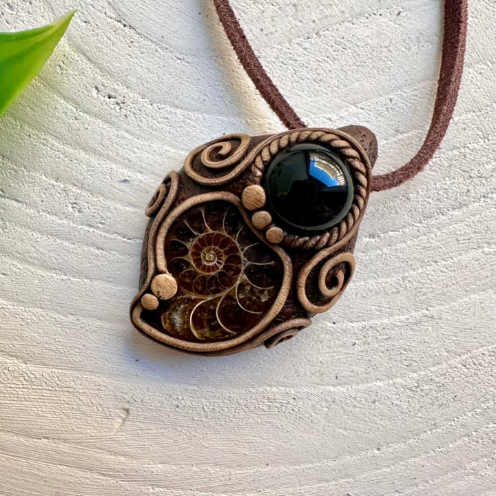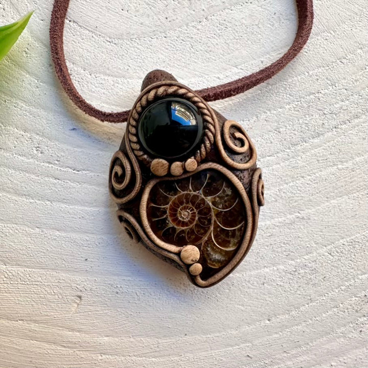 The Ammonite and Black Onyx Necklace Unisex Handmade Pendant is made with durable clay and it comes with adjustable leather cord.