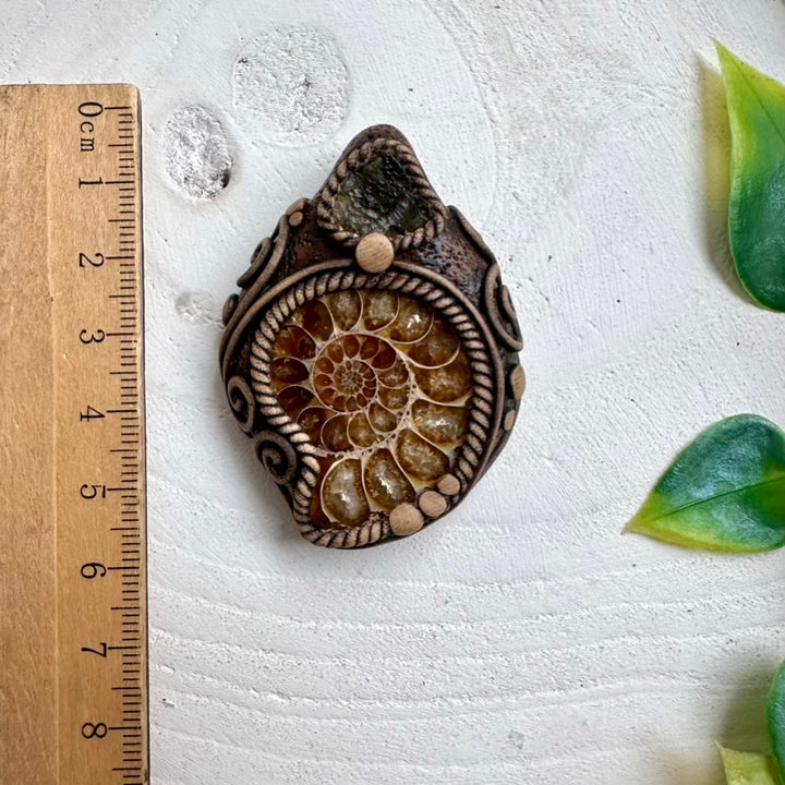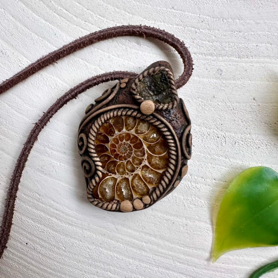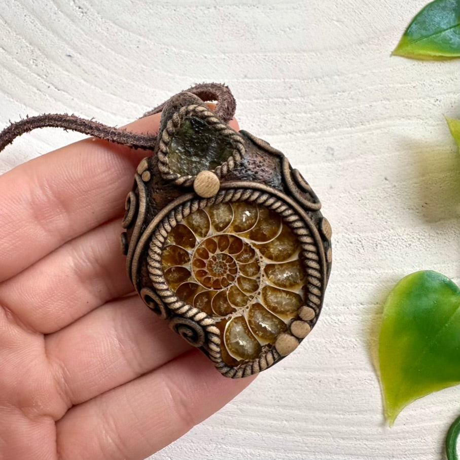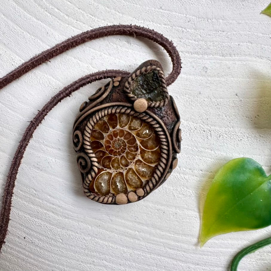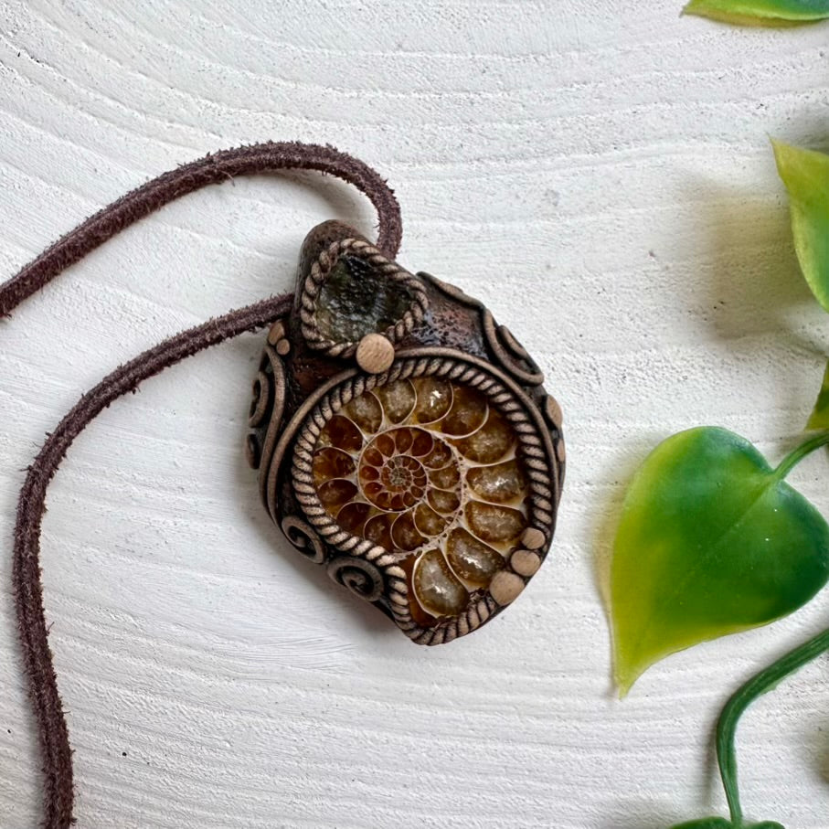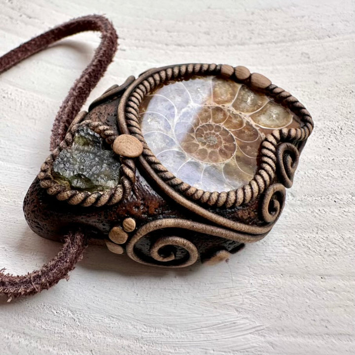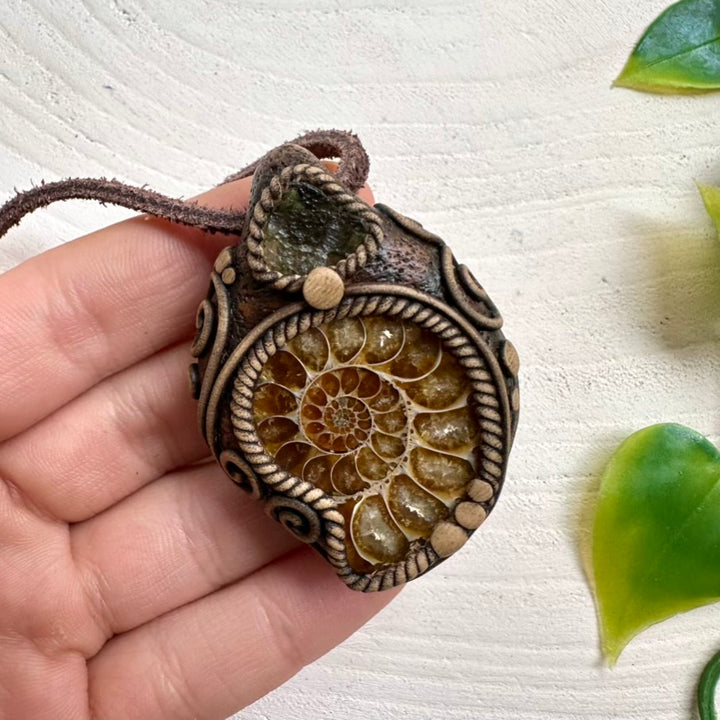 The Ammonite and Moldavite Pendant Necklace is made with durable clay and it comes with adjustable leather cord.