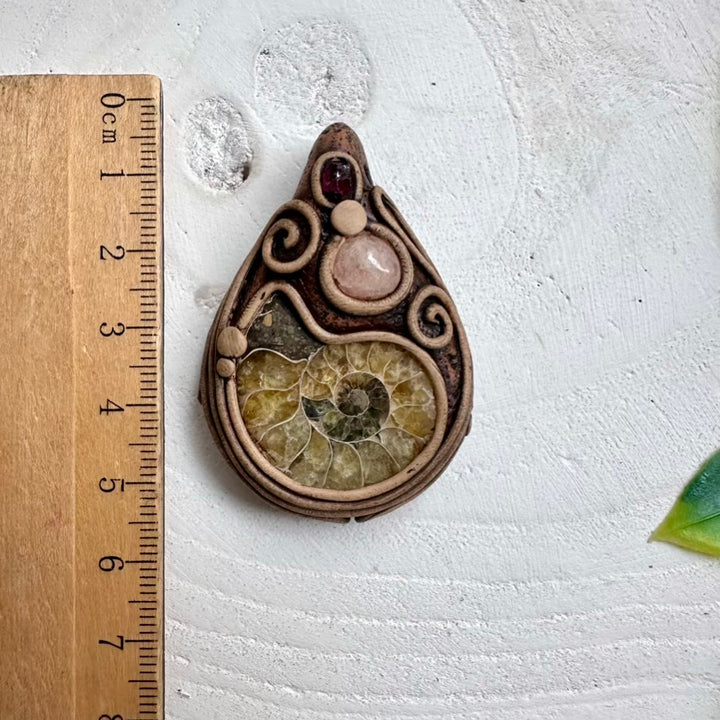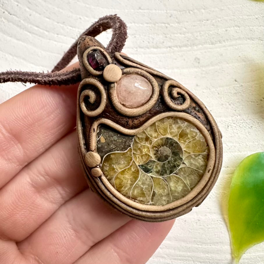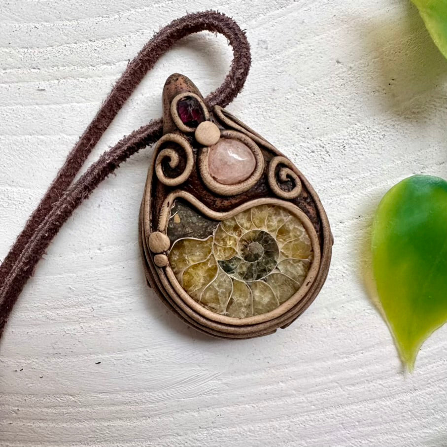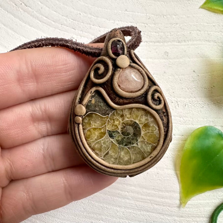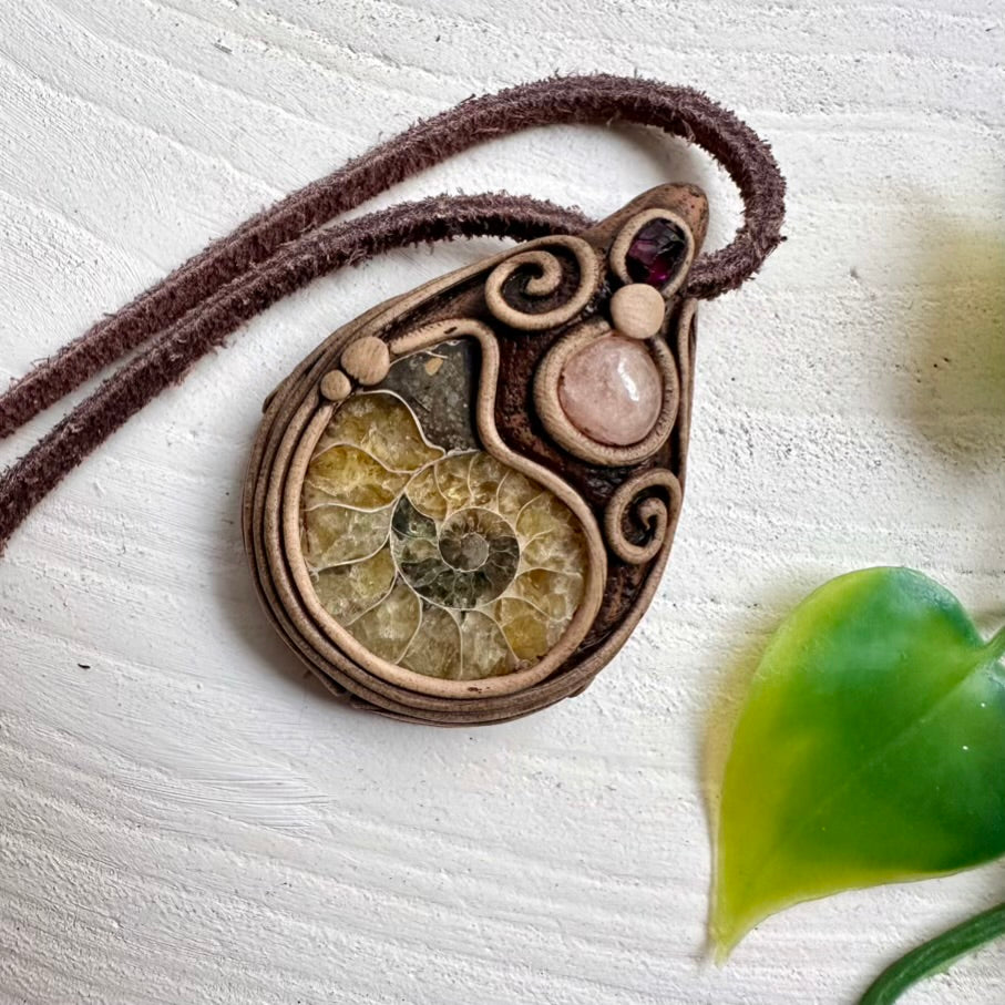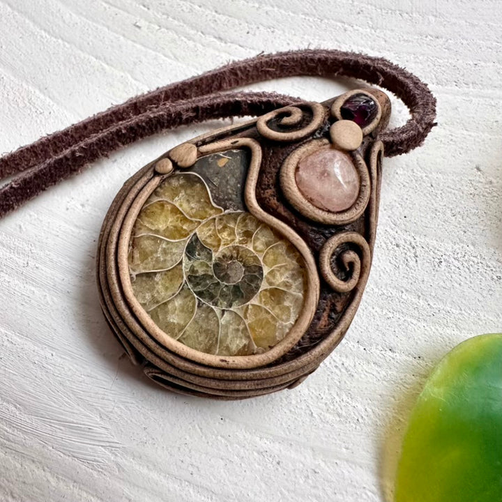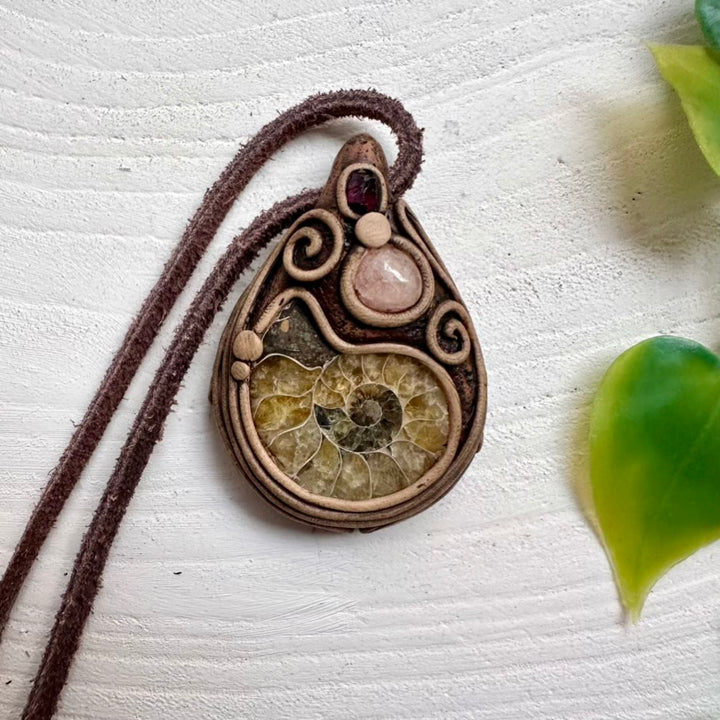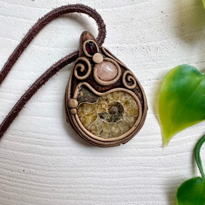 The Ammonite Morganite and Rhodolite Garnet Necklace, Gemstone Jewelry is made with durable clay and it comes with adjustable leather cord.