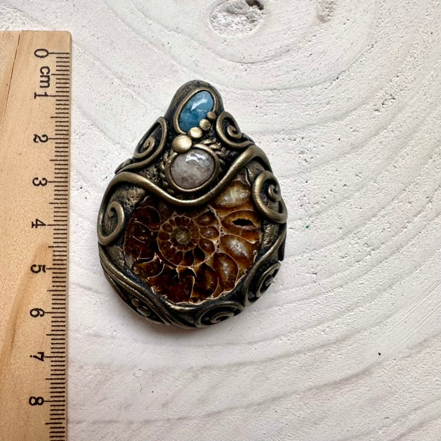 Spiritual crystal amulet featuring ancient Ammonite spiral, calming Aquamarine and heart-soothing pink Morganite, artisan handmade necklace.