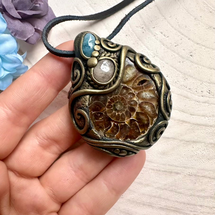 handcrafted Ammonite fossil with Aquamarine and Morganite shimmer, festival-ready healing crystal necklace talisman.