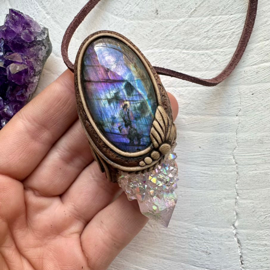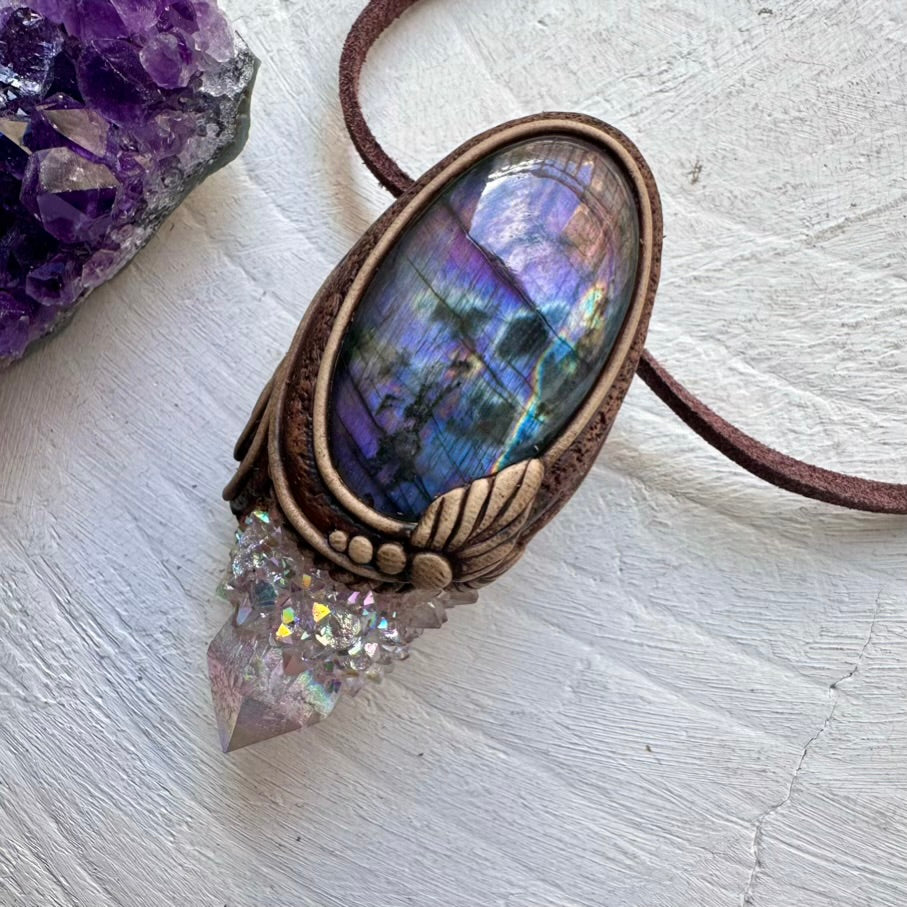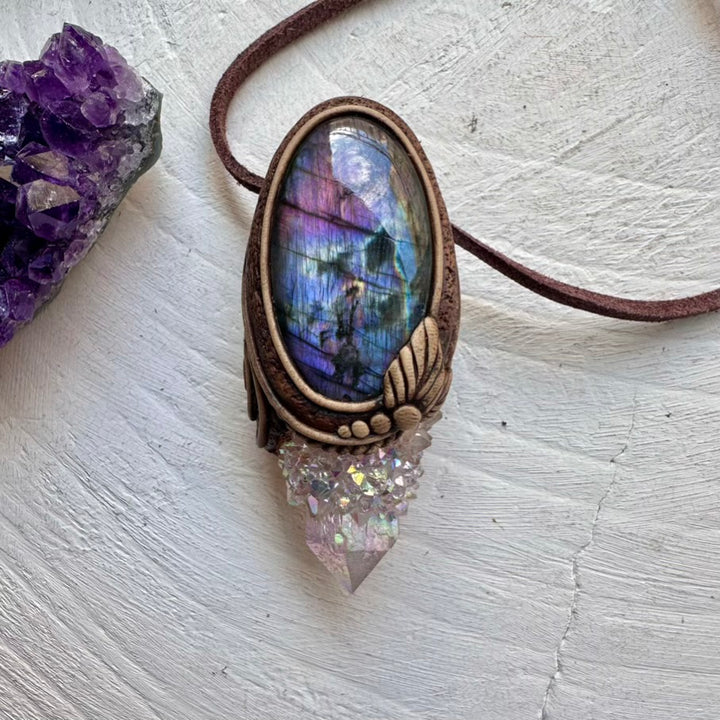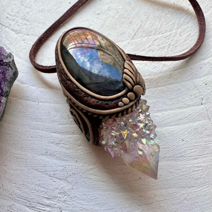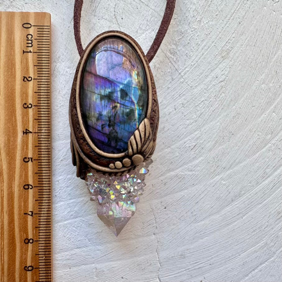 The Angel Aura Spirit Quartz and Purple Labradorite Pendant is made with durable clay and it comes with adjustable leather cord.