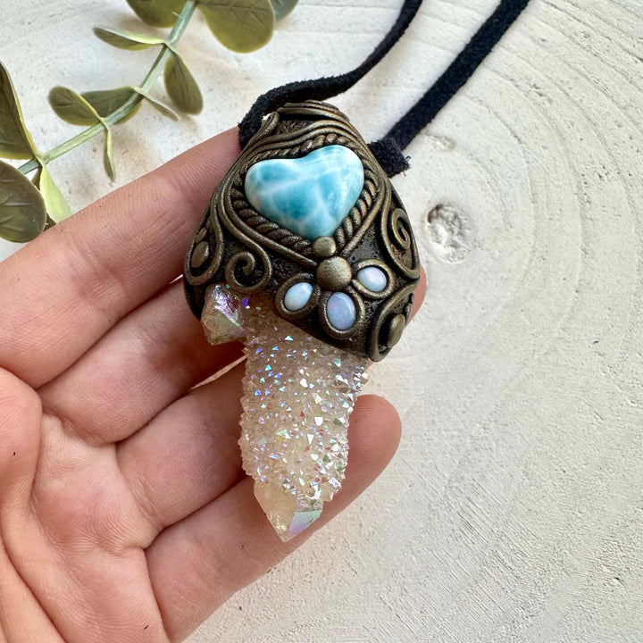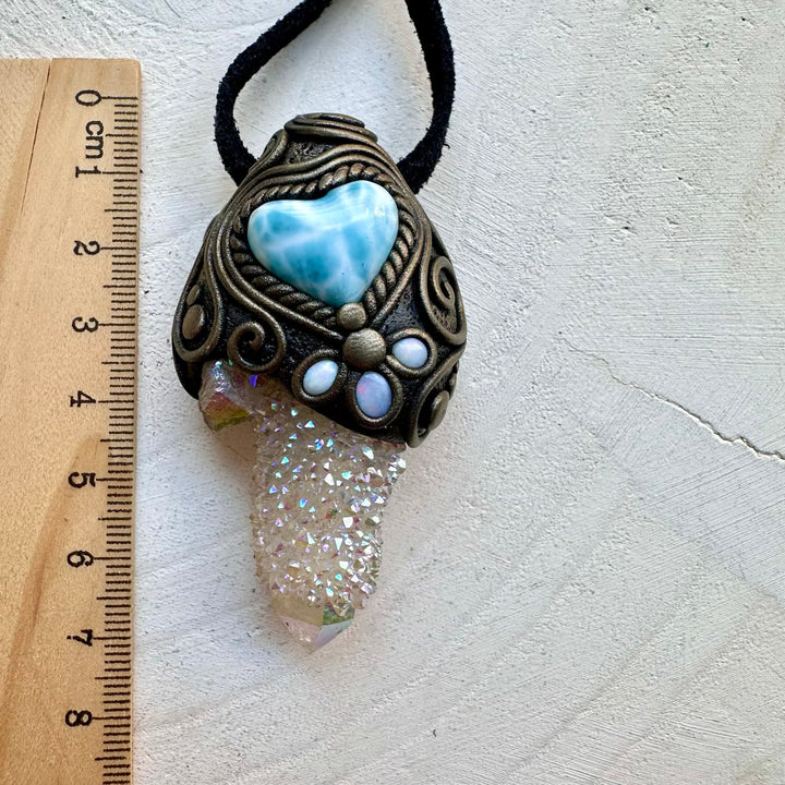 Fragile handcrafted elements. Polymer clay details, handcrafted mounts, metal components, and crystal settings can break if bent, dropped, or exposed to force. Please handle with care.
