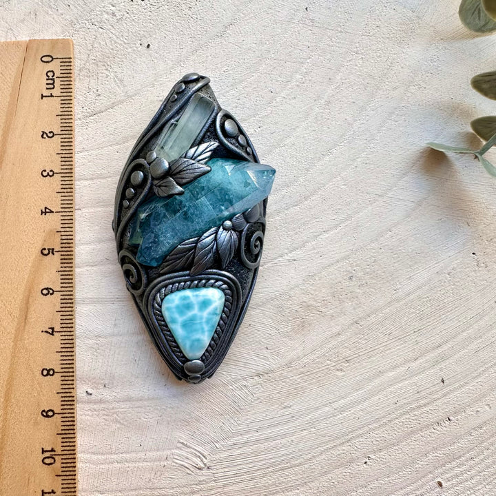 Fragile handcrafted elements. Polymer clay details, handcrafted mounts, metal components, and crystal settings can break if bent, dropped, or exposed to force. Please handle with care.