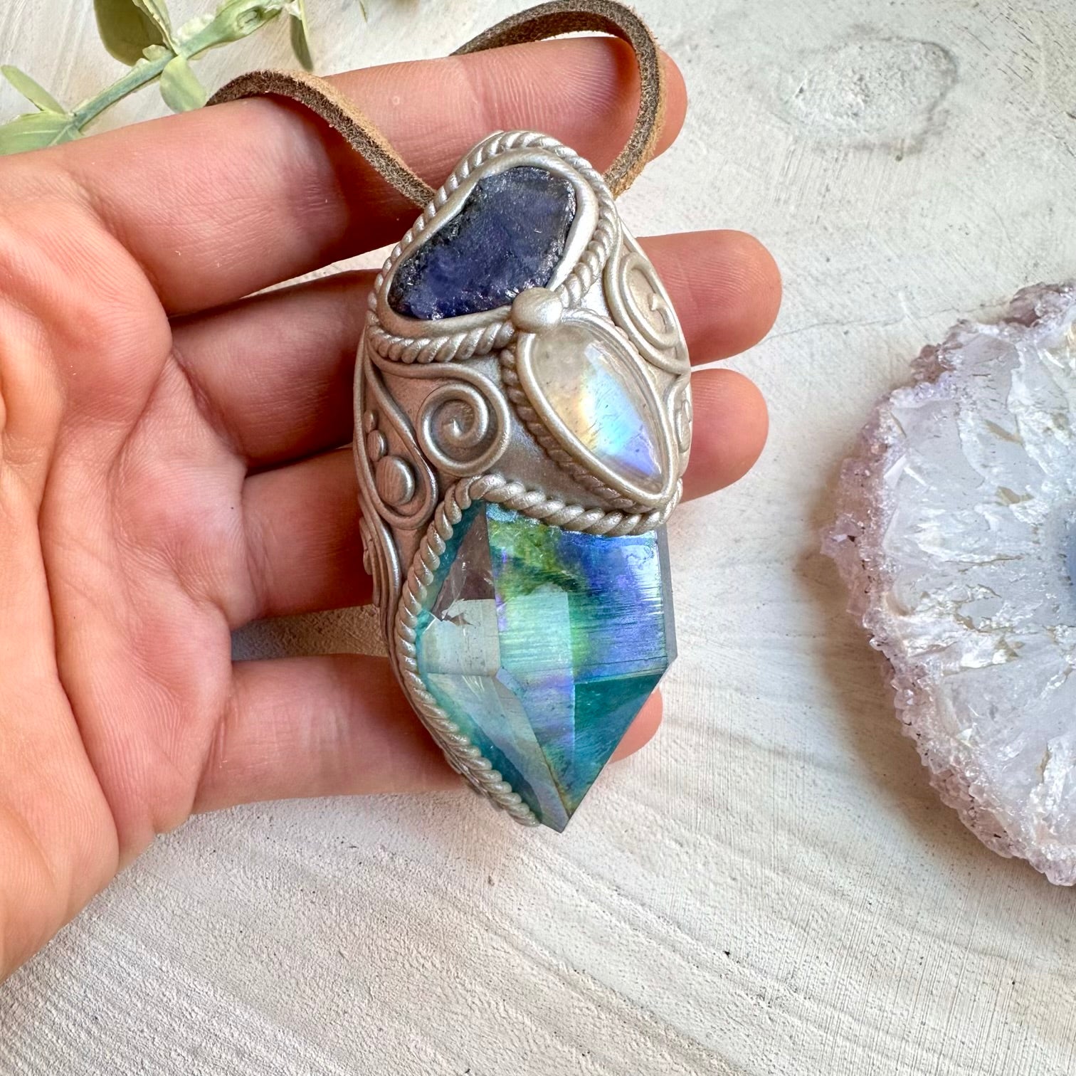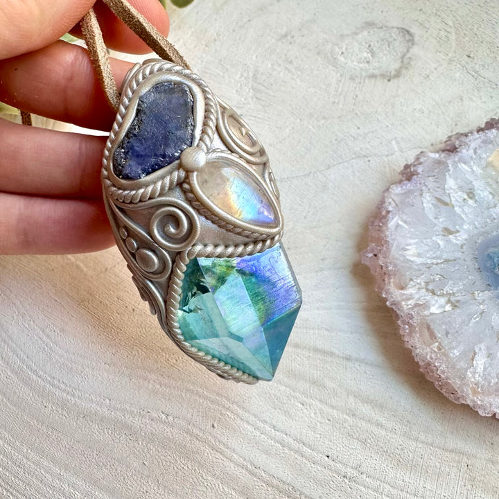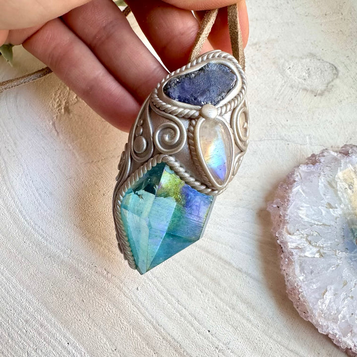 The Aqua Aura Quartz with Rainbow Moonstone and Raw Tanzanite Pendant Necklace is made with durable clay and it comes with adjustable leather cord.