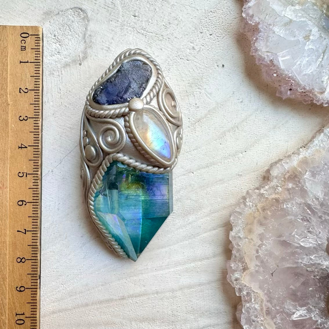 Fragile handcrafted elements. Polymer clay details, handcrafted mounts, metal components, and crystal settings can break if bent, dropped, or exposed to force. Please handle with care.