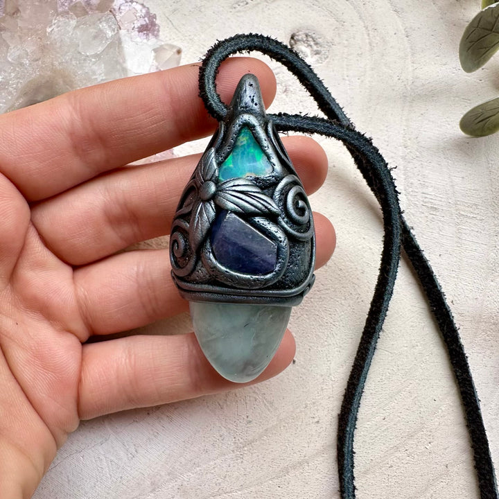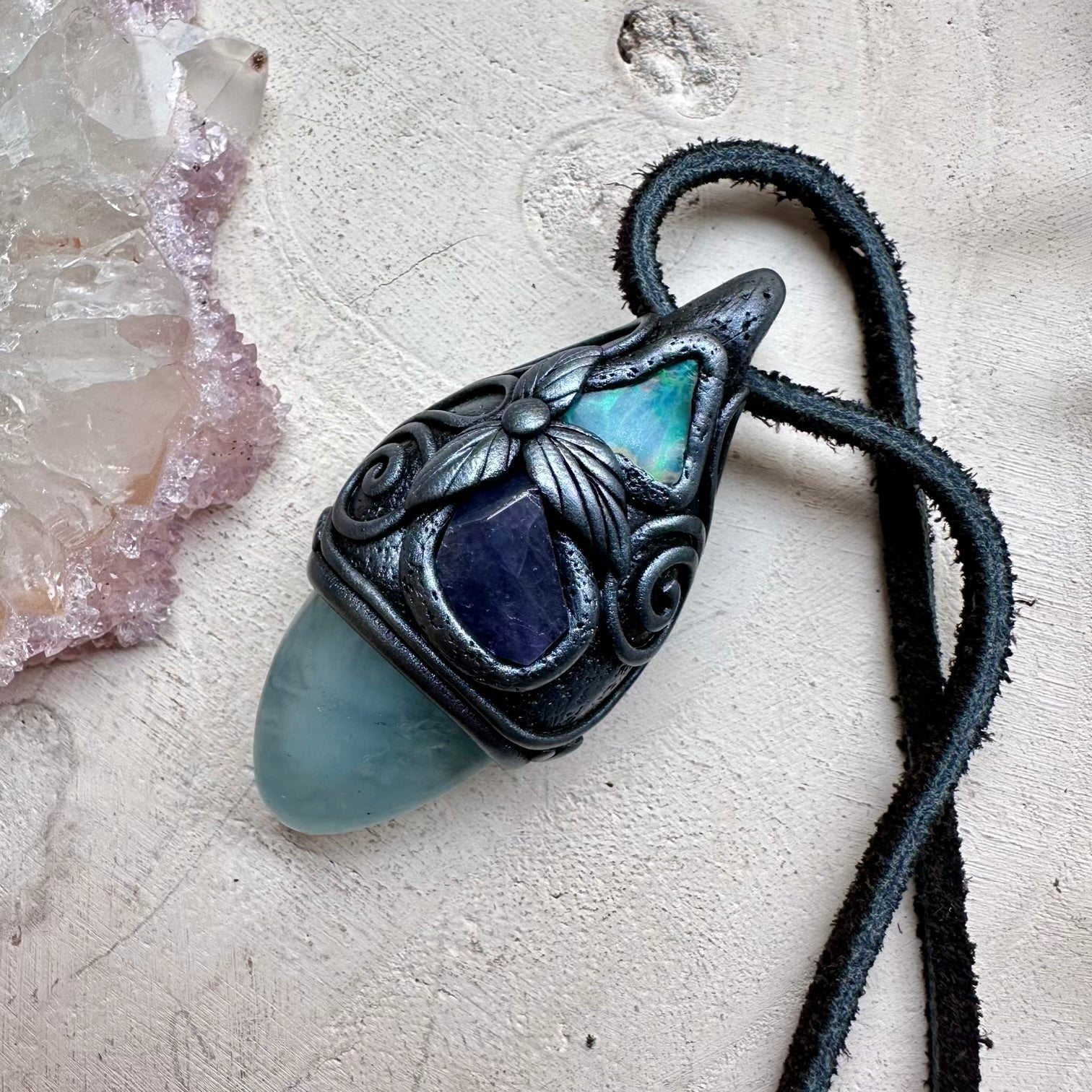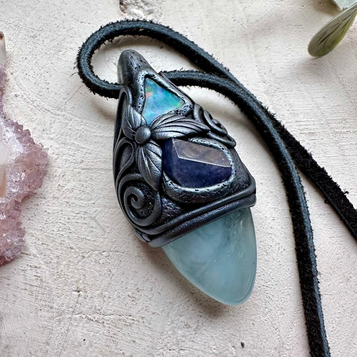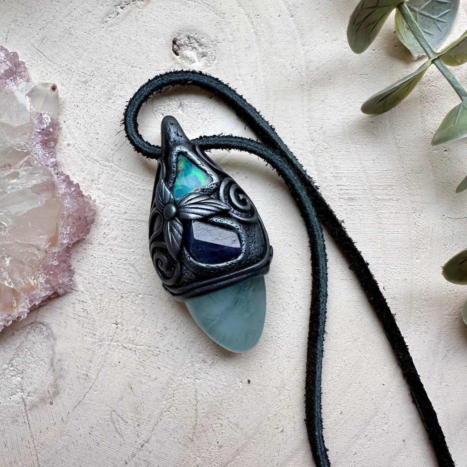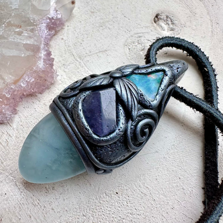 The Aquamarine Tanzanite and Raw Ethiopian Opal Handmade Protection Necklace is made with durable clay and it comes with adjustable leather cord.