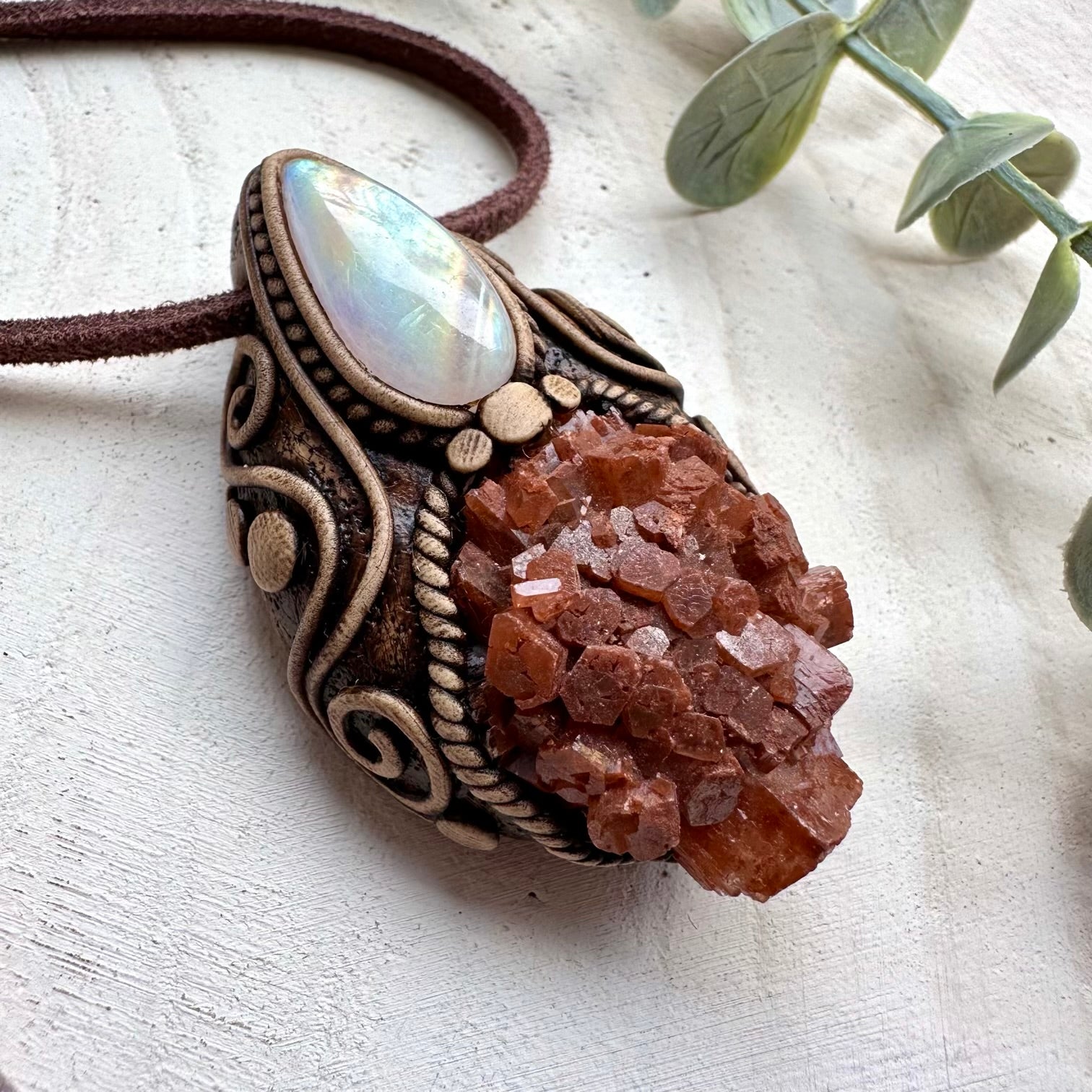 The Aragonite and Rainbow Moonstone Necklace is made with durable clay and it comes with adjustable leather cord.