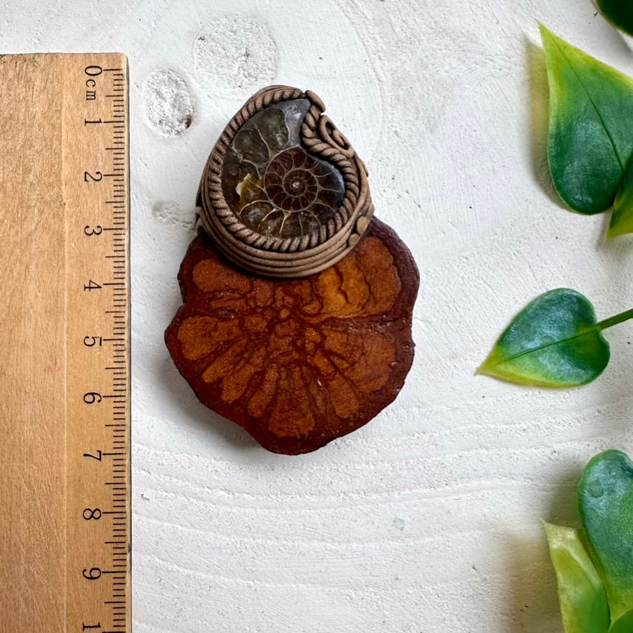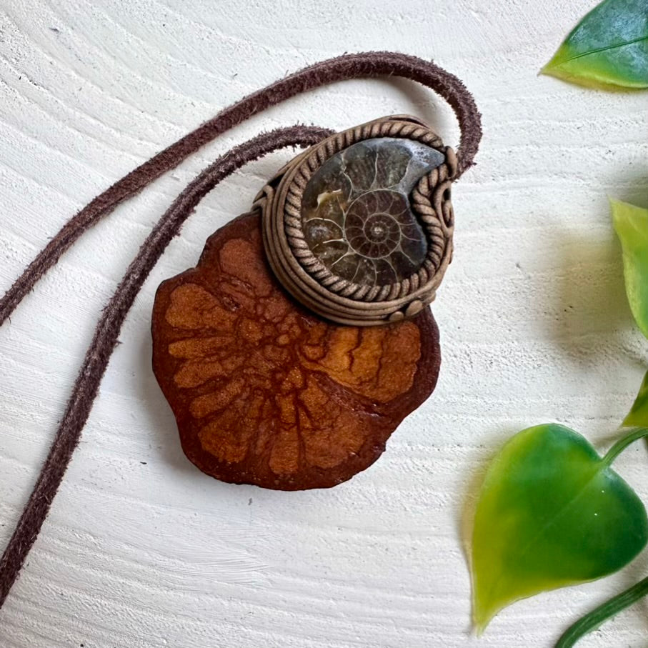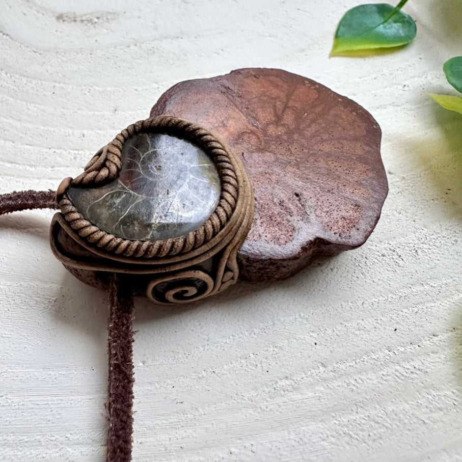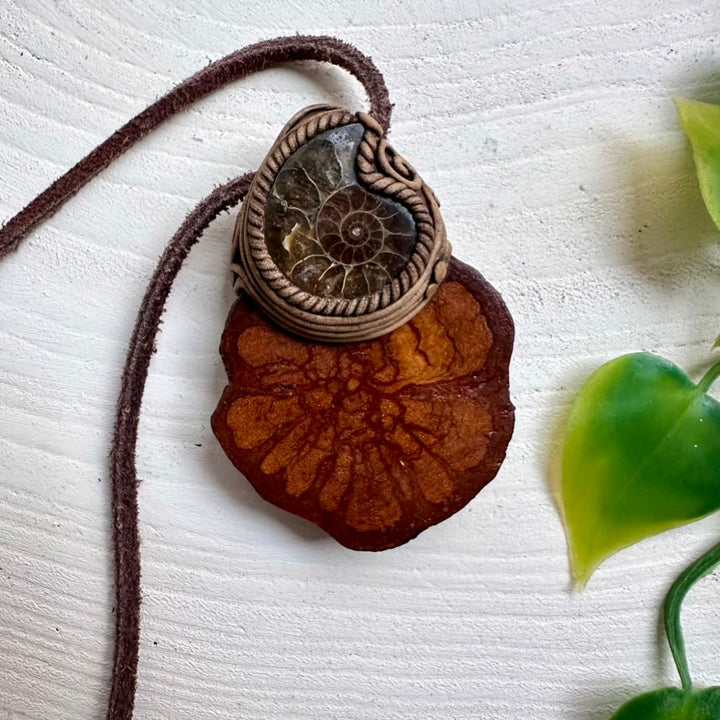 The Ayahuasca Necklace with Ammonite is made with durable clay and it comes with adjustable leather cord.