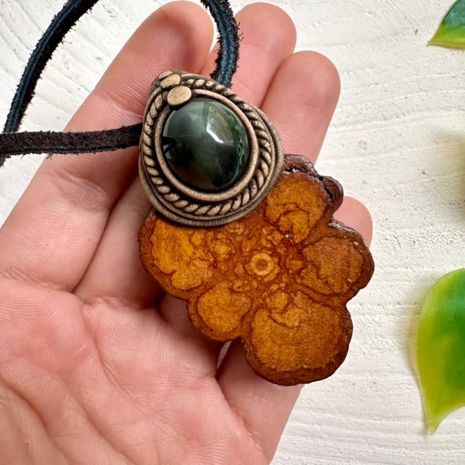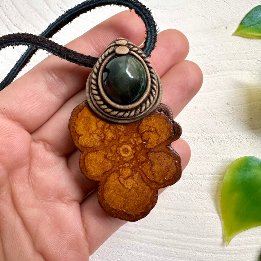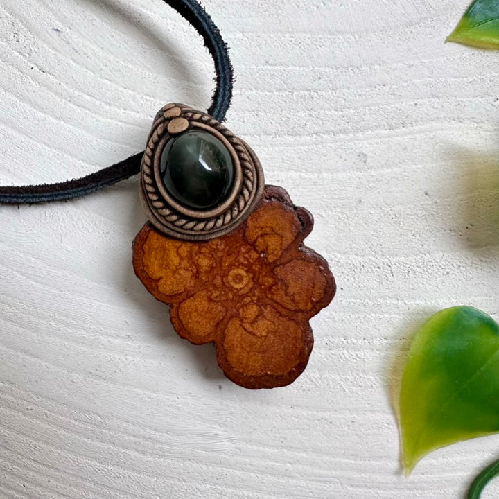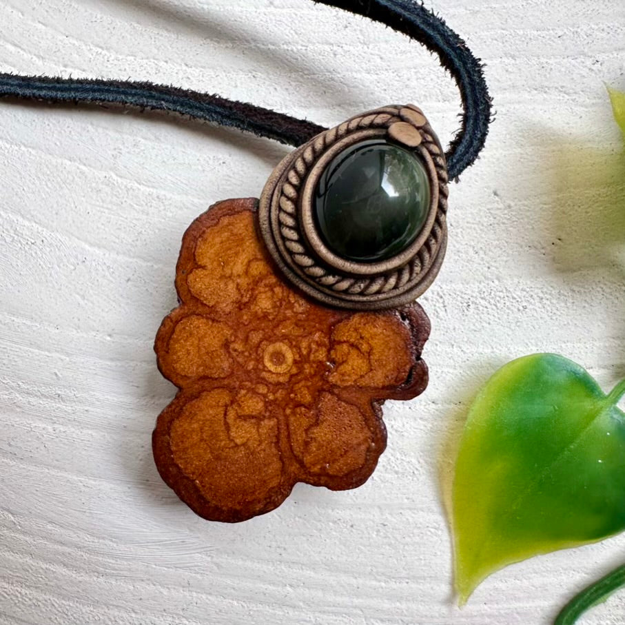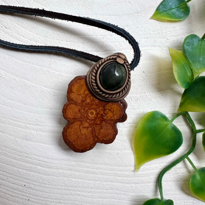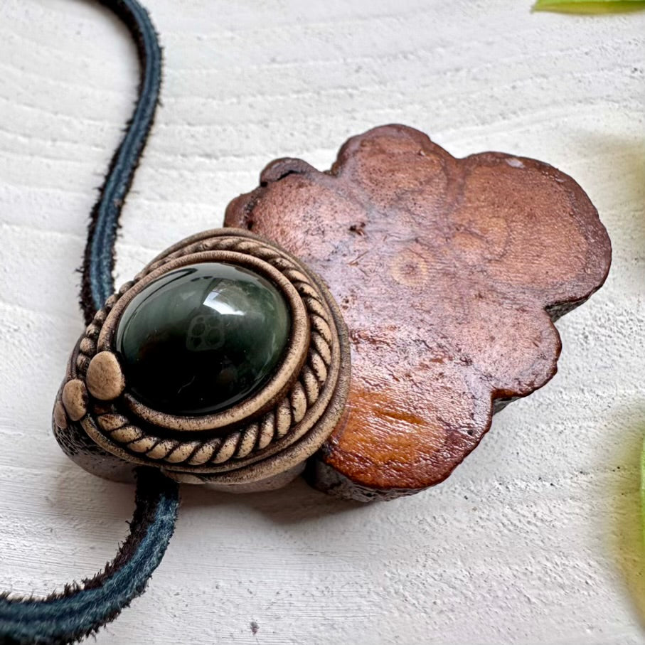 The Ayahuasca Necklace with Rainbow Obsidian Pendant Necklave is made with durable clay and it comes with adjustable leather cord.