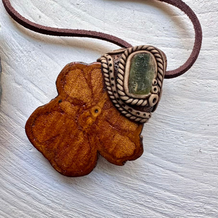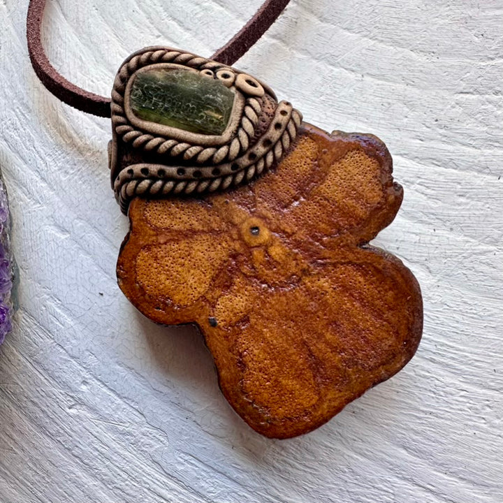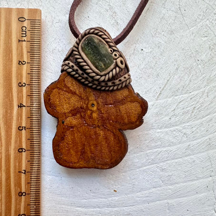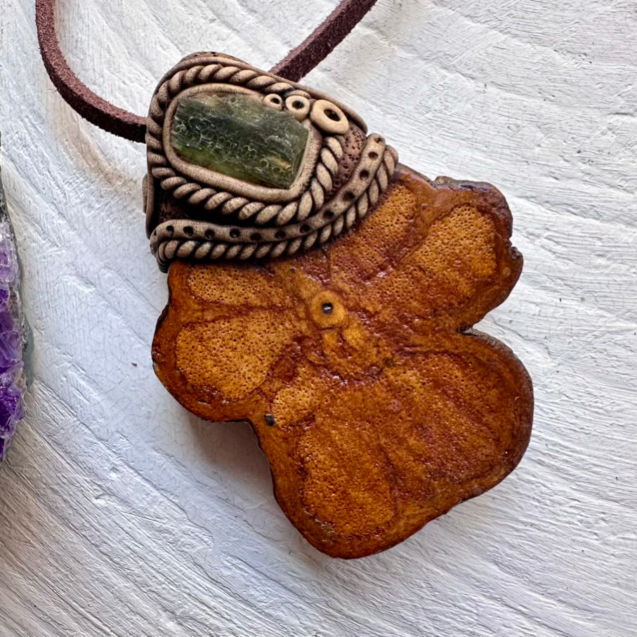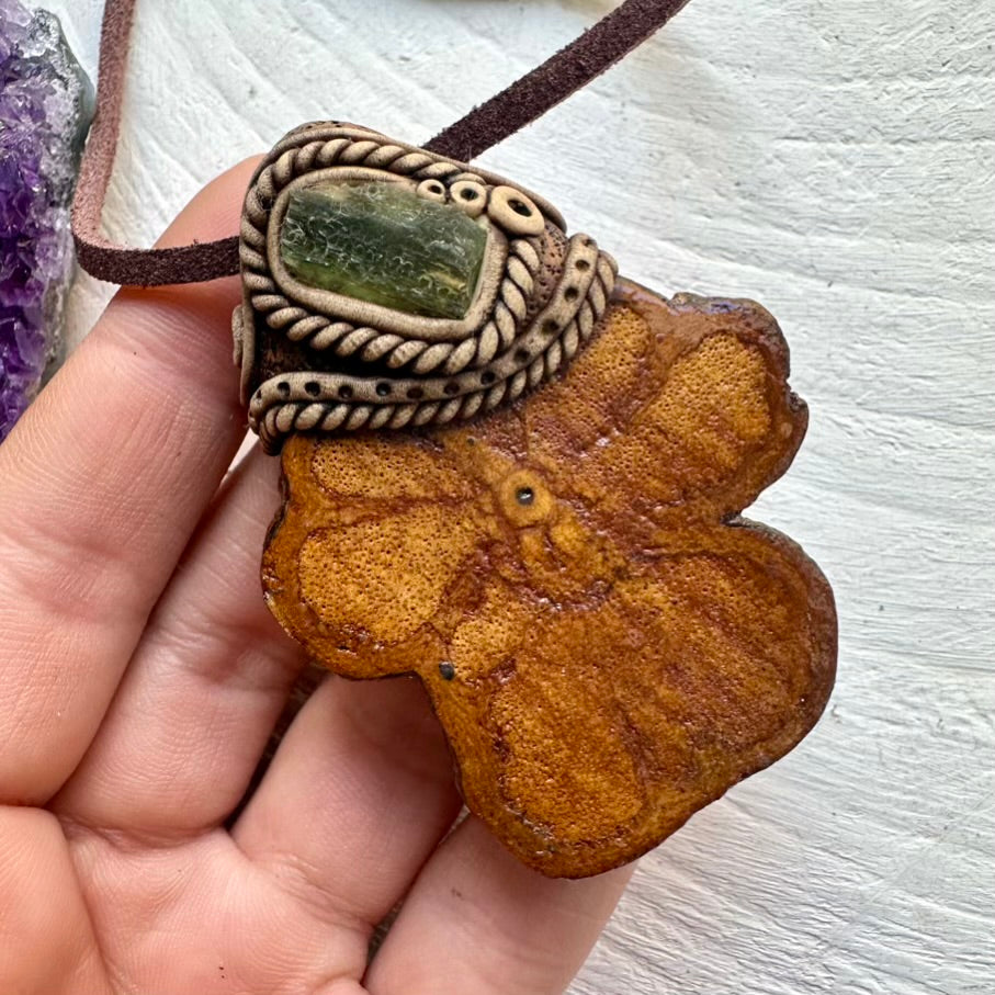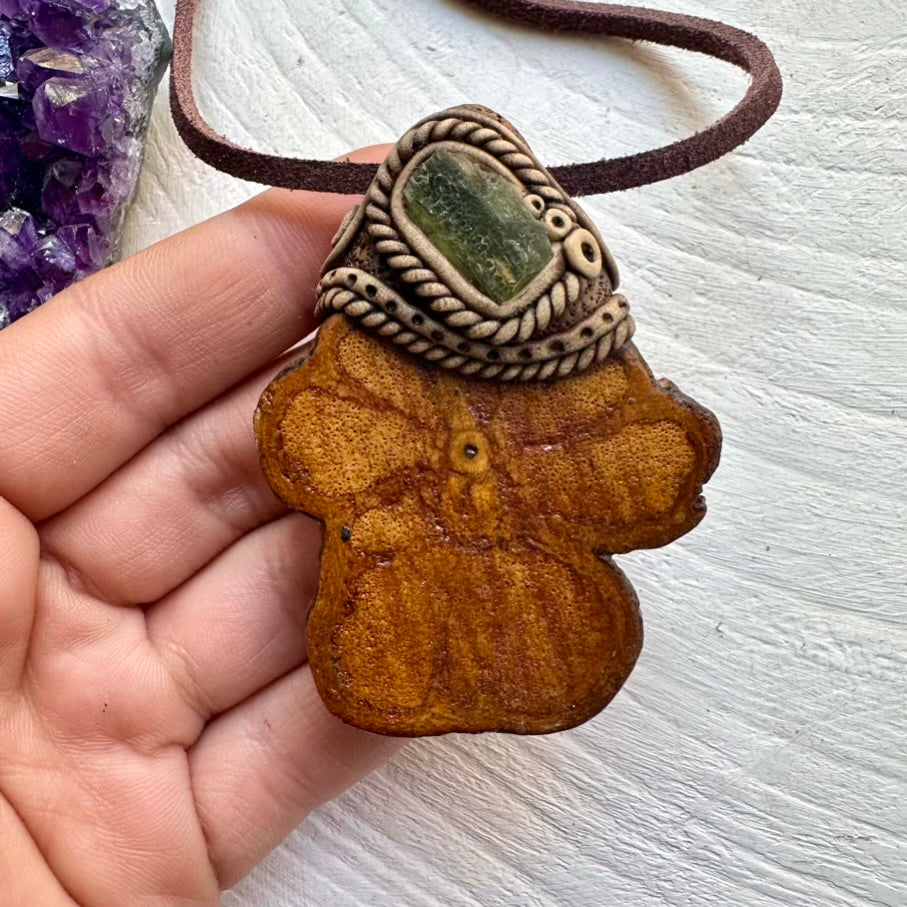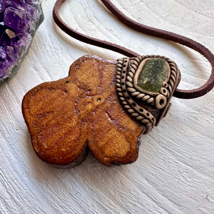 The Ayahuasca Vine and Moldavite Necklace is made with durable clay and it comes with an adjustable leather cord.