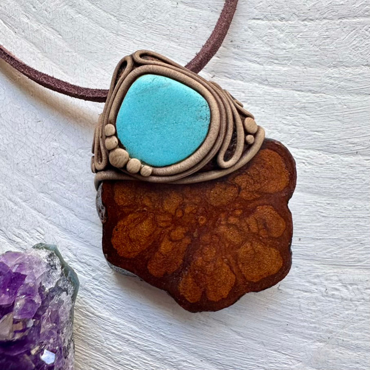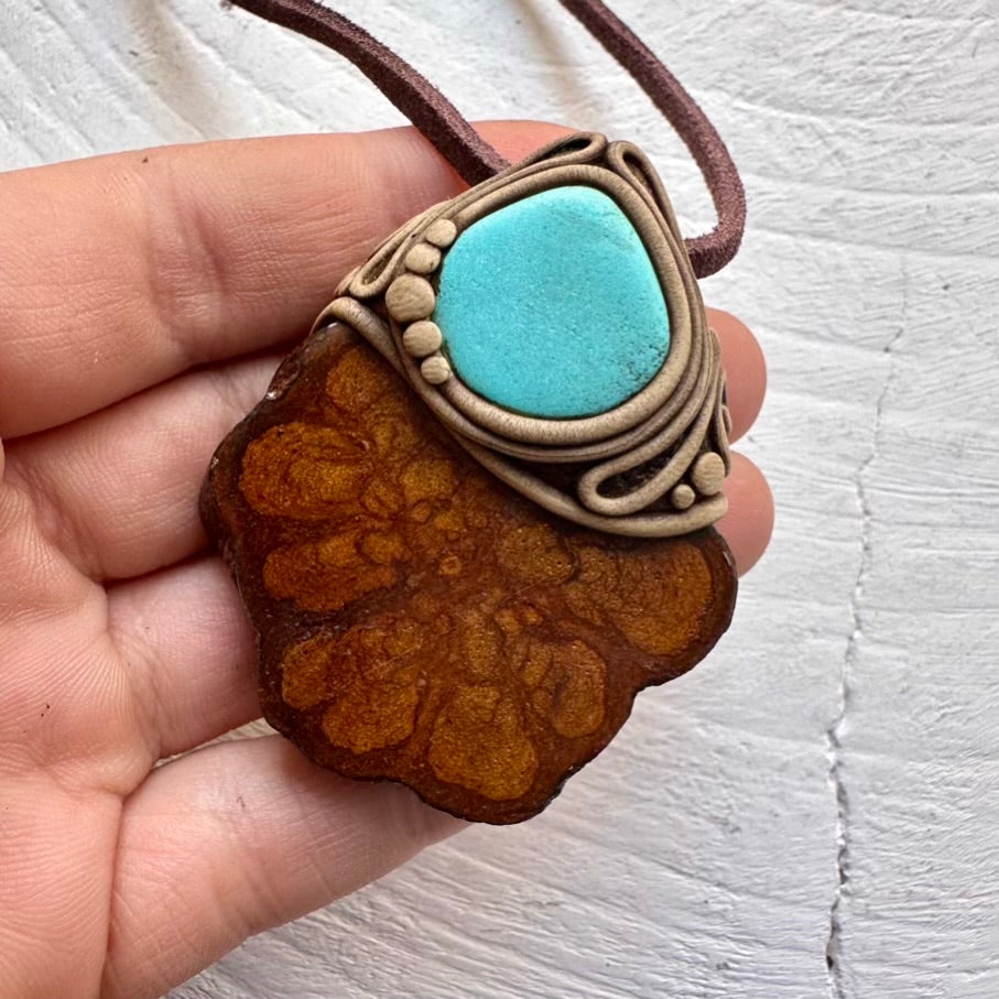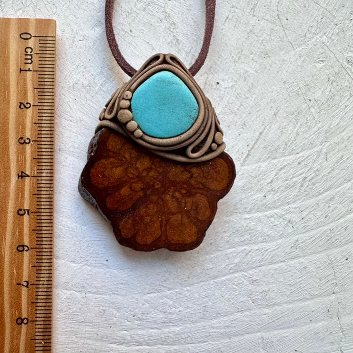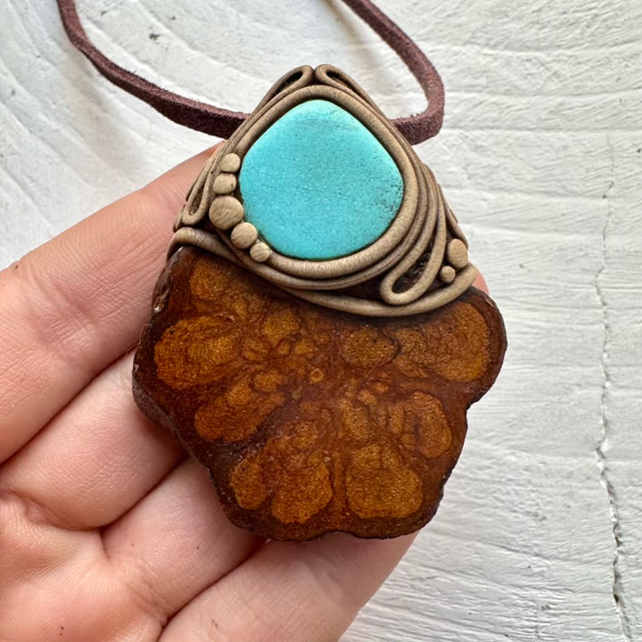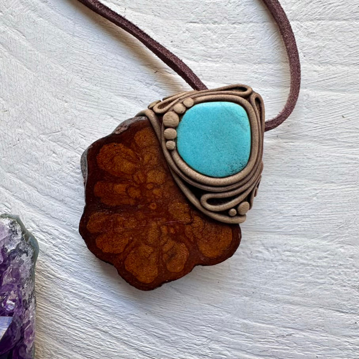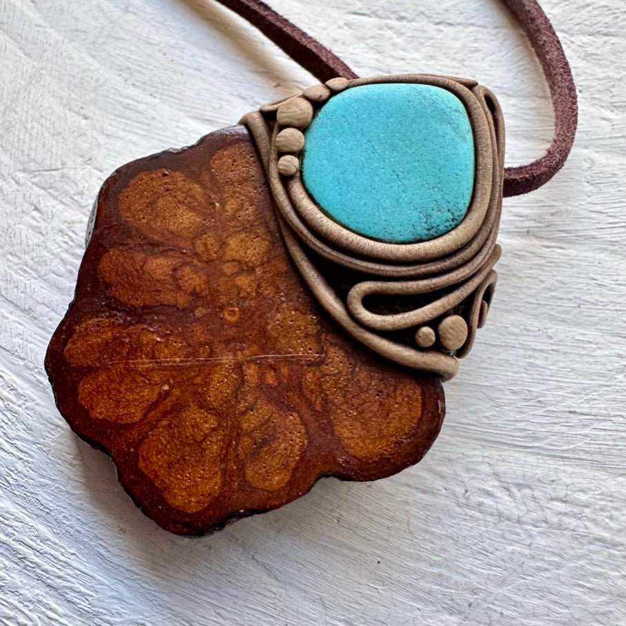The Ayahuasca Vine and Turquoise Necklace is made with durable clay and it comes with an adjustable leather cord.