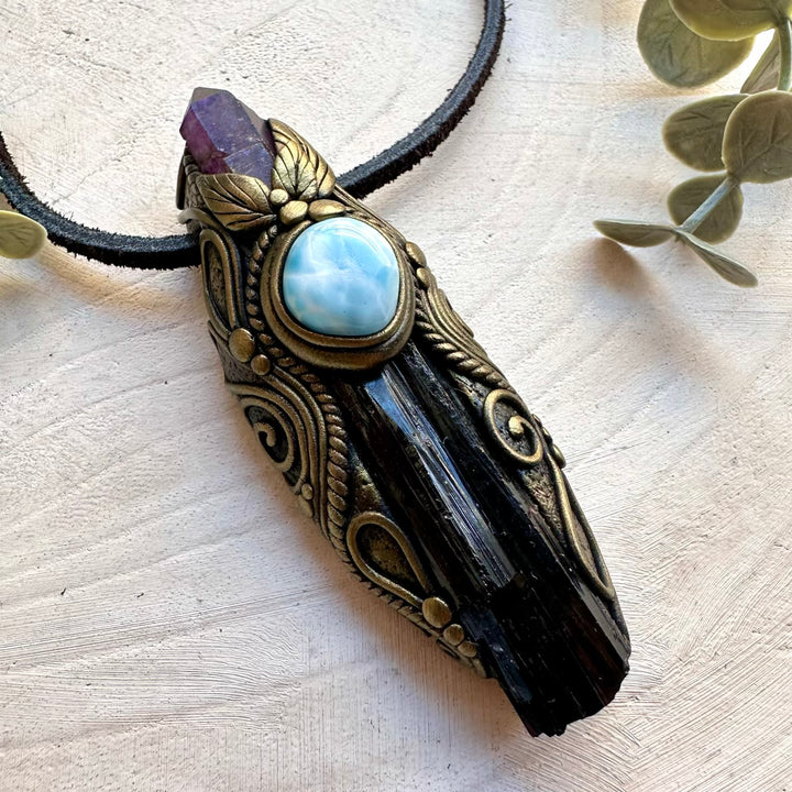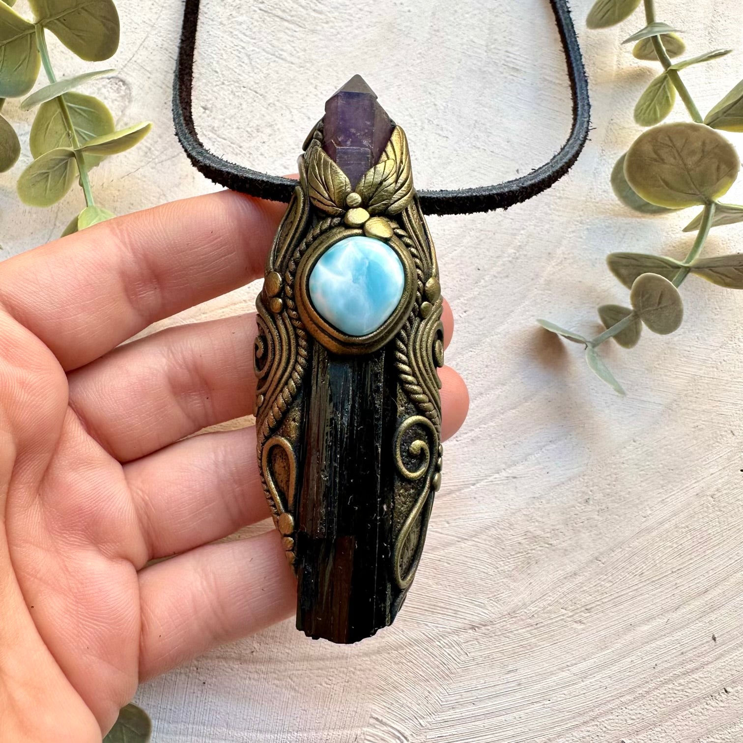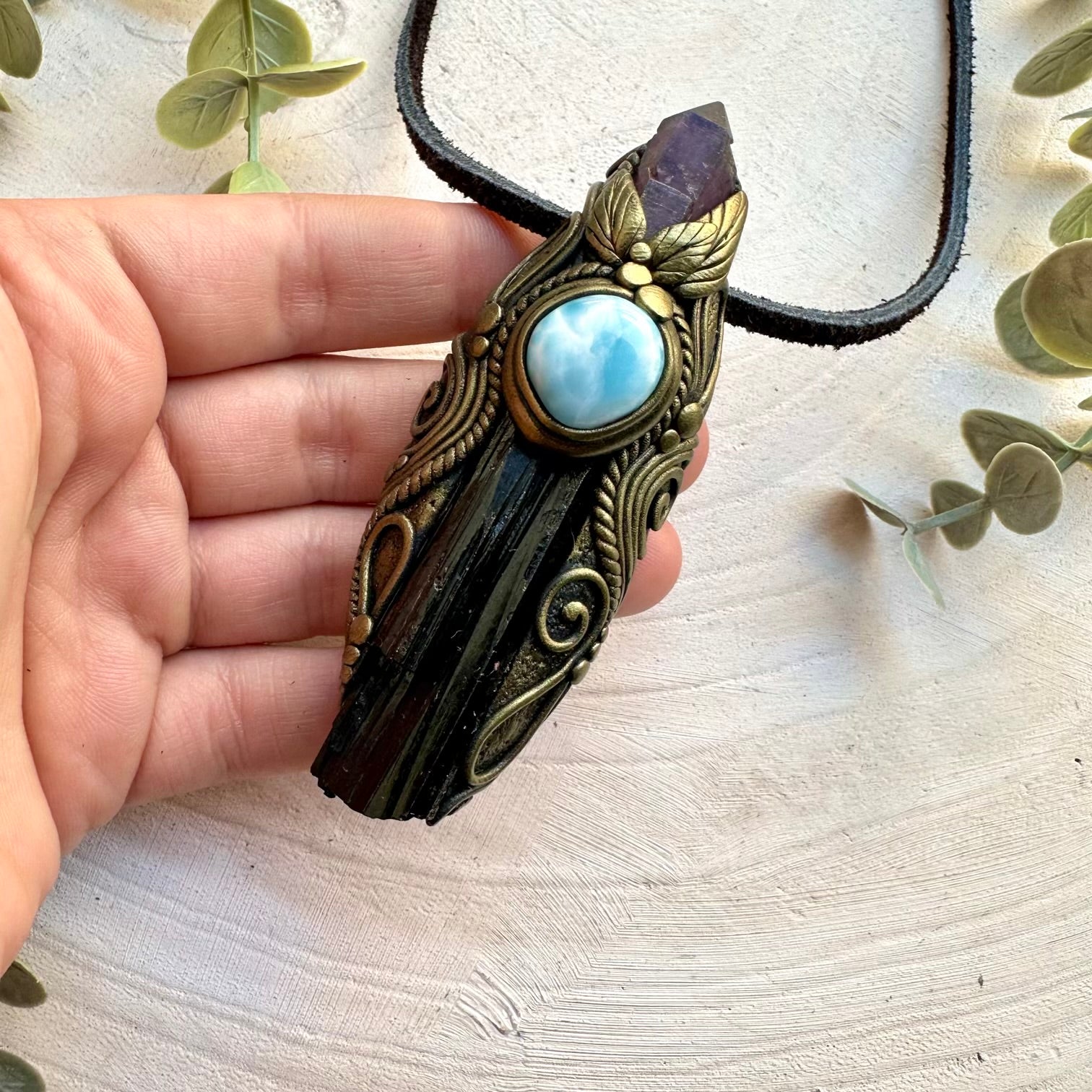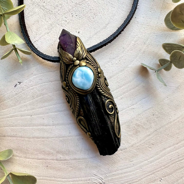 The Black Tourmaline Amethyst Point and Larimar Pendant Necklace isn’t just jewelry