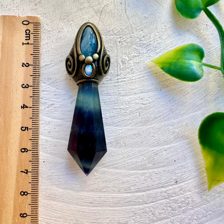 Fluorite crystal pendant paired with Aquamarine and Australian Opal