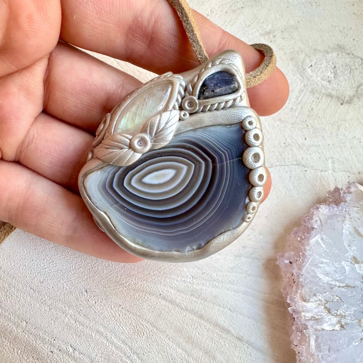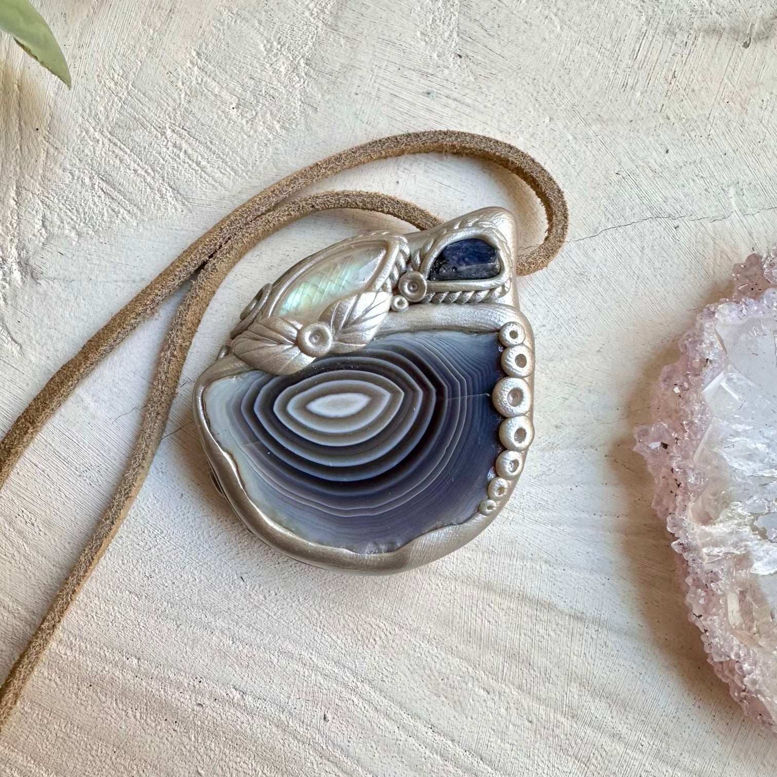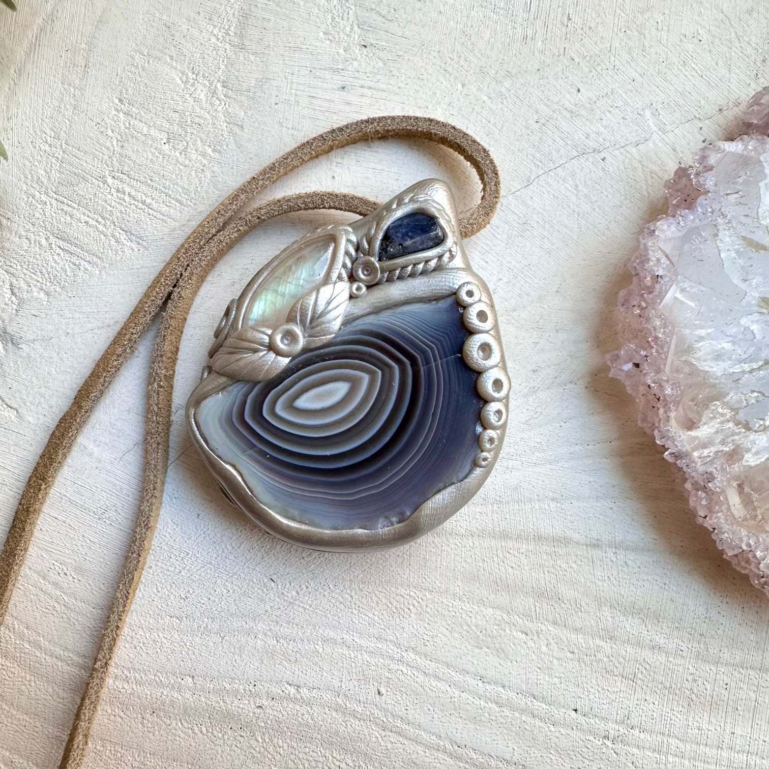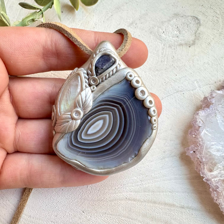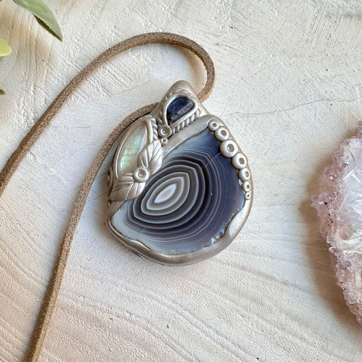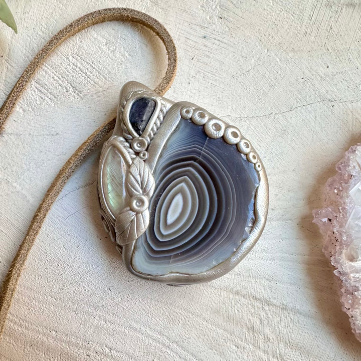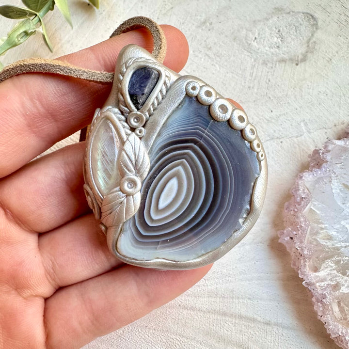 The Botswana Agate Rainbow Moonstone and Raw Tanzanite Necklace, Healing Crystal Pendant is made with durable clay and it comes with adjustable leather cord.