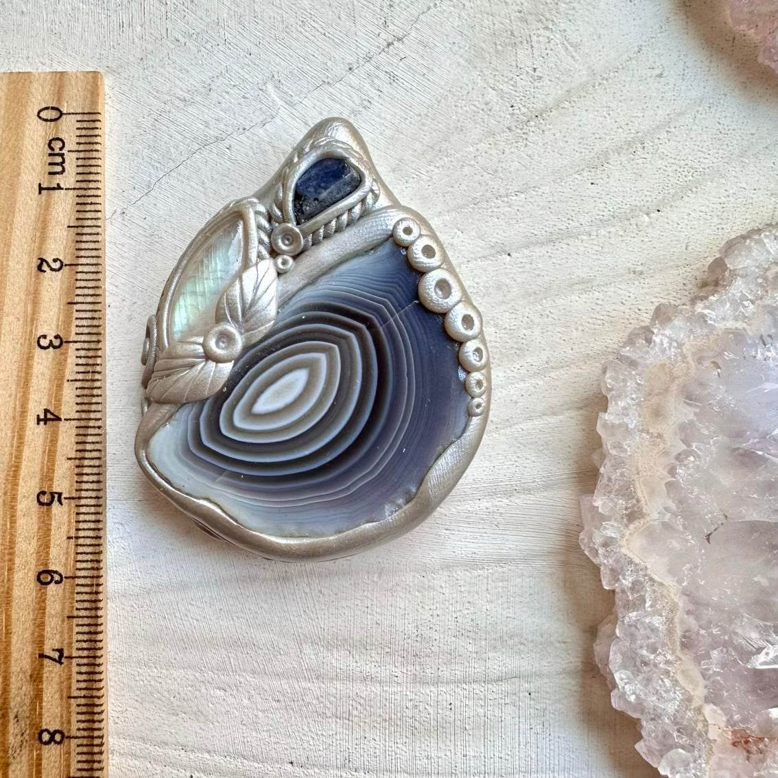 Fragile handcrafted elements. Polymer clay details, handcrafted mounts, metal components, and crystal settings can break if bent, dropped, or exposed to force. Please handle with care.