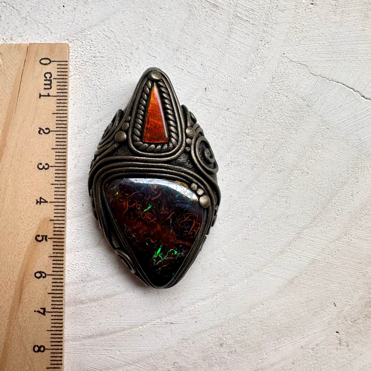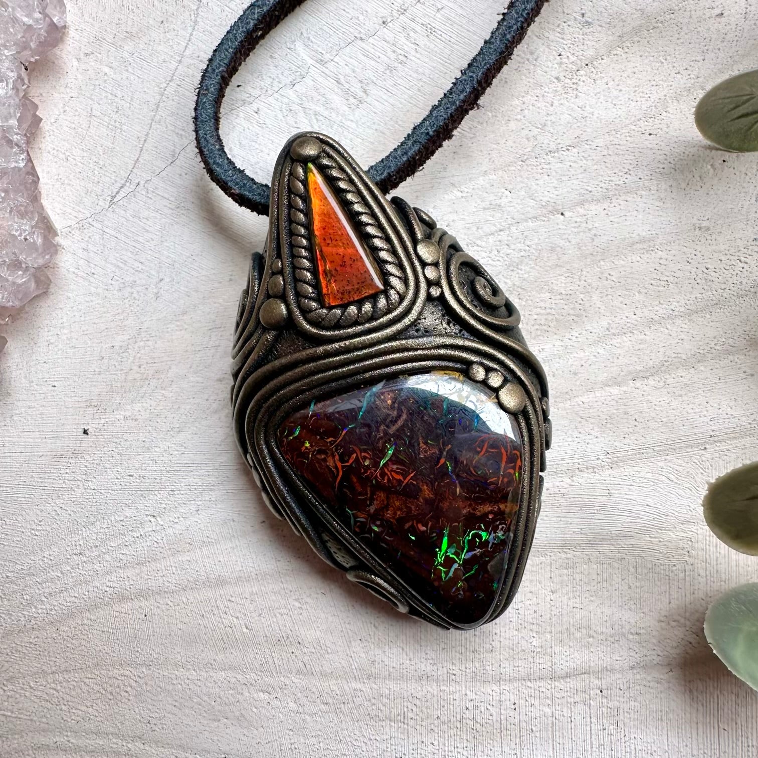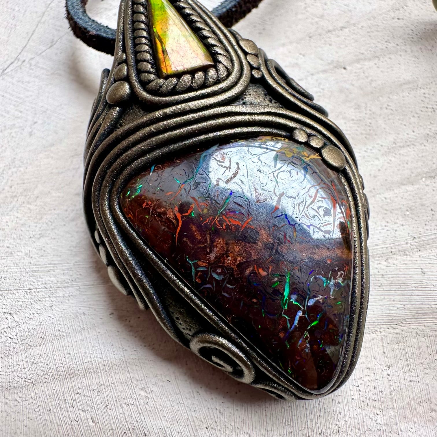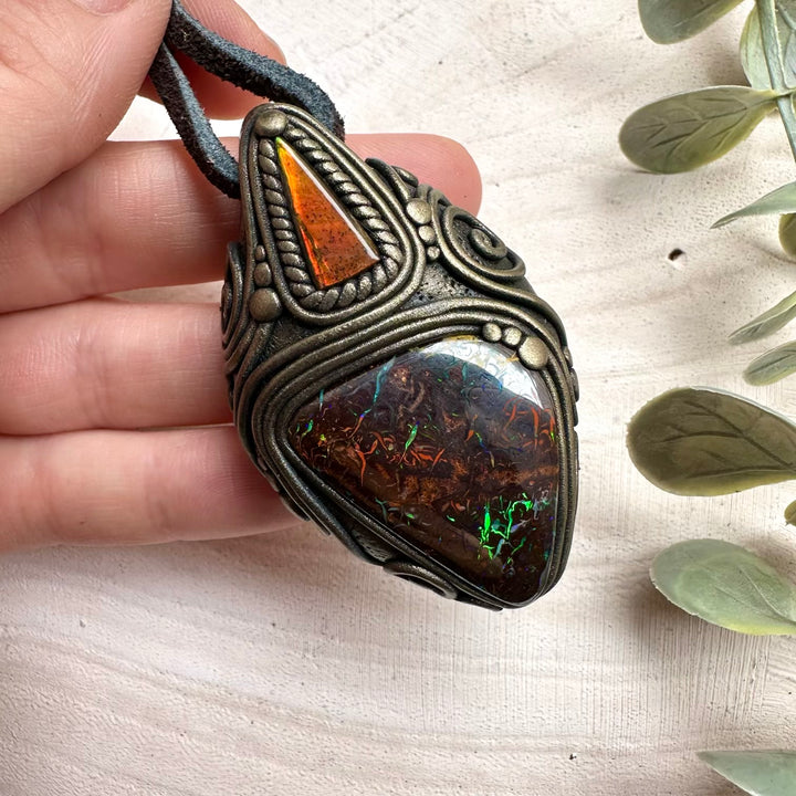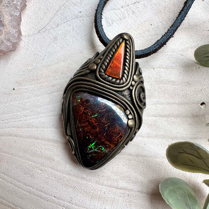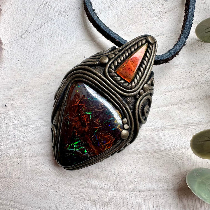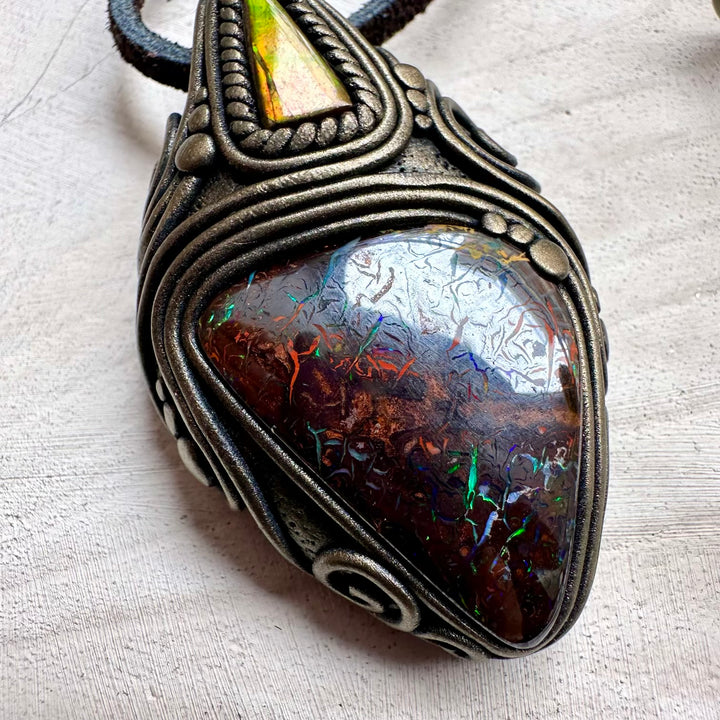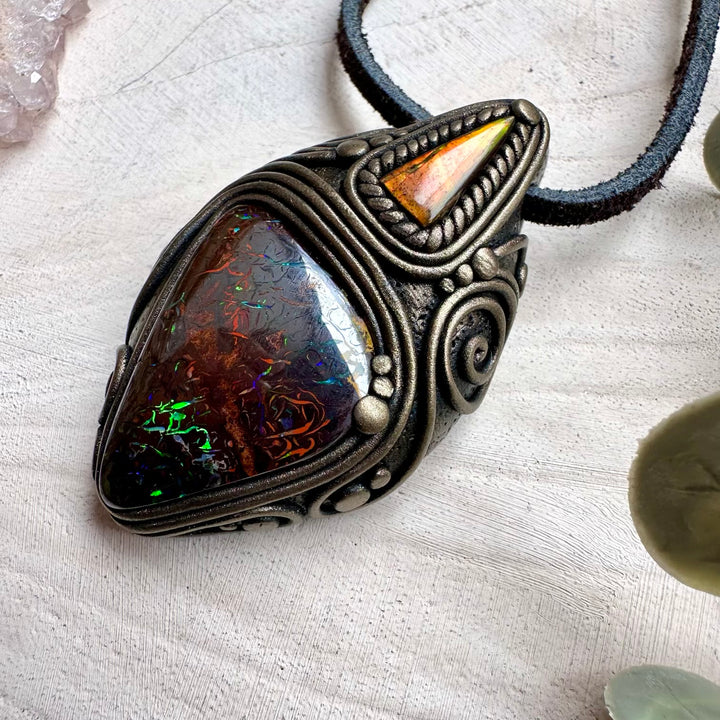 Boulder Opal and Ammolite Pendant, Unique Handmade Necklace