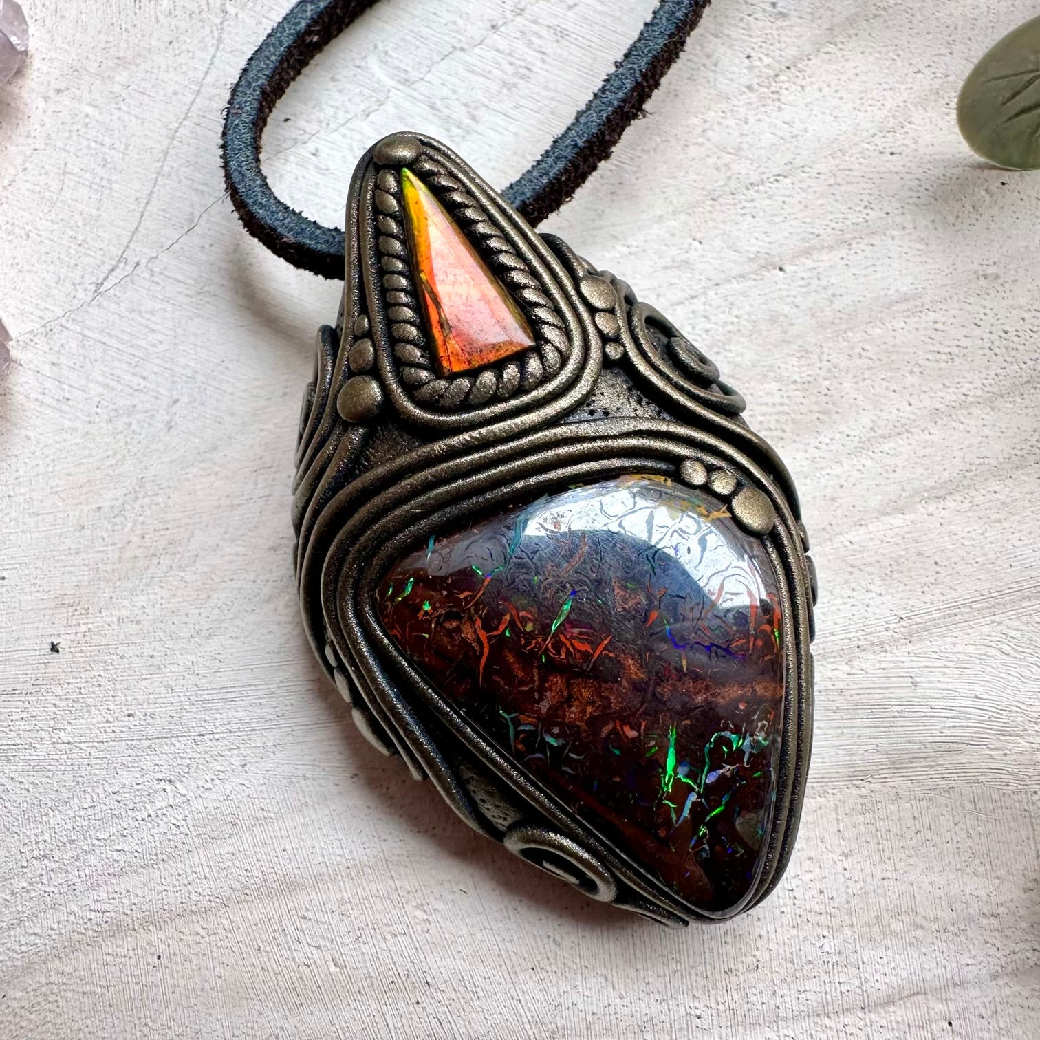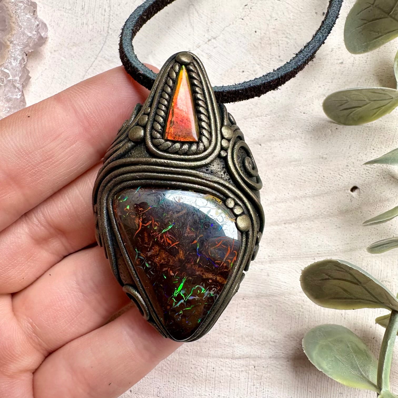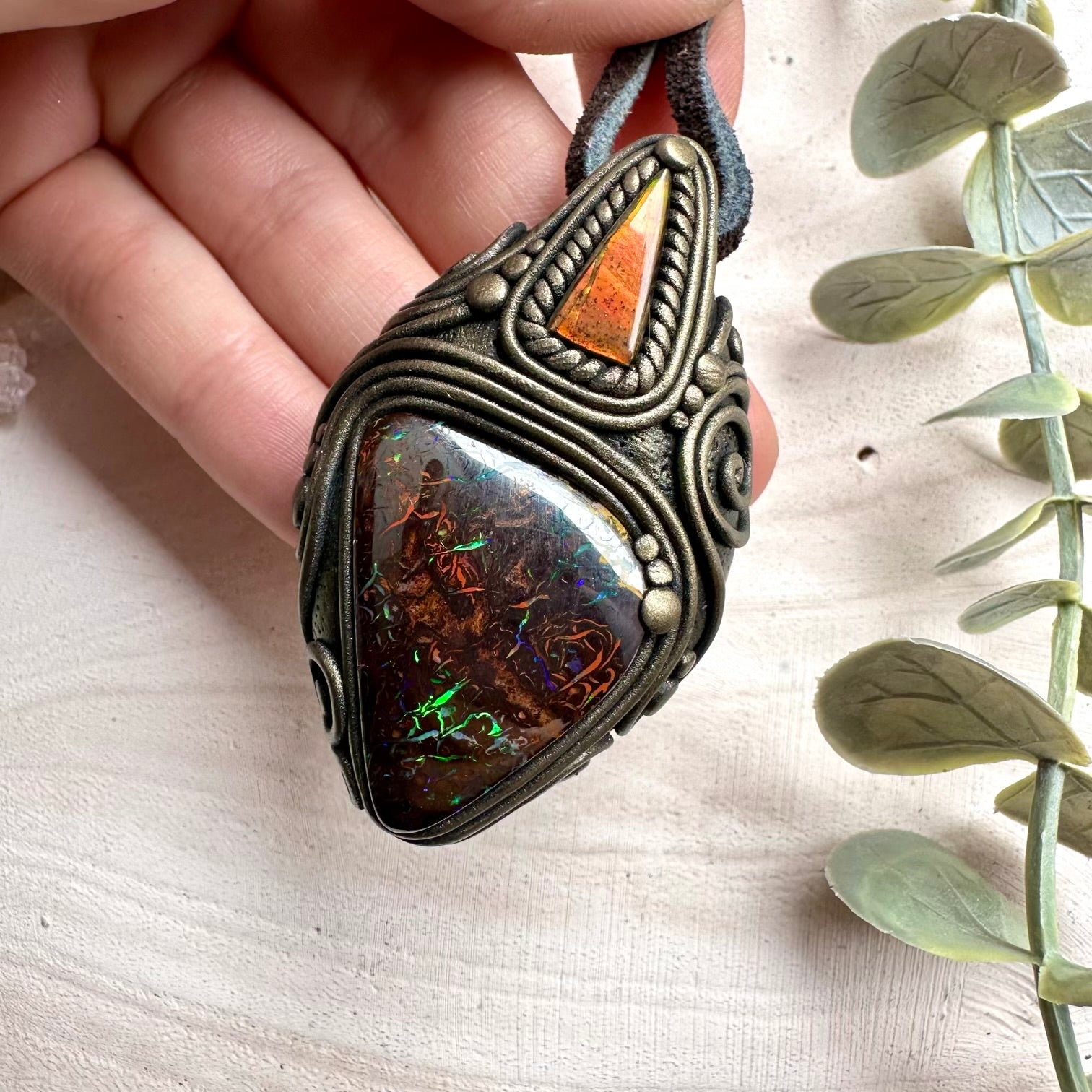 The Boulder Opal and Ammolite Pendant, Unique Handmade Necklace is made with durable clay and it comes with adjustable leather cord.