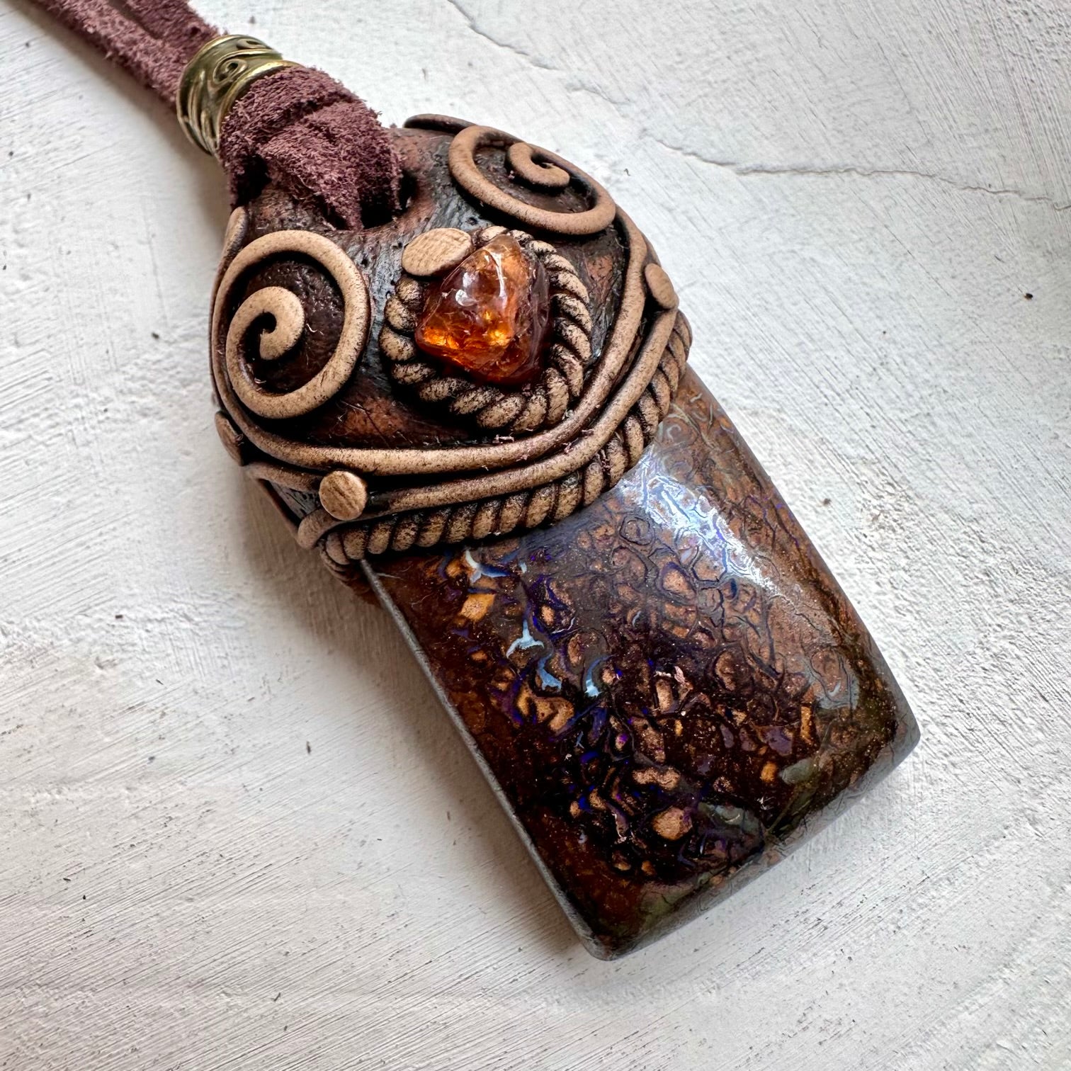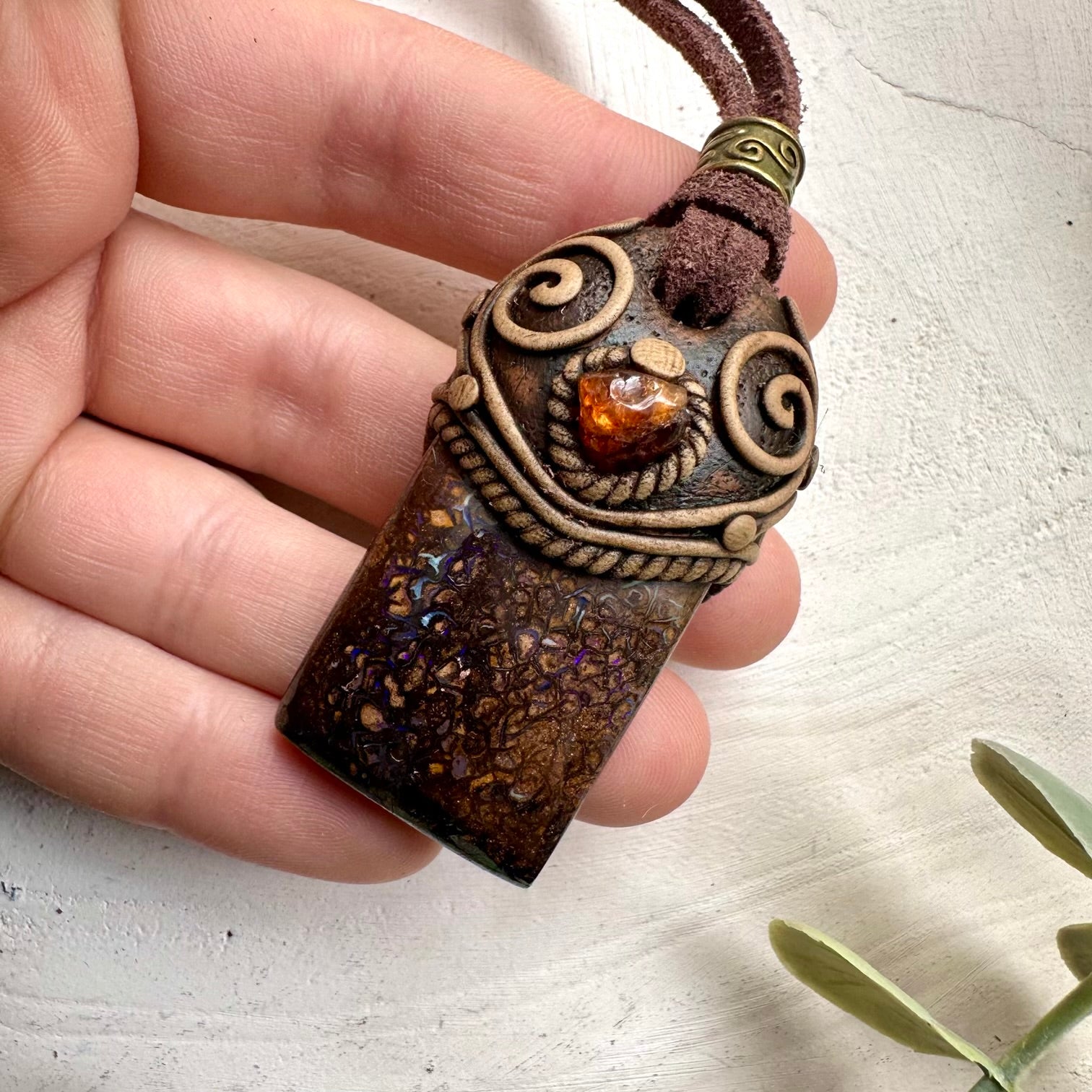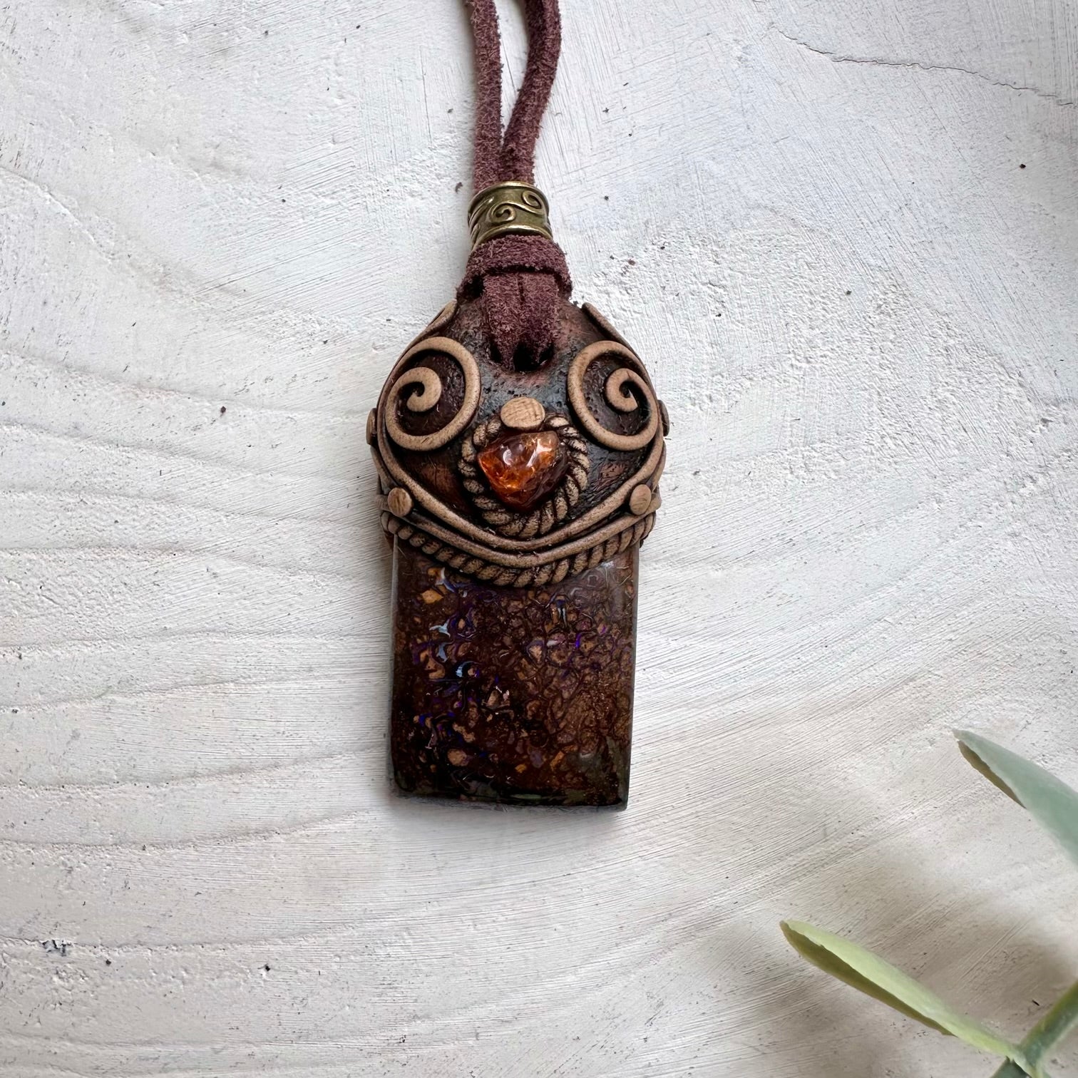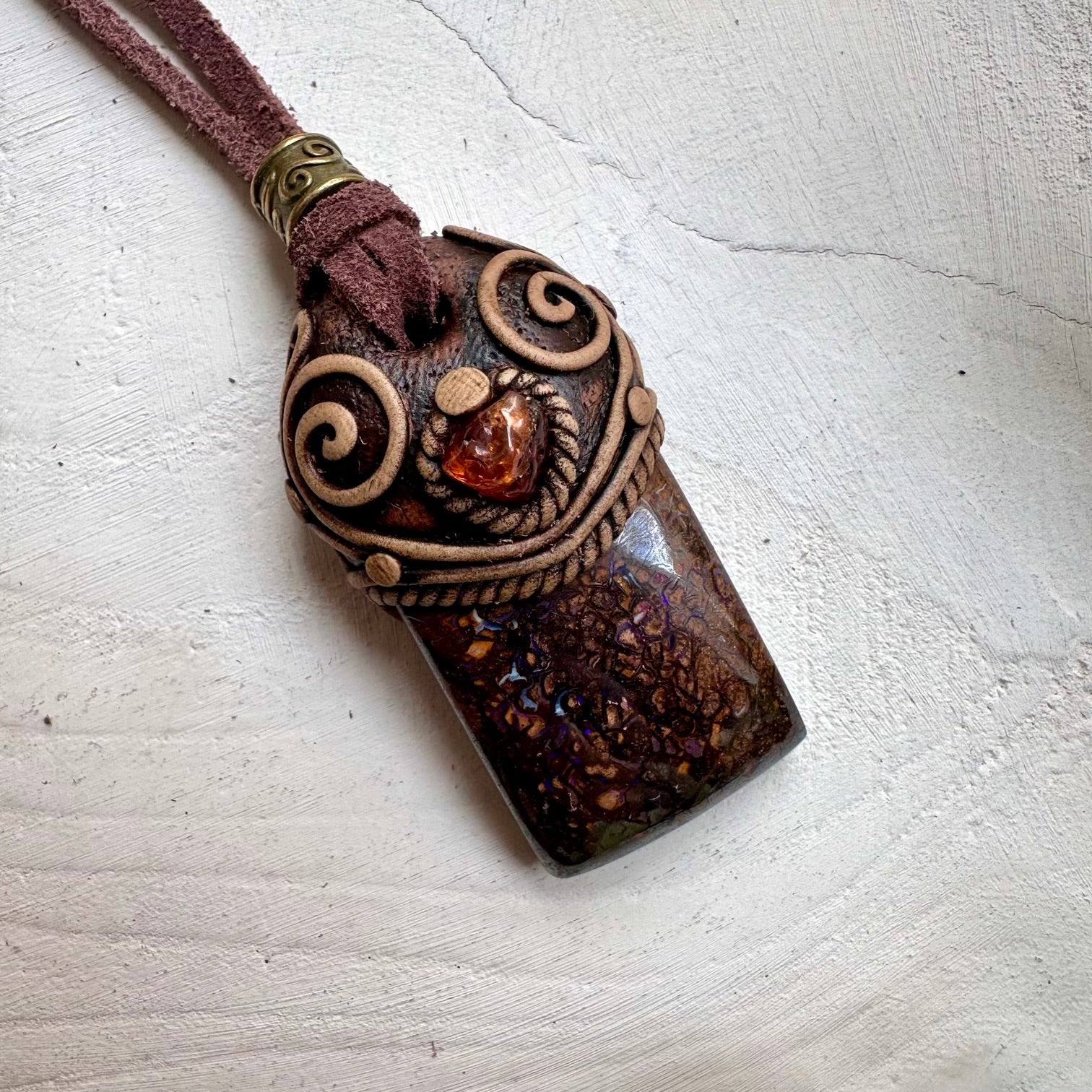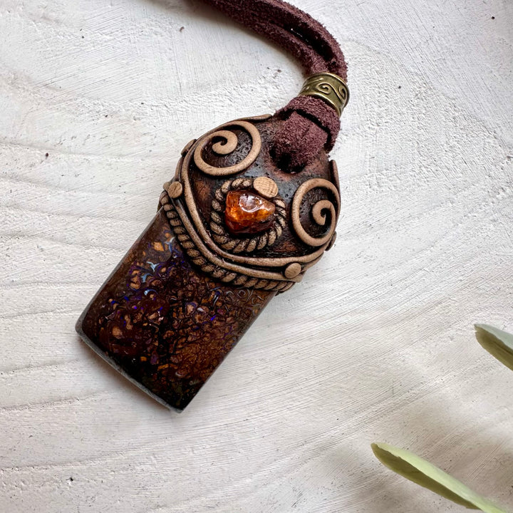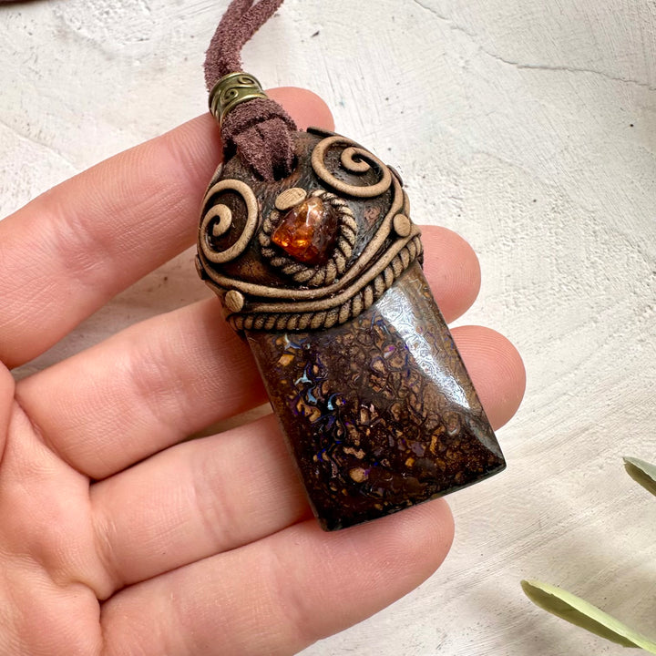 The Boulder Opal and Hessonite Garnet Necklace Unisex Handmade Jewelry is made with durable clay and it comes with adjustable leather cord.