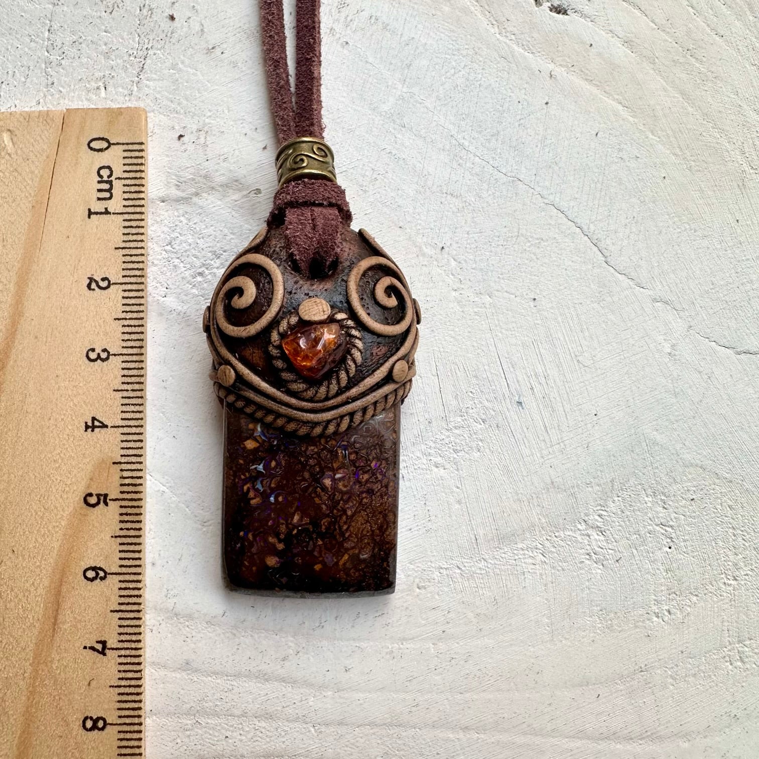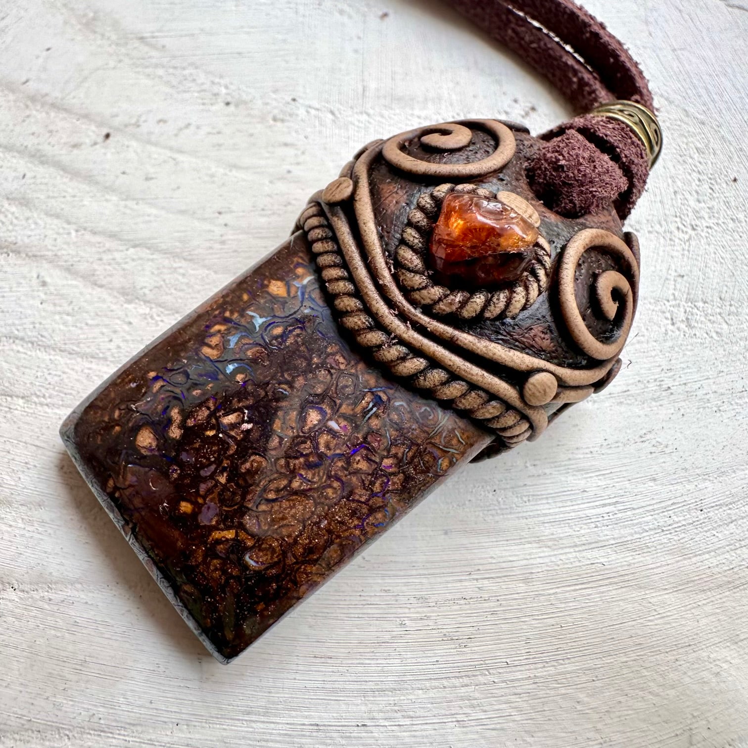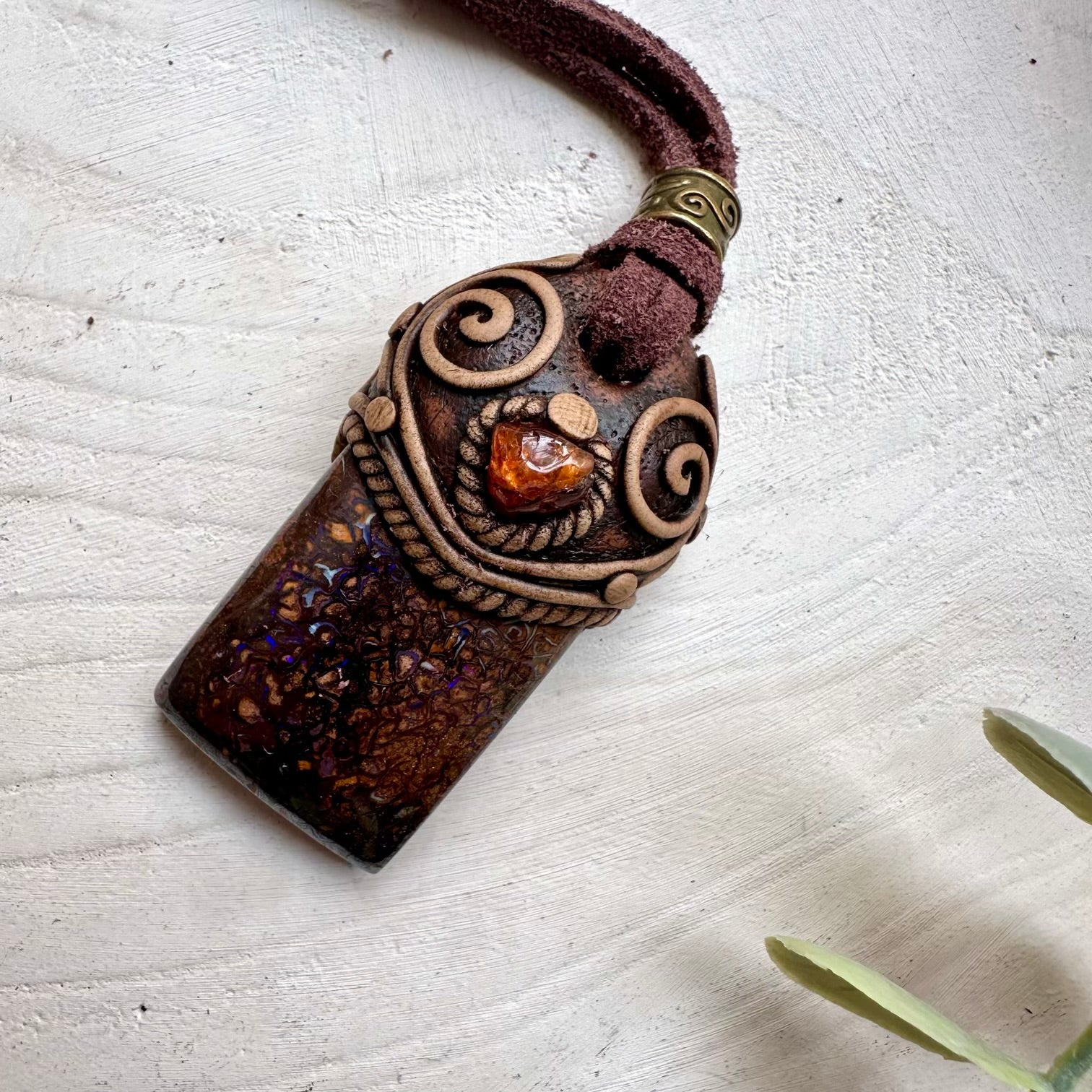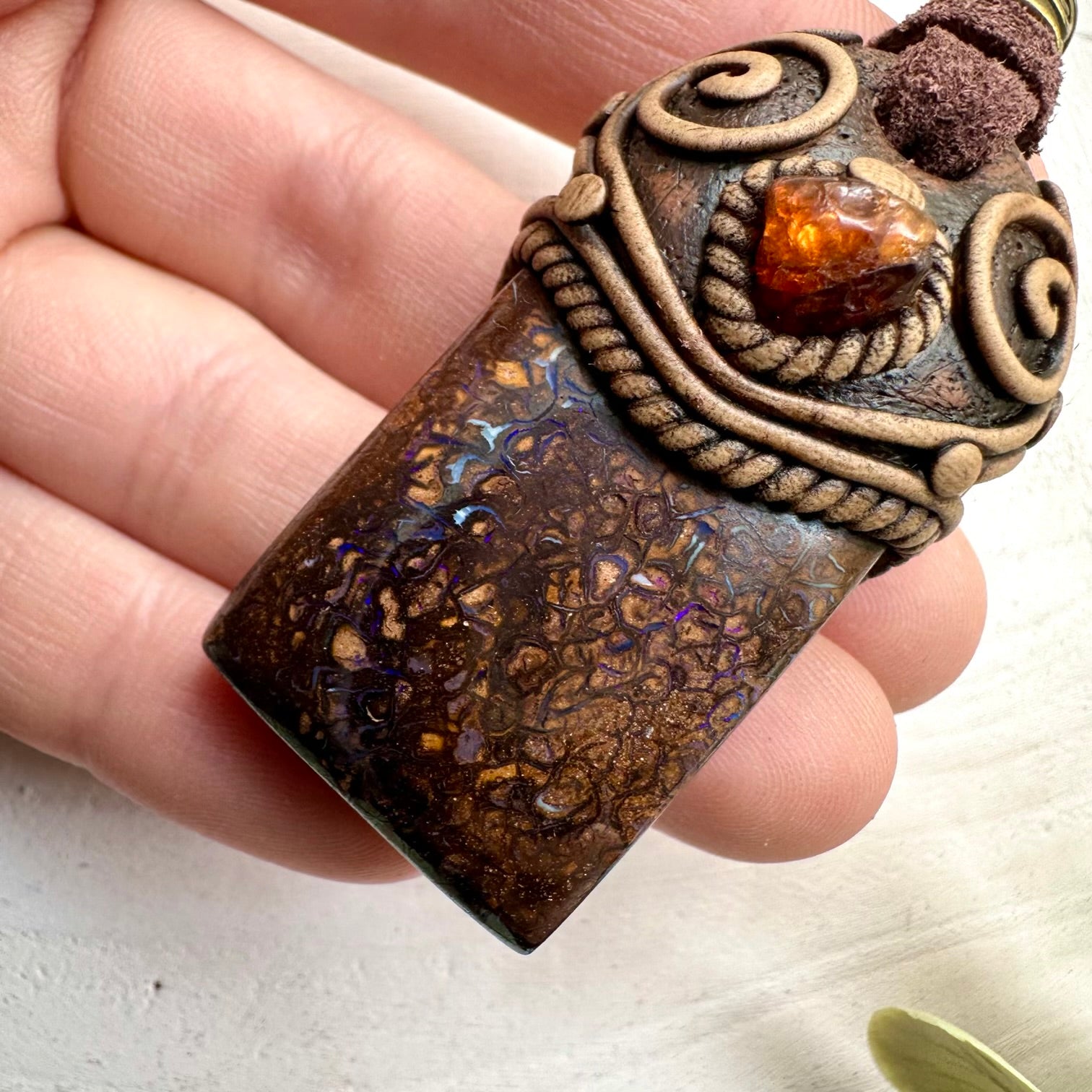The Boulder Opal and Hessonite Garnet Necklace Unisex Handmade Jewelry is made with durable clay and it comes with adjustable leather cord.