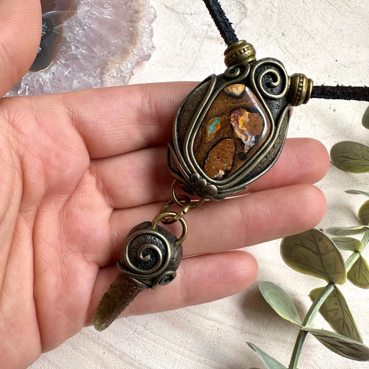 The Boulder Opal and Moldavite Pendant Necklace is made with durable clay and it comes with adjustable leather cord.