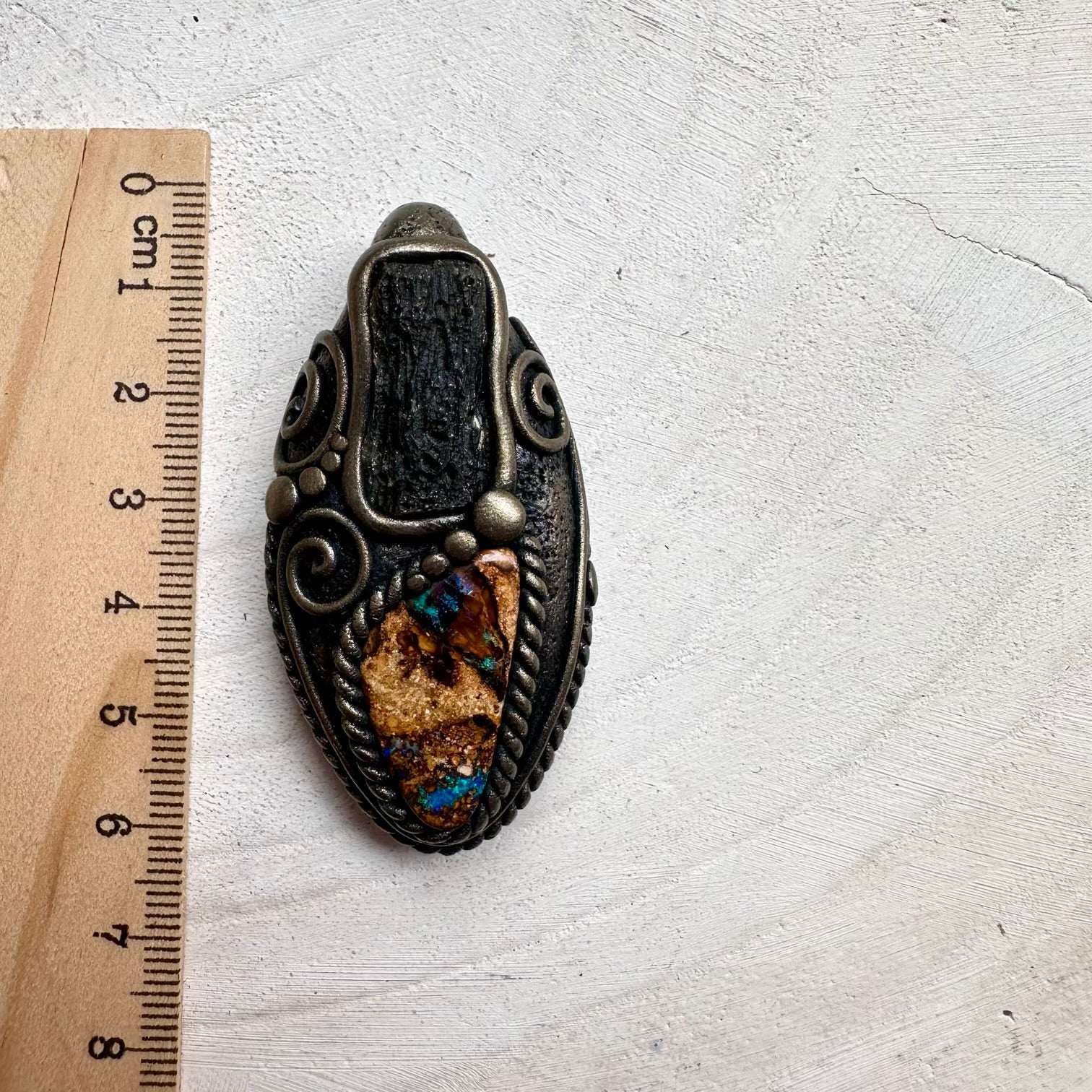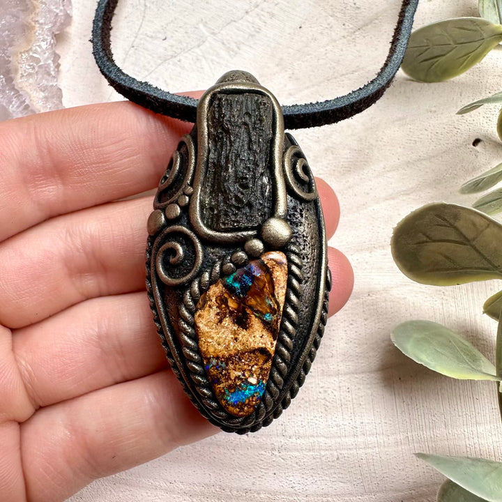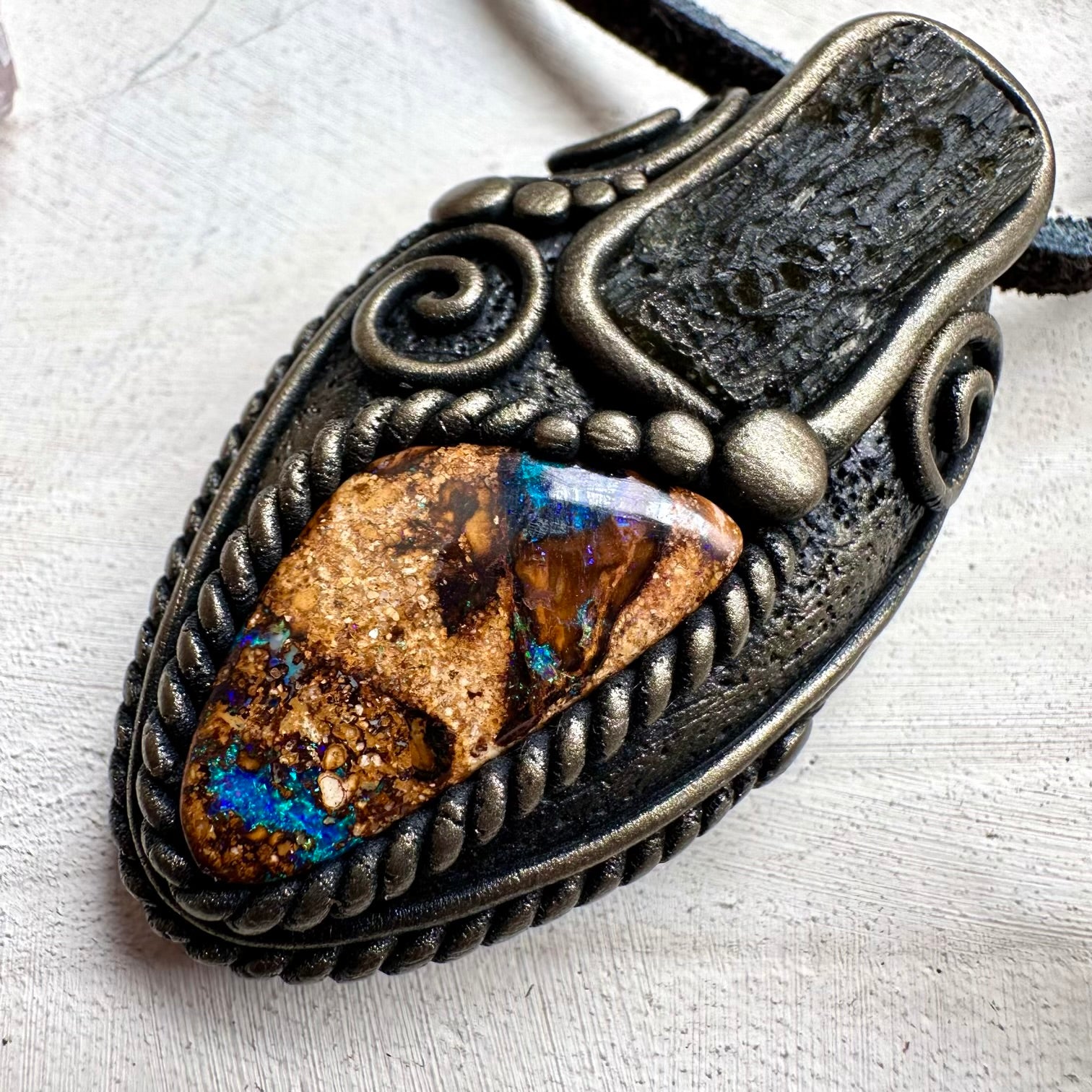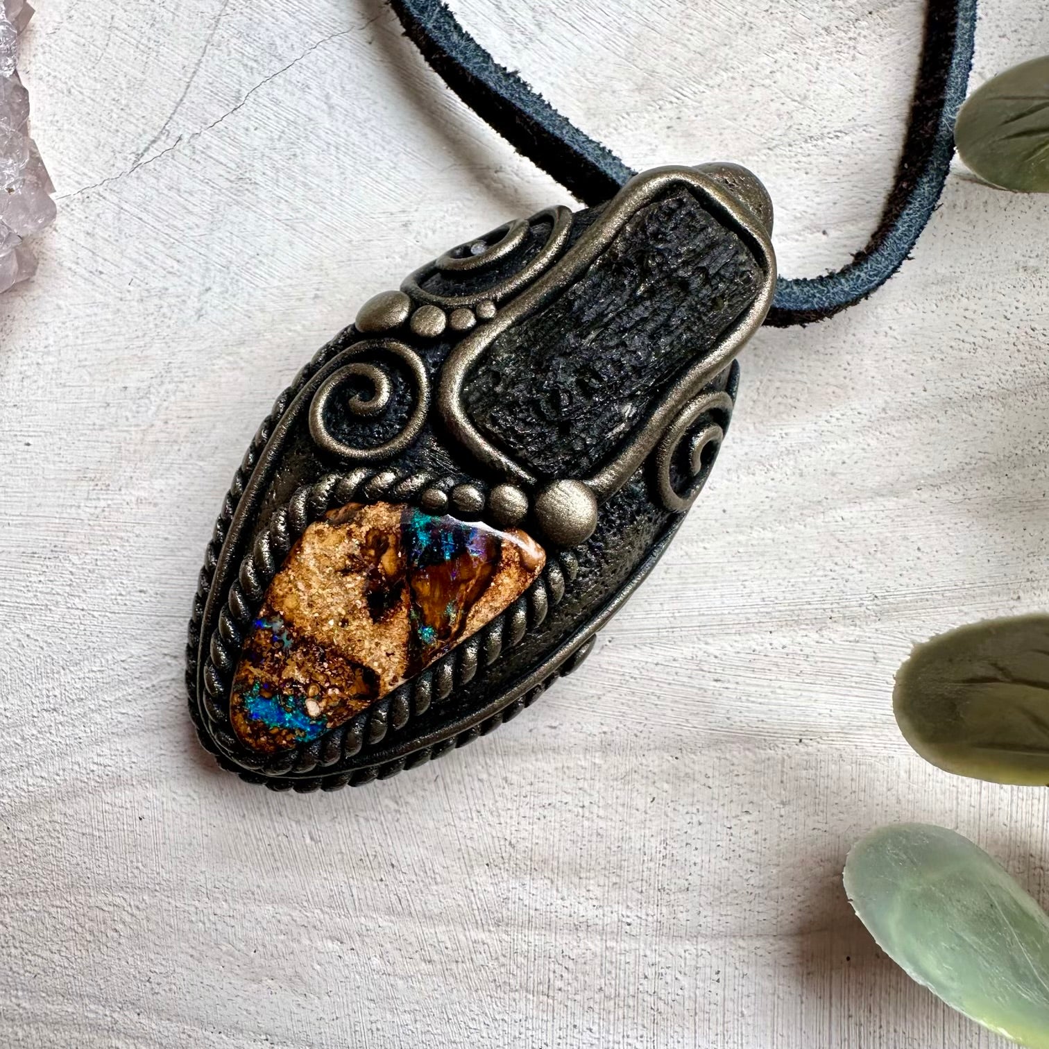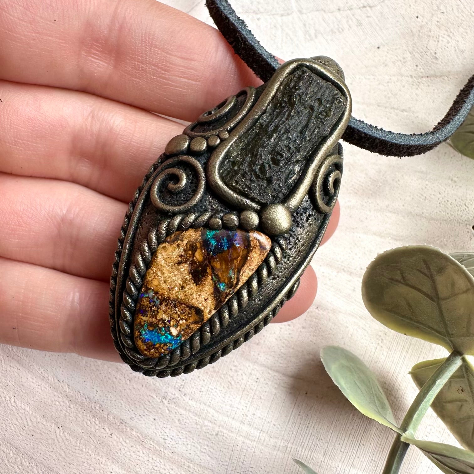Fragile handcrafted elements. Polymer clay details, handcrafted mounts, metal components, and crystal settings can break if bent, dropped, or exposed to force. Please handle with care.