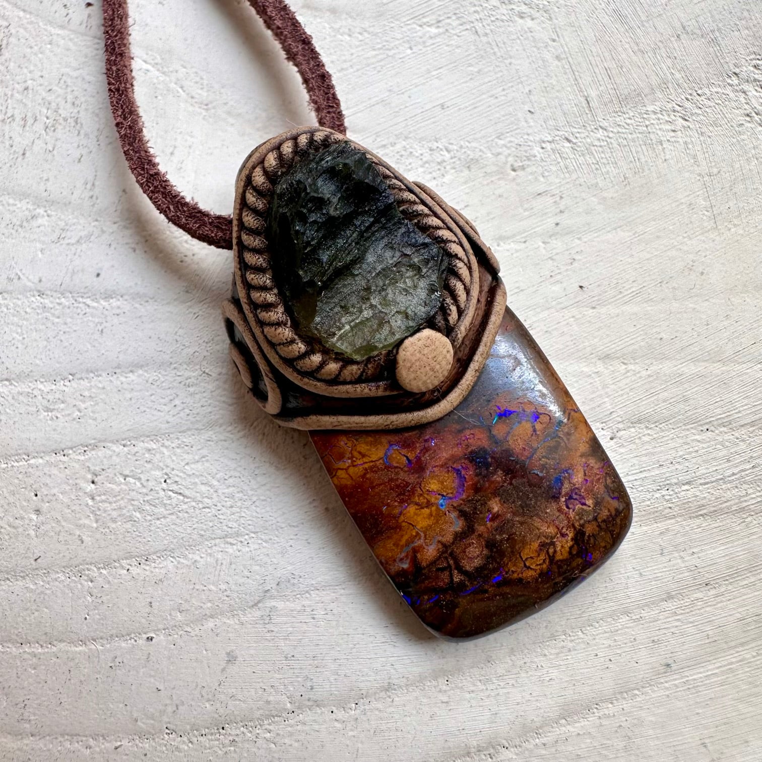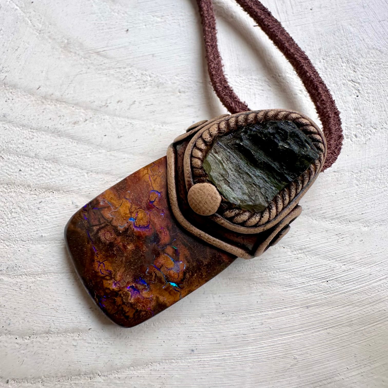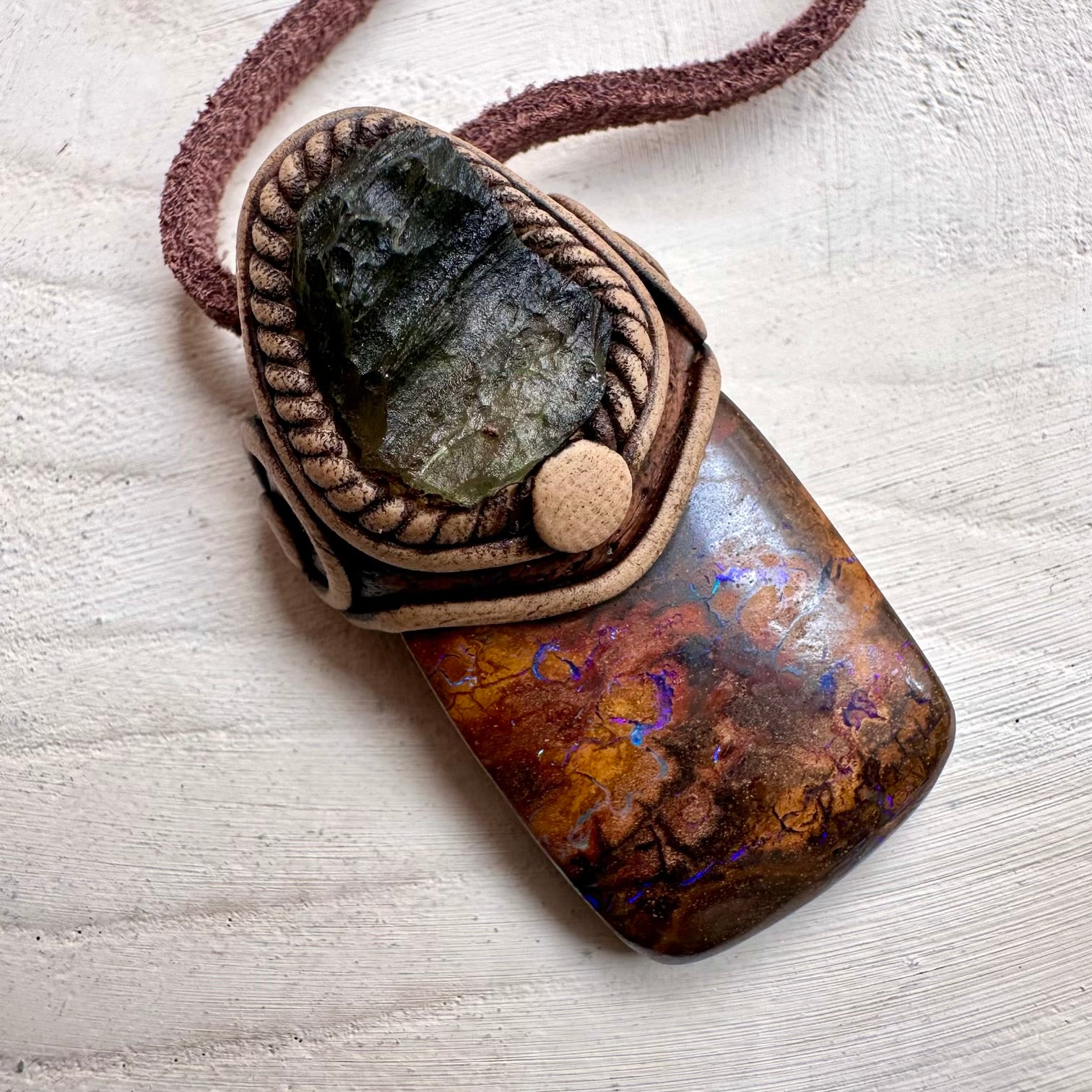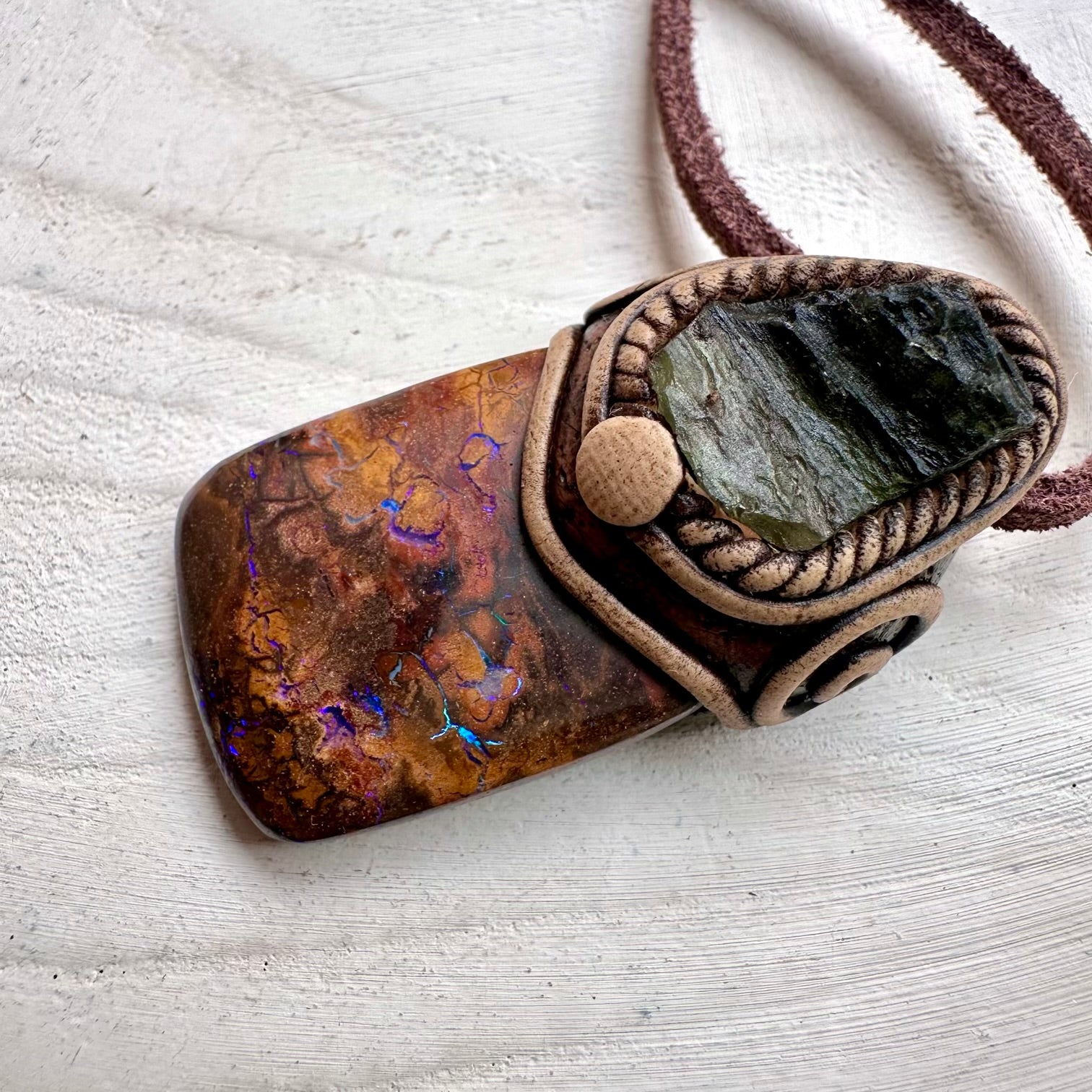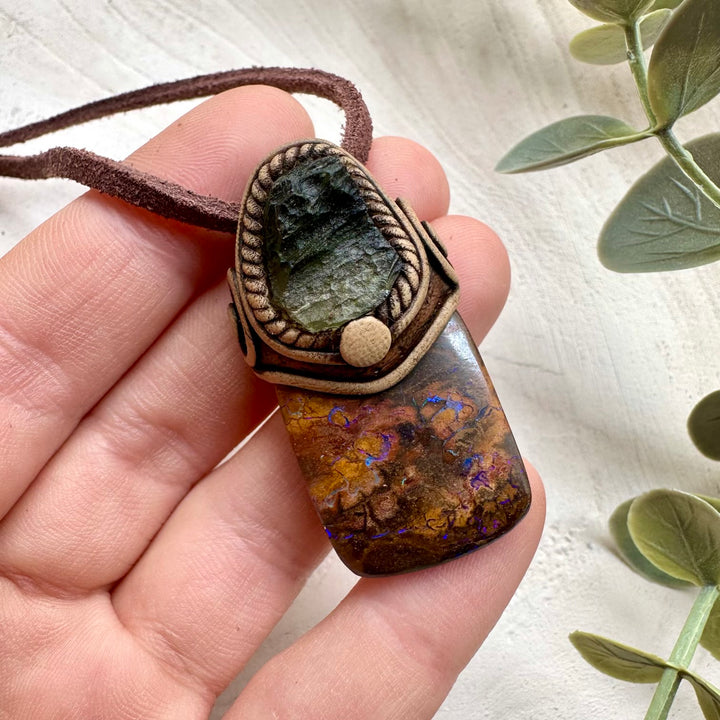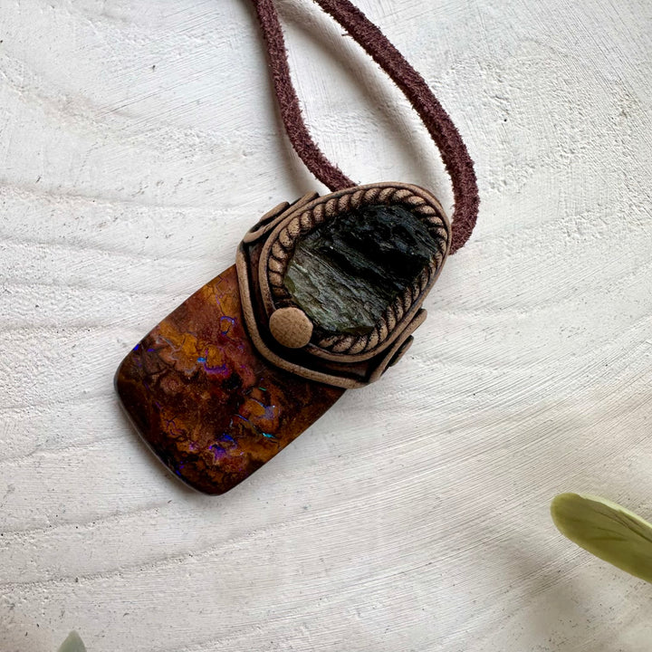 The Boulder Opal and Raw Moldavite Necklace, One of a kind Jewelry is made with durable clay and it comes with adjustable leather cord.