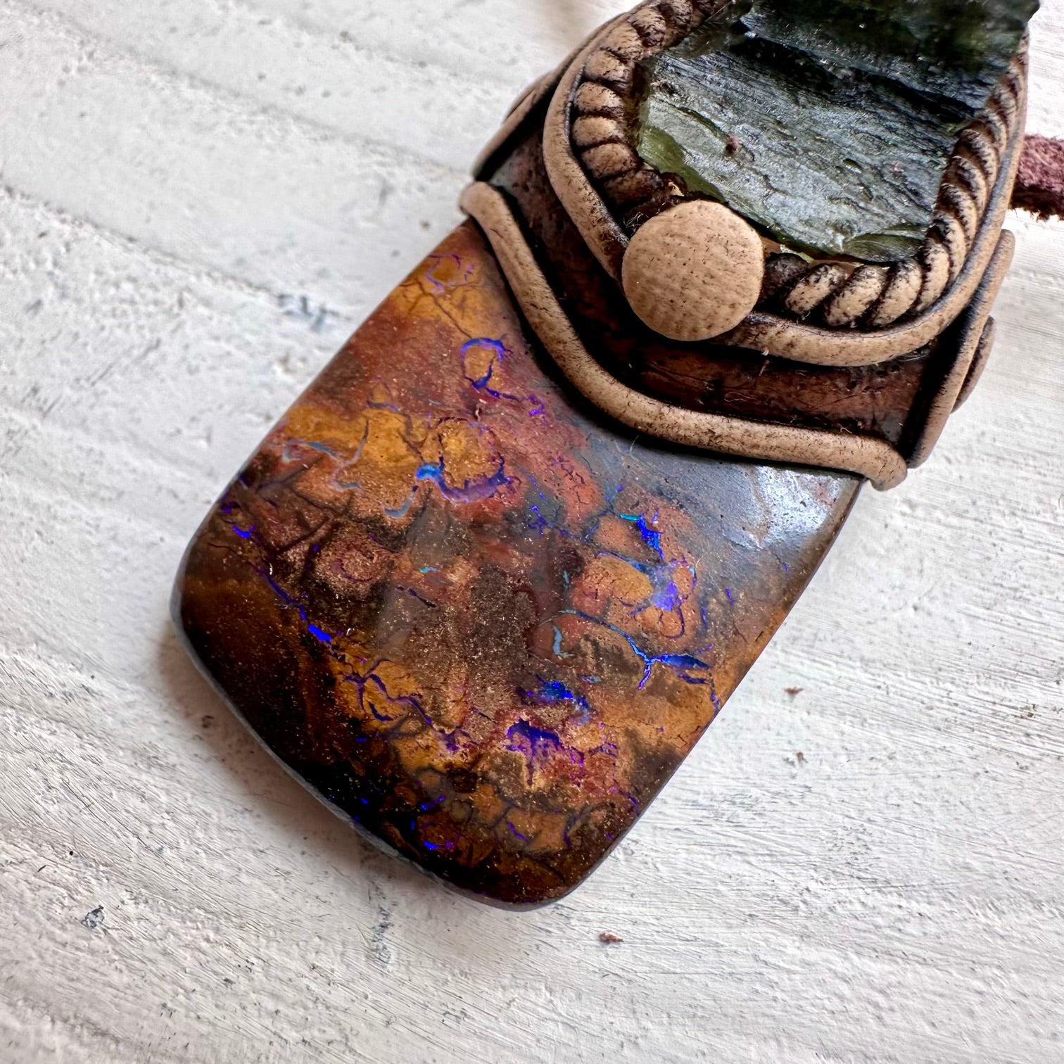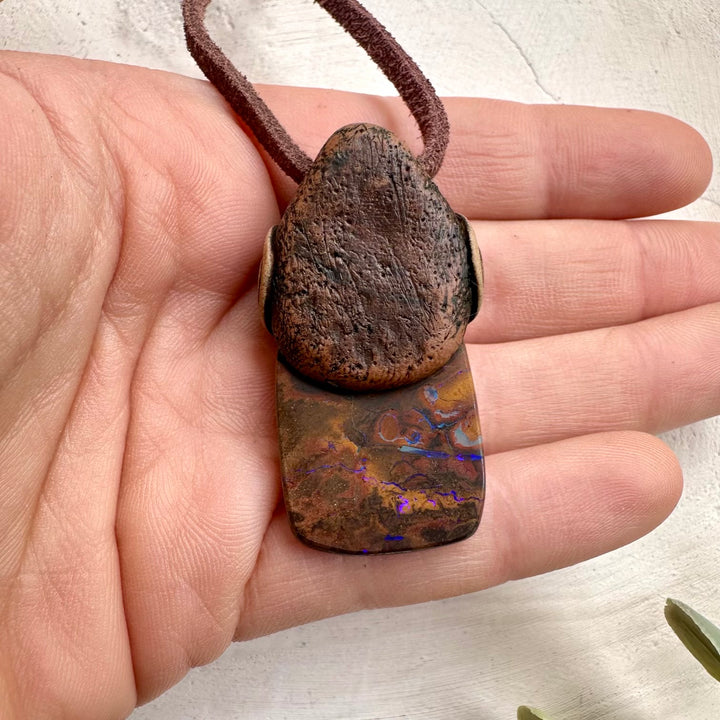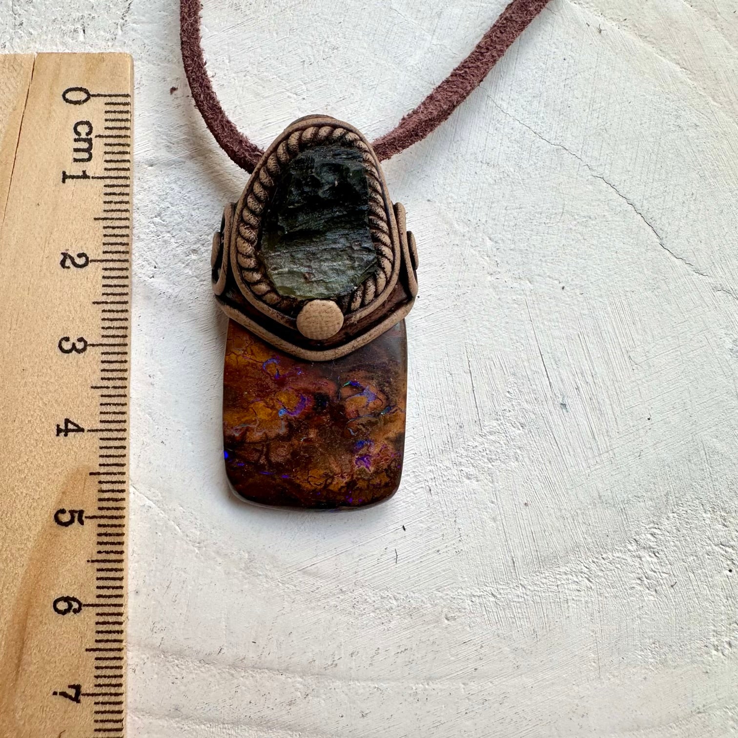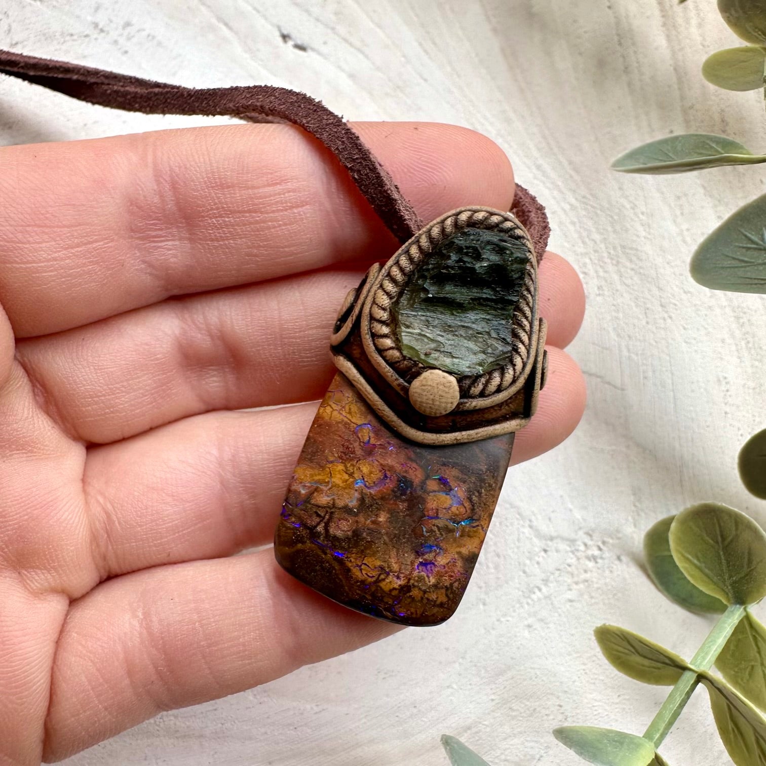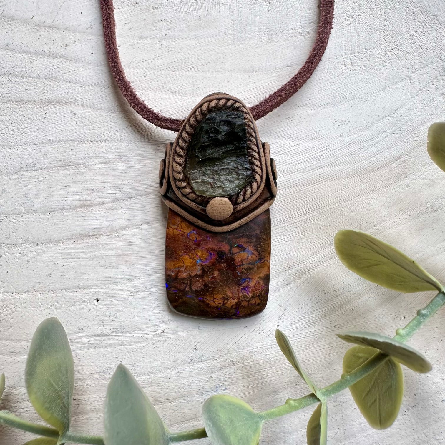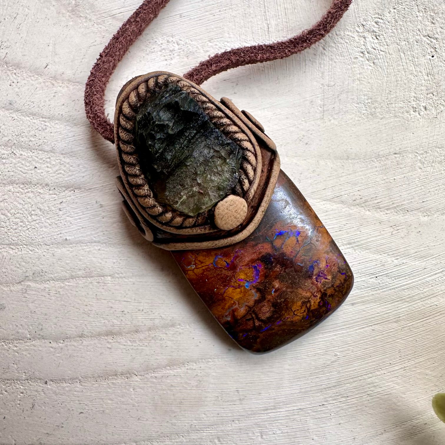 The Boulder Opal and Raw Moldavite Necklace, One of a kind Jewelry is made with durable clay and it comes with adjustable leather cord.