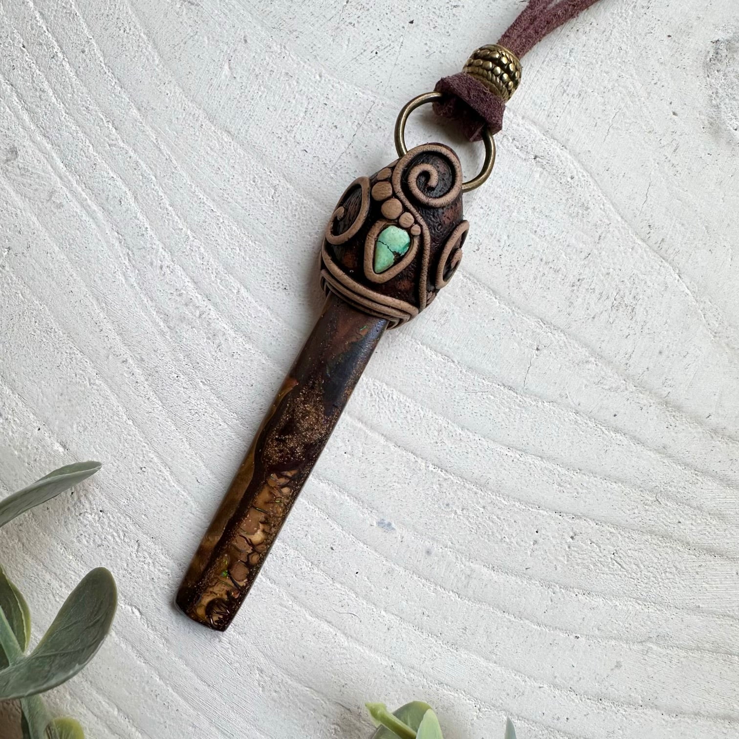 The Boulder Opal and Tibetan Turquoise Pendant Necklace is made with durable clay and it comes with adjustable leather cord.