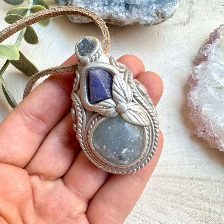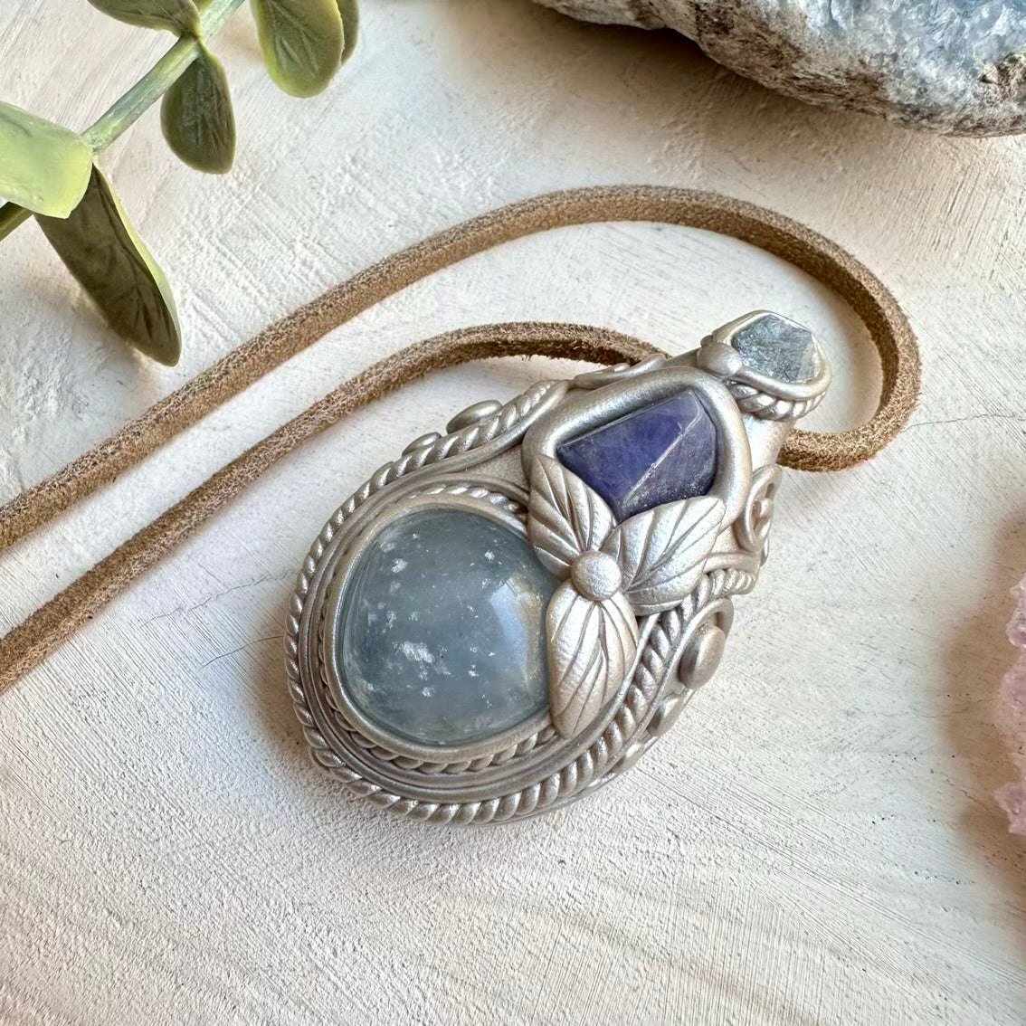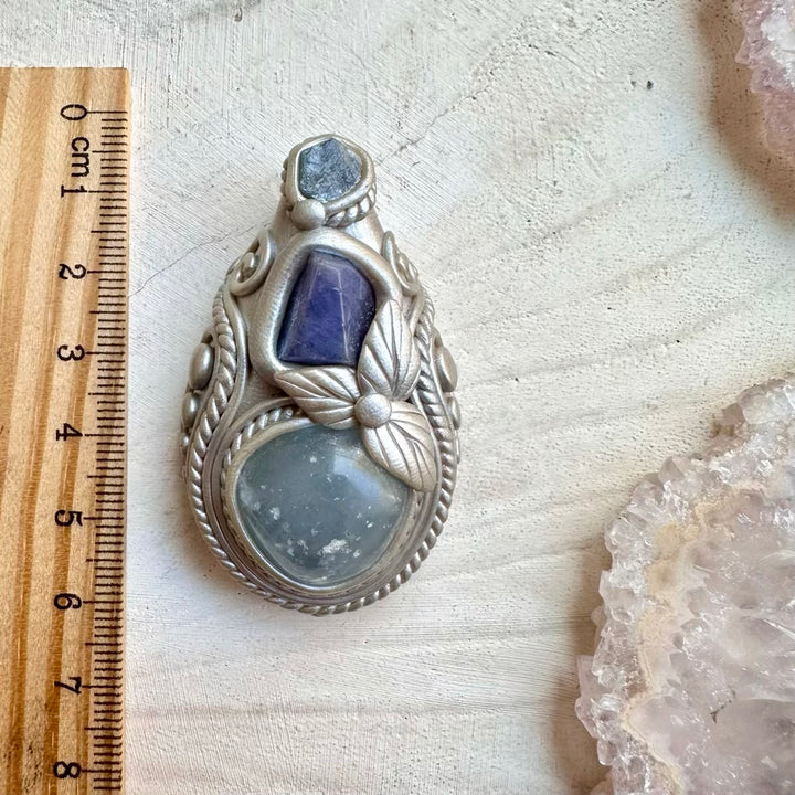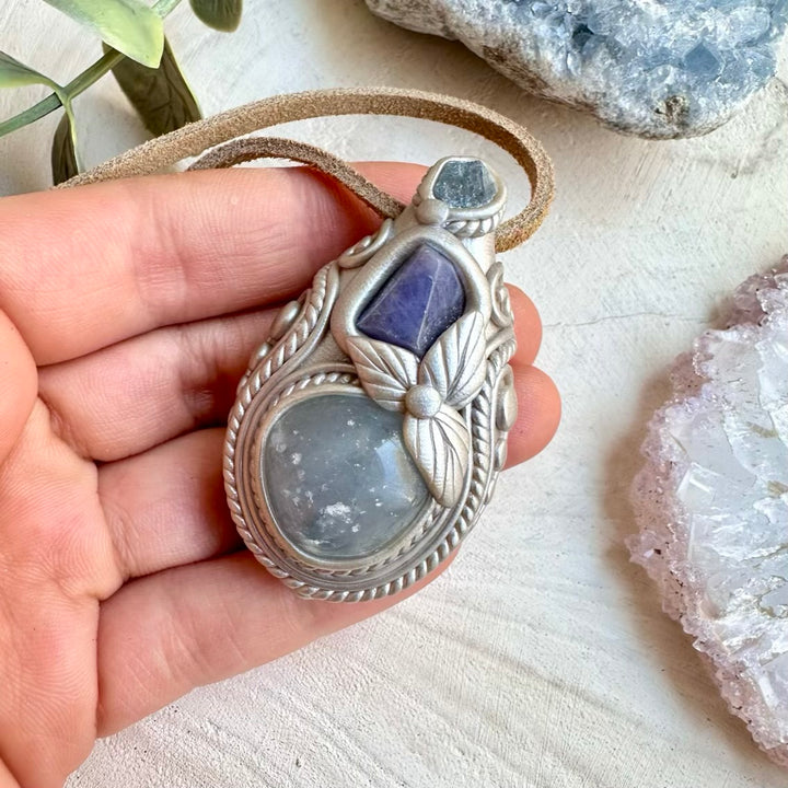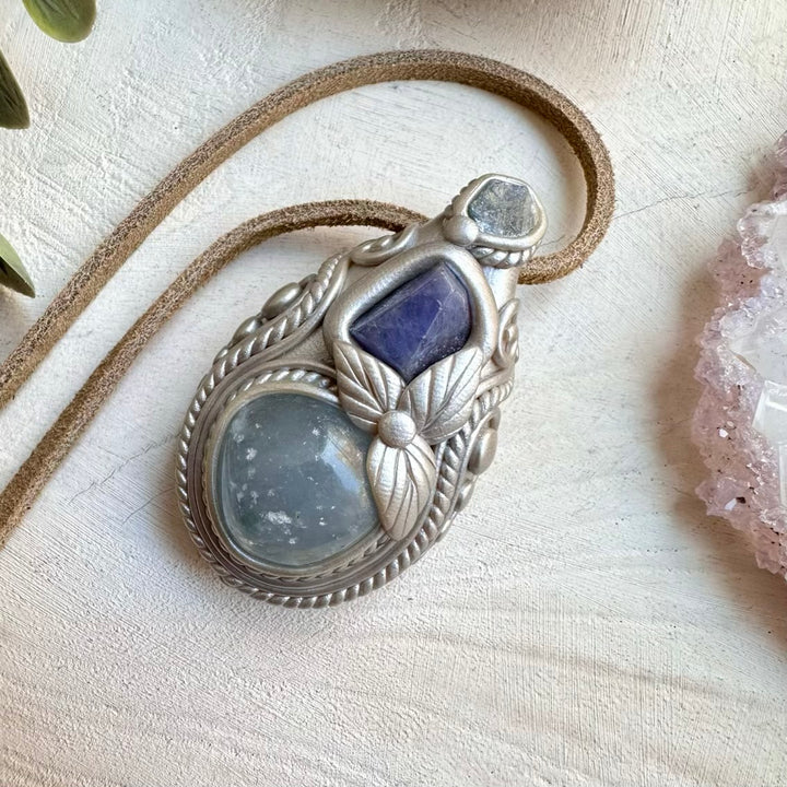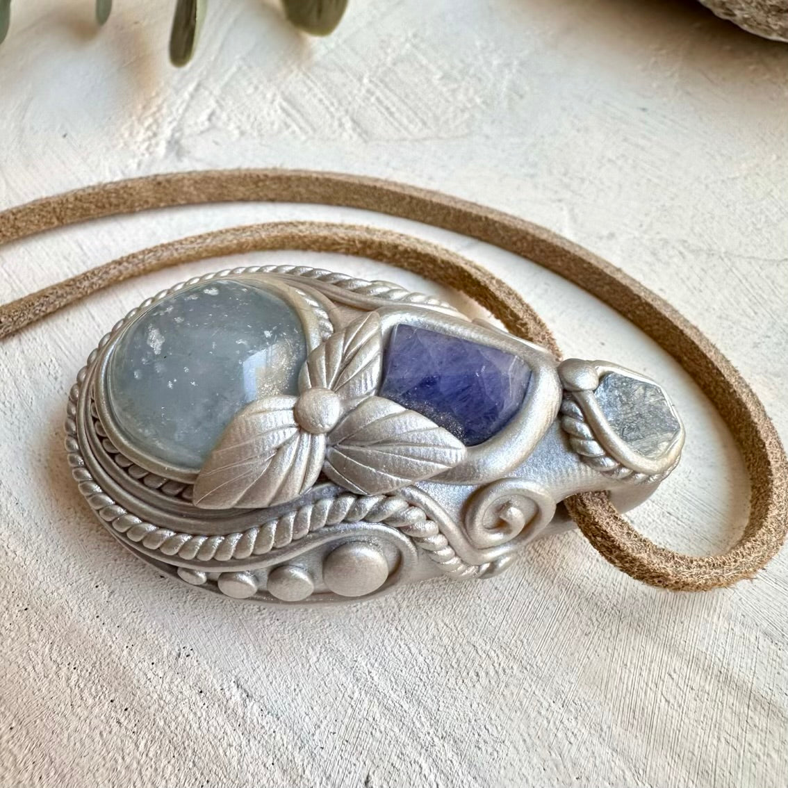 Fragile handcrafted elements. Polymer clay details, handcrafted mounts, metal components, and crystal settings can break if bent, dropped, or exposed to force. Please handle with care.