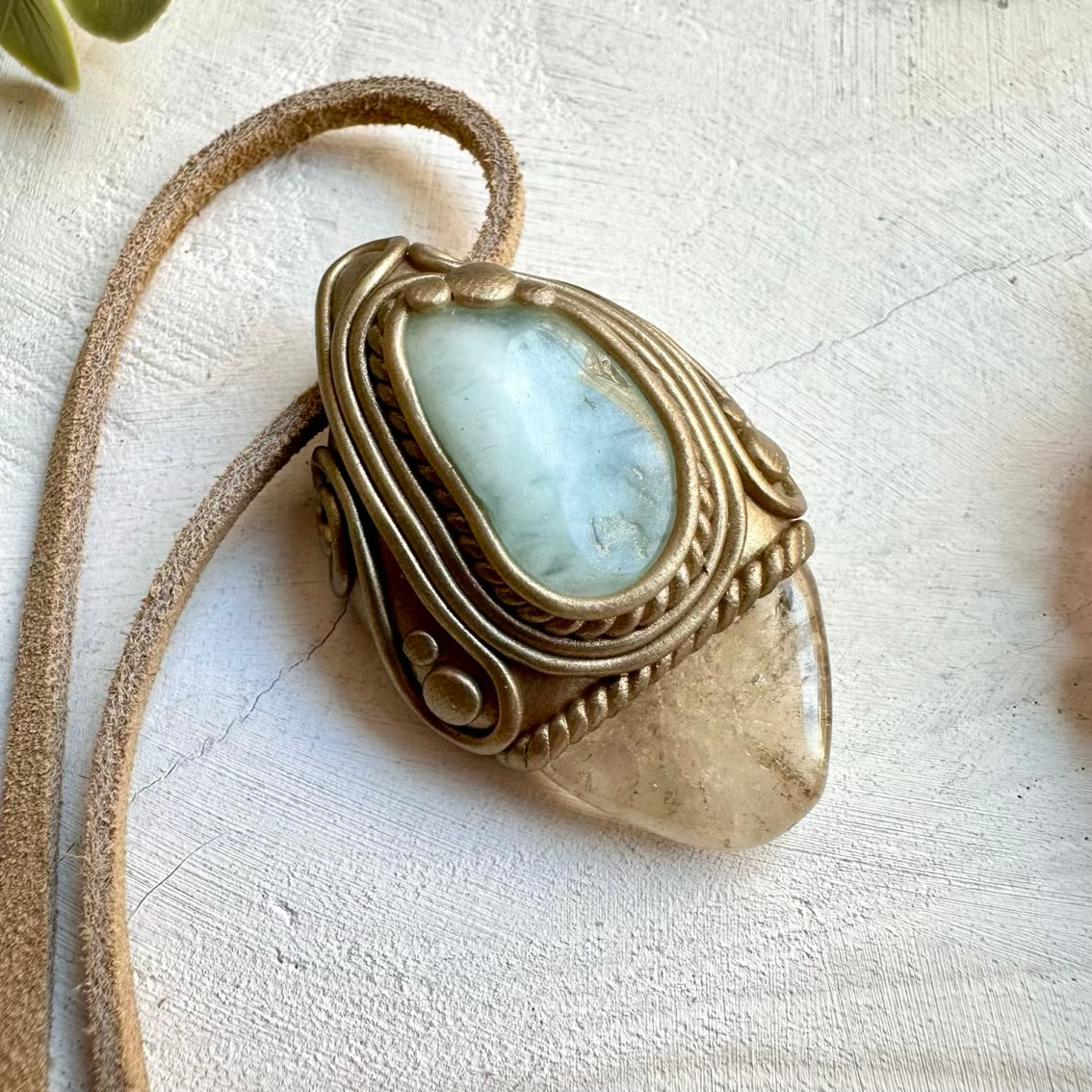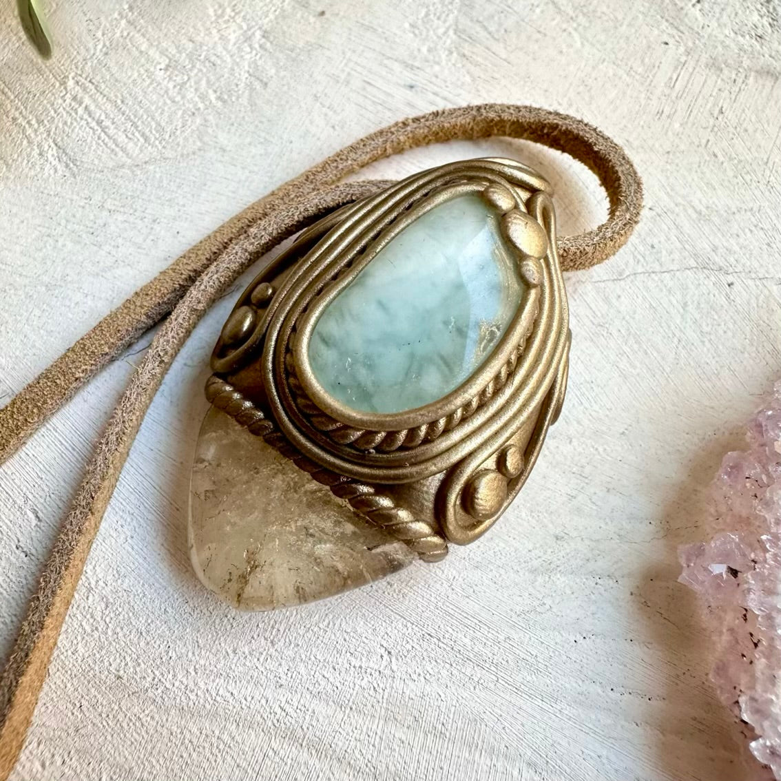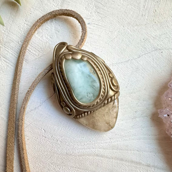 The Citrine and Aquamarine Pendant, Gemstone Necklace is made with durable clay and it comes with adjustable leather cord.